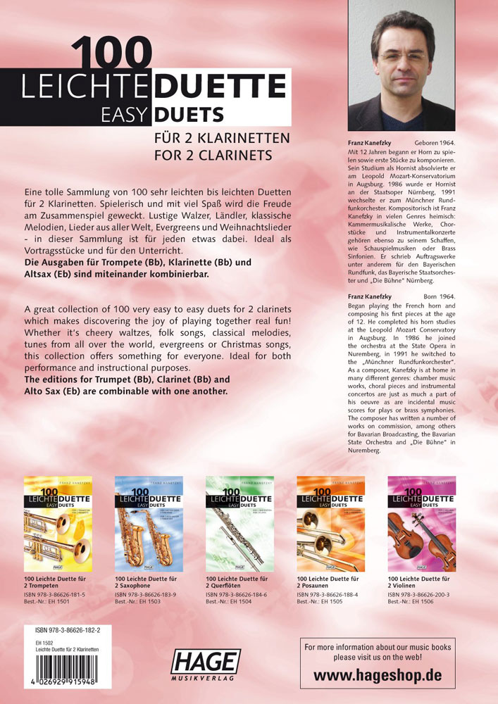100 leichte Duette für 2 Klarinetten, Autor: Franz Kanefzky, Eine tolle Sammlung von 100 sehr leichten bis leichten Duetten für 2 Querflöten. Spielerisch und mit viel Spaß wird die Freude am Zusammenspiel geweckt. Lustige Walzer, Ländler, klassische Melodien, Lieder aus aller Welt, Evergreens und Weihnachtslieder - in dieser Sammlung ist für jeden etwas dabei. Ideal als Vortragsstücke und für den Unterricht.