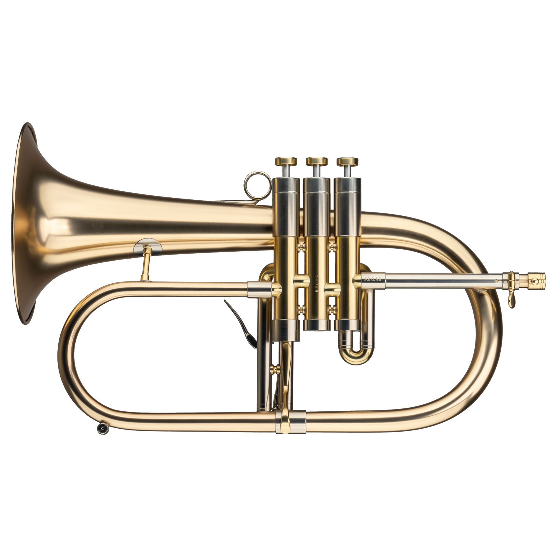 ADAMS-Flügelhorn F2 matt, Custom Series, das Flügelhorn F2 ist der schwere Bruder des F1, Goldmessingschallstück, ebenfalls mit ML-Bohrung, jedoch nur mit einem Schalldurchmesser von 170 mm und einer schweren Messing-Ventilsektion von 535 Gramm. Das Instrument verfügt über Standard-Design-Fingerknöpfe aus Honduras Rosewood. Eine großartige Wahl für Spieler, die ein schwereres Spielgefühl und eine großes Schallstück bevorzugen. Schall: Goldmessing-Neusilber - 170 mm Bohrung: ML 10.5 Materialstärke: 0,45mm Finish: matt Lackiert