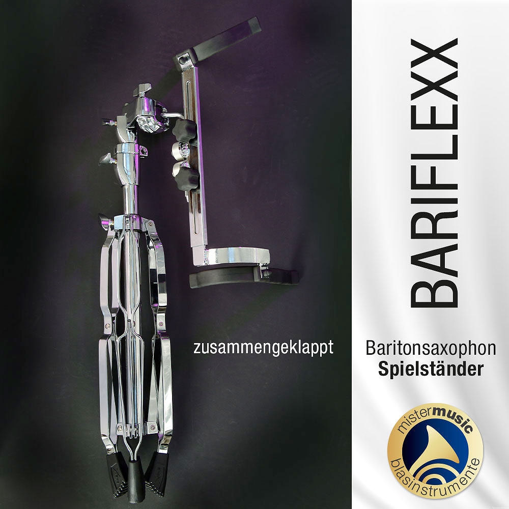 BARIFLEXX Baritonsaxophon Spielständer Zusammenklappbarer Spielständer für alle Baritonsaxophone, Tief A und Tief Bb, Ständer aus Stahlrohr, verchromt Füße aus doppelstrebigem Stahl sorgen für stabilen Stand, Gummiummantelte Auflagebügel garantieren freies Schwingen des Instruments und optimalen Halt, Höhe auf jeweilige Spielposition, einfach verstellbar Spielhöhe: Zum Spiel im Sitzen und im Stehen - auch für große Personen geeignet, Höhe zusammengeklappt: 75 cm, Breite zusammengeklappt: 25 (breiteste Stelle) cm, Gewicht: 5,4 kg, mit Tragetasche