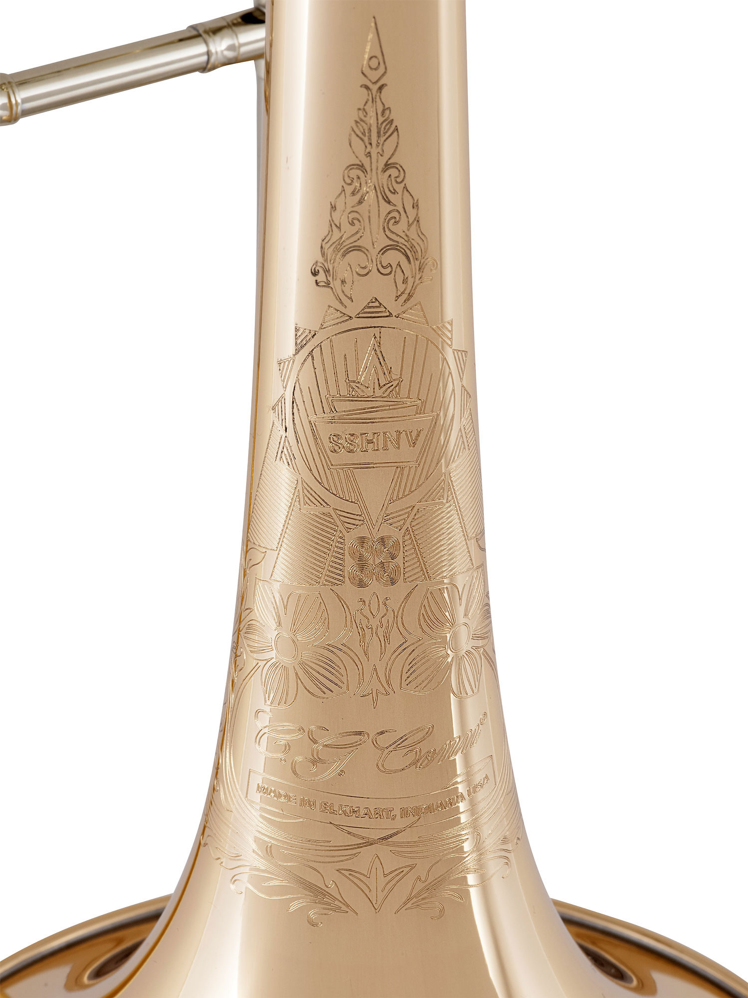 CONN-Posaune 88HNV -New Vintage-, Bohrung 13,89 mm (0,547 inch), 216 cm (8,5 inch)-Goldmessingschallstück, leightweight Schallstück im Vintage-Stil, Neu gestaltete F-Schlaufe mit open-wrap, Bohrung F-Quartventil 14,27 mm (0,562 inch), Außenzug aus Goldmessing, Verchromter Innenzug, Neusilber Handgriffe & Streben, Kegelförmiges Zylinderventil, Ergonomischer Daumendrücker aus Palisanderholz, Neuer einteiliger Ventilhebel Mechanisches Kugelgestänge aus Edelstahl, Kunst-Gravur, Conn 5G Mundstück, Leichtes Slim-Style-Etui, Hergestellt in den Vereinigten Staaten in Elkhart, IN Als Hommage an die alte Conn 88H wurde der klassische Klang und das Spielgefühl der frühen Elkhart-Modelle mit modernen Funktionen und Design kombiniert, um ein atemberaubendes Beispiel für Ausgewogenheit und Schönheit zu schaffen. Die 88HNV ist eine Verjüngungskur für die klassische Posaune, beginnend mit dem traditionellen Schallstück aus Goldmessing, das den Schallstückgewichten der frühen Modelle nachempfunden ist. Die einzigartige Bauart der Ventischlaufe bietet die Ausgewogenheit und das Spielgefühl traditioneller Vintage-Modelle, verwendet aber einen modernen Ansatz für das Open-Wrap. Dies trägt dazu bei, eine gleichmäßige Balance über den gesamten Tonumfang zu schaffen. Zu den weiteren Merkmalen gehören ein überarbeiteter Ventilhebel und ein Daumendrücker aus Palisanderholz, die ein ergonomischeres Spielgefühl vermitteln. Die atemberaubende neue Gravur durchwebt vier Epochen der Conn-Geschichte. Die verchromten Neusilber-Züge in Kombination mit dem standardmäßigen Außenmaterial aus Goldmessing sorgen für einen warmen, resonanten Klang und eine sanfte Mechanik. Die C.G. Conn 88HNV ist eine professionelle Posaune, die sich sowohl für symphonische als auch für solistische Einsätze eignet. Neuer Schallbecher im Vintage-Stil, neu gestaltetes Ventilgehäuse, aktualisierter Hebel und ergonomisches Holz-Daumendrücker, schöne Gravur, die 4 Epochen der Conn-Geschichte hervorhebt, leichtes, schlanker Koffer