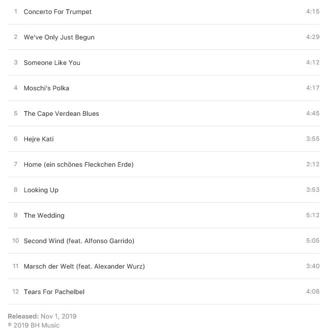Da Blechhauf'n CD-Christoph Moschberger & Da Blechhauf'n -Home- 1. Concert for Trumpet-Comp.: Hauury James 2. We`ve Only Just Begun-Comp: Frank Williams 3. Someone Like You-Comp: Frank Wildhorn 4. Moschi´s Polka-Comp&Arr: Albert Wieder 5. The Cape Verdean Blues-Comp: Horace Silver 6. Hejre Kati-Comp: Jenö Hubay 7. Home (Ein schönes Flecken Erde)-Comp: Ladislav Kubes 8. Looking Up-Comp: Michael Petrucciani 9. The Wedding-Comp: Abdullah Ibrahim 10. Second Wind-Comp: Rebeca Mauleón-SAntana 11. Marsch der Welt-Comp&Arr: Albert Wieder Bonus Track: Tears for Pachelbel (Live Studio Session)-Comp: Eric Clapton