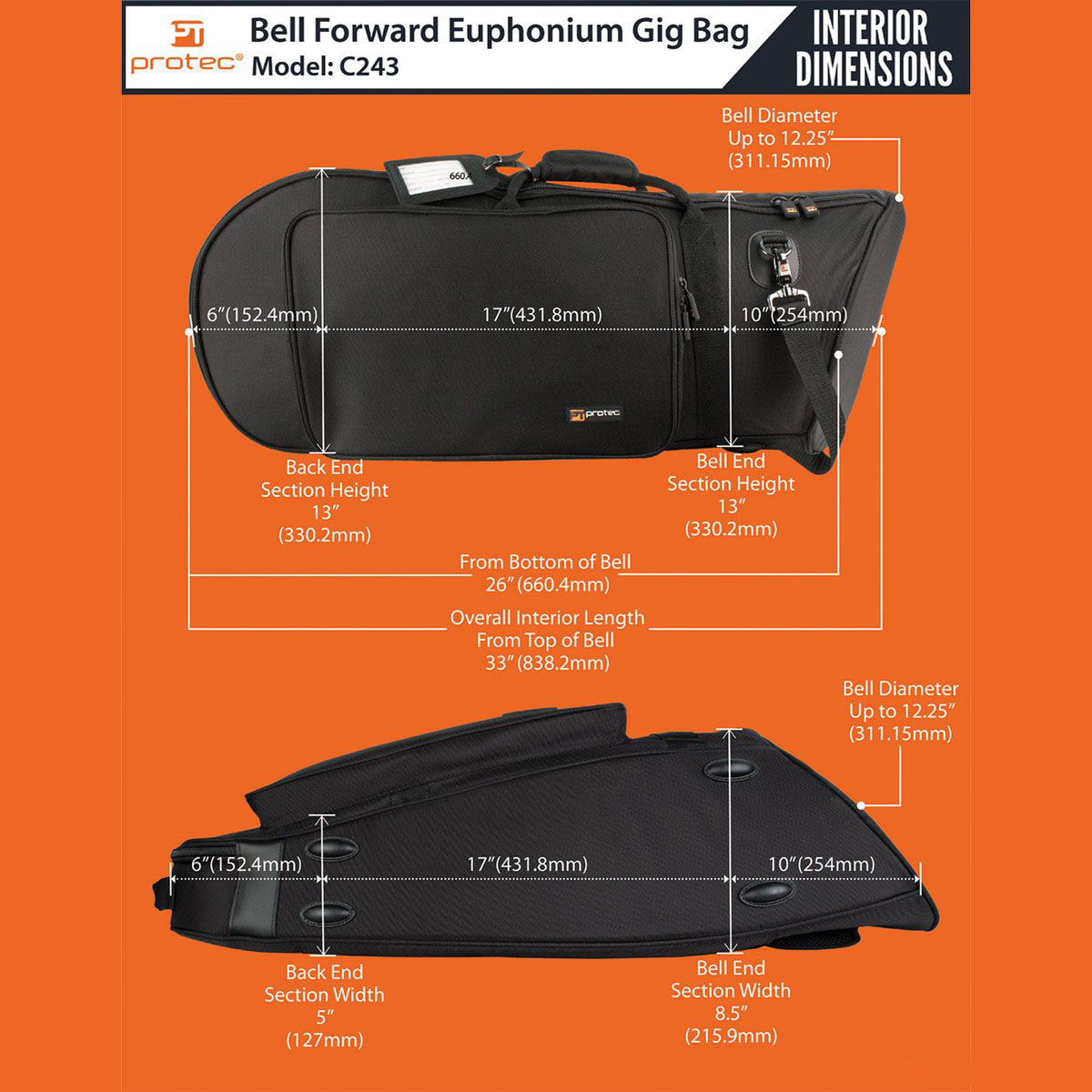 PRO TEC-Case für Bell Front Euphonium C 243, schwarz, Deluxe Gigbag, mit Tragegriff, Schultergurt, große Außentasche mit Organizer, 30mm starke Polsterung, extra geschützter Schallbecherbereich, integrierte Rucksackriemen