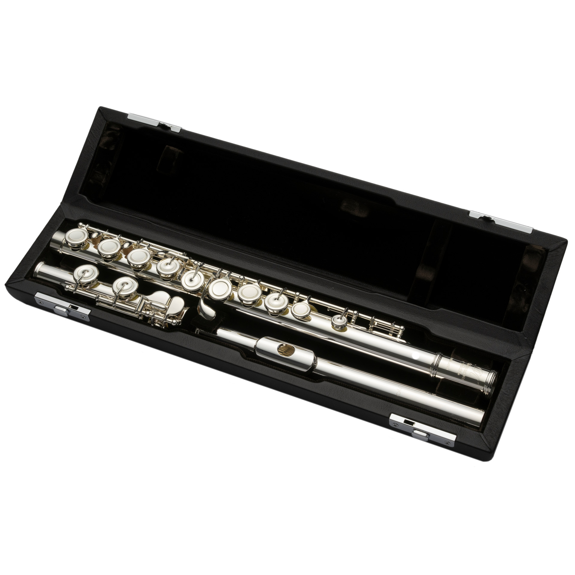 MIYAZAWA Flöte PB 102, versilbert, handgefertigte Neusilberflöte mit Mundlochplatte, Kamin aus massivem Sterling Silber. Mechanik und Oberfläche versilbert. Gezogene Tonlöcher, Klappenfedern aus Edelstahl. "partial Brögger"-stiftlose Mechanik für die Klappen