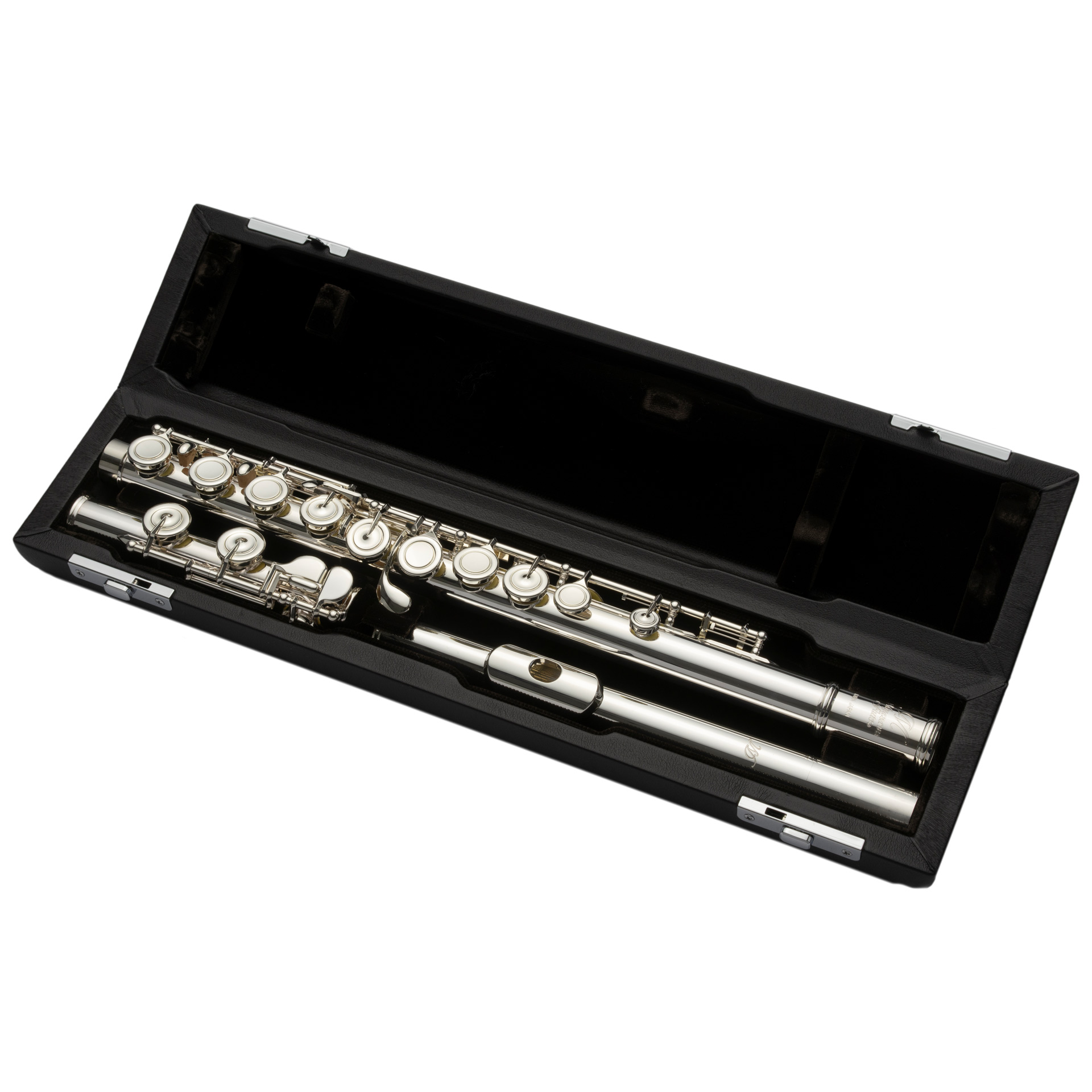 MIYAZAWA Flöte PB 202E, geschlossene Klappen, handgefertigte Neusilberflöte mit Kopfstück aus massivem Sterling Silber. Mechanik und Oberfläche versilbert. Gezogene Tonlöcher, Klappenfedern aus Edelstahl, "partial Brögger"-stiftlose Mechanik für die Klappen