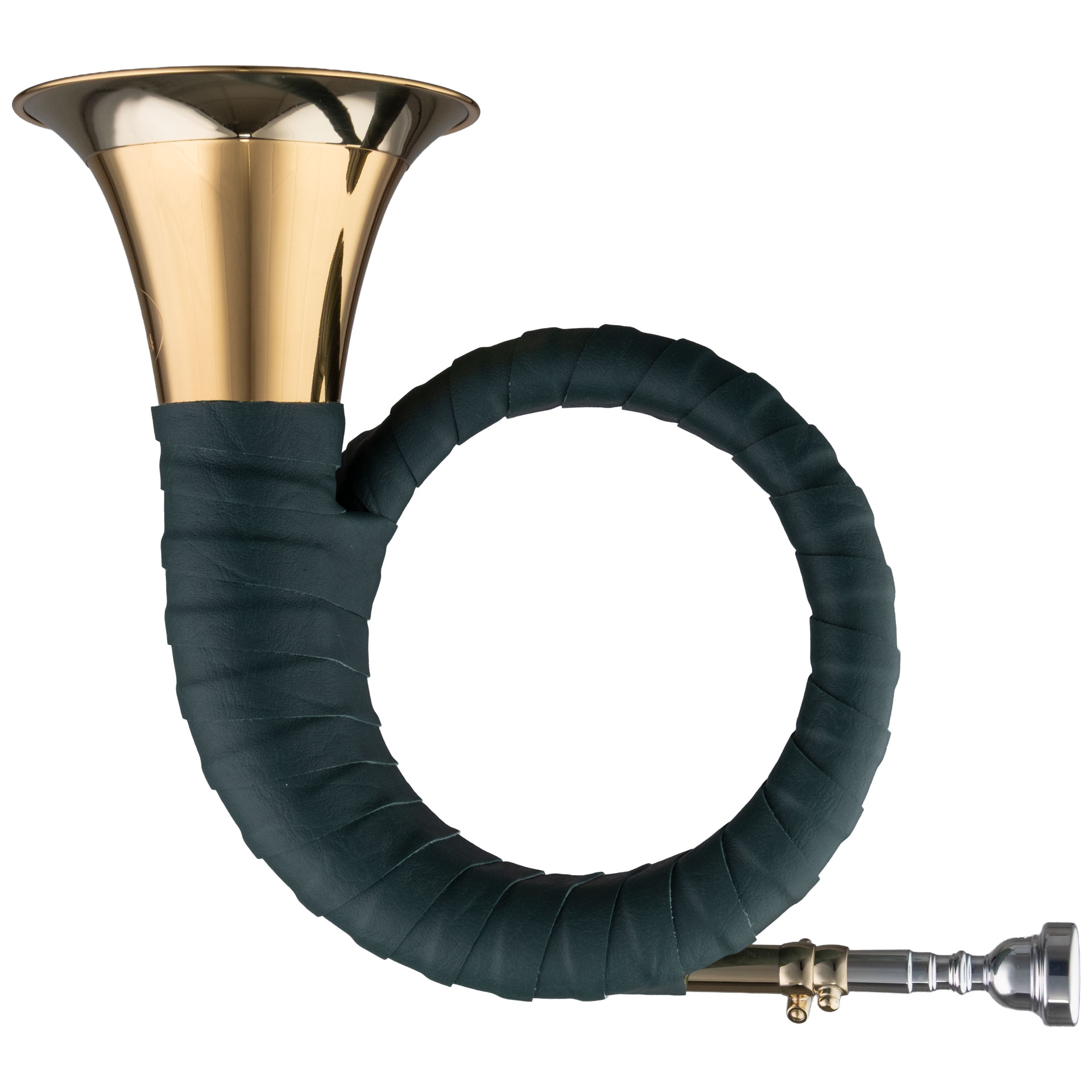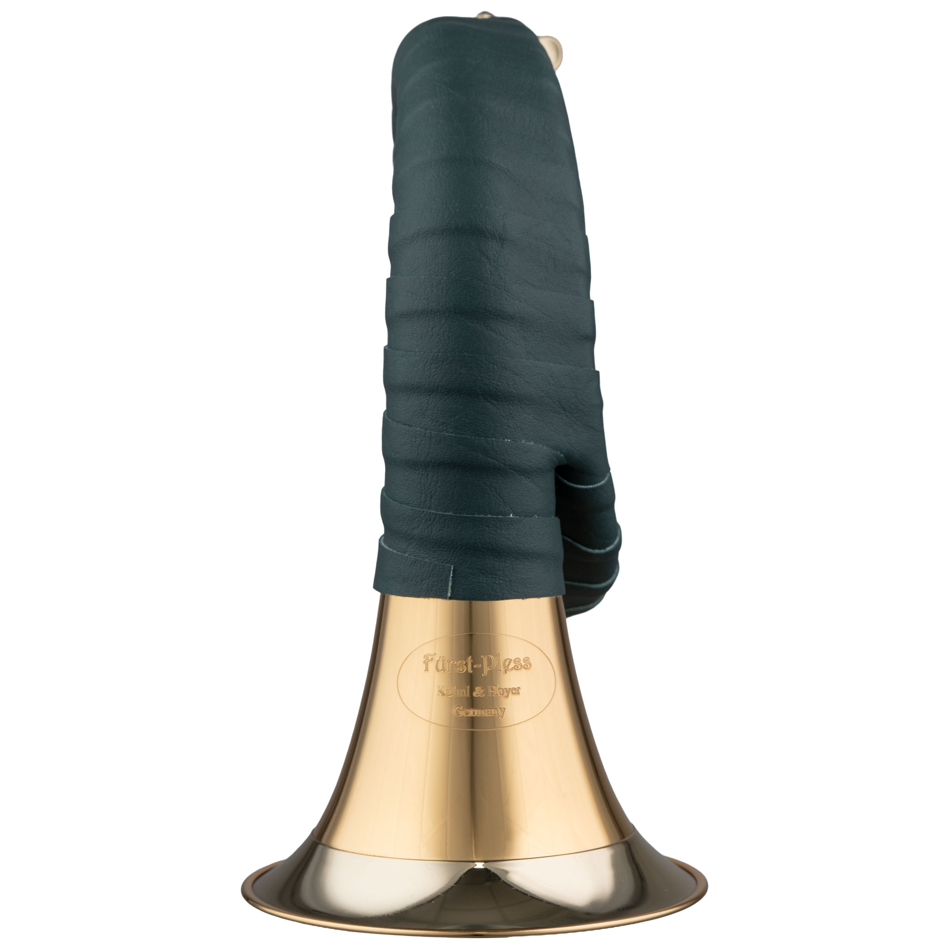 K&H-Fürst Pless Horn 40731 - 1344G, weite Mensur, ganz in Goldmessing, Stimmzug, mit Gravur -Fürst Pless-, ohne Emblem, Kunstlederumwicklung, Ledertrageriemen, Goldlack, mit Mundstück