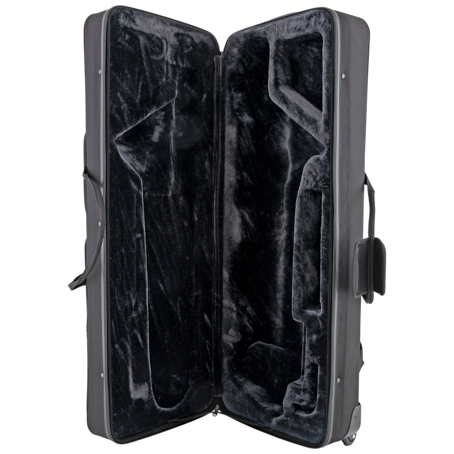 aS Leichtkoffer Bariton Saxophon -Black Design-, neues Design, 2 (zwei) Außentaschen, zusätzliche Fächer für Bleistifte, etc., schwarz gefüttert, stabiler Griff, integrierte Rucksackriemen, mit Rollen, für Bariton Saxophone bis tief A, Außenmaße 115x43x30 cm. Maße Außentasche 50x35 cm, m,it Rollen. Gewicht: 9,0 kg. Sehr attraktives Tri-color RETRO DESIGN. Stabile Rahmenkonstruktion. Außentasche. Gepolsterter Schulterriemen. Gepolsterte verdeckte Rucksackriemen. Hochfestes wasserabweisendes Nylongewebe. YKK Reißverschlüsse. Paspelierte Nähte. Stabile Metall-Karabinerhaken an allen Riemen. Instrumentenschützender Innenseinsatz in schwarz. 4 Abstellfüße an der unteren Stirnseite. Stabile, komfortable Griffe.