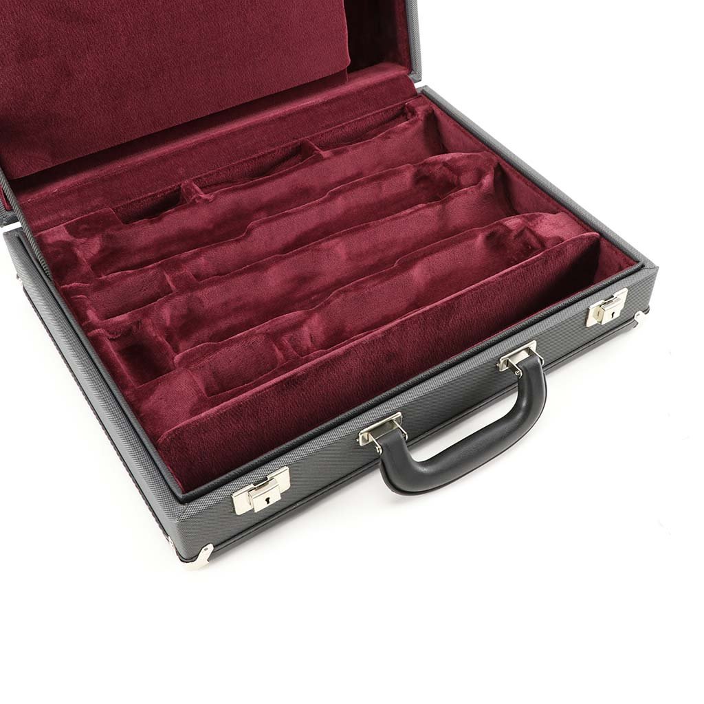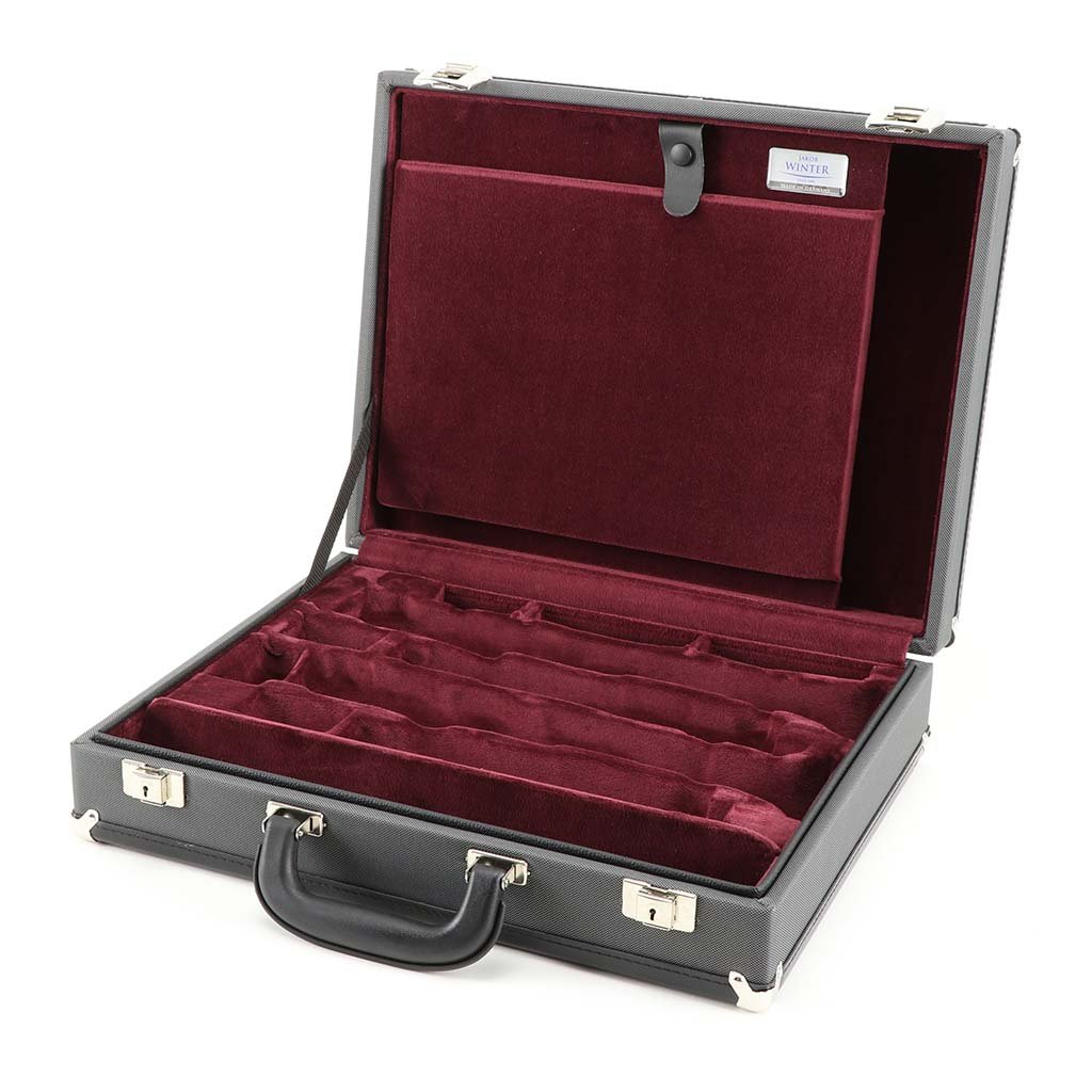 JAKOB WINTER double case 422B for A-and Bb-clarinets, Böhm- system This handmade, wood-constructed deluxe case gets its stability through its dove-tailed frame. The case is protected by a layer of high quality dark grey vinyl completed with protective massive silver plated metal corners. With optimal protection derived from the polysystrene system covered in red premium velveting is this material combination the perfect choice for the internal area of the case. This case also features spacious compartment that fits all accessories which makes it a highly sought-after alternative based on its stability and practicality. This case is compatible for a Bb-clarinet and a A-clarinet. Both clarinets have to be instruments with the Böhm- system. Weight: 2.35 kg