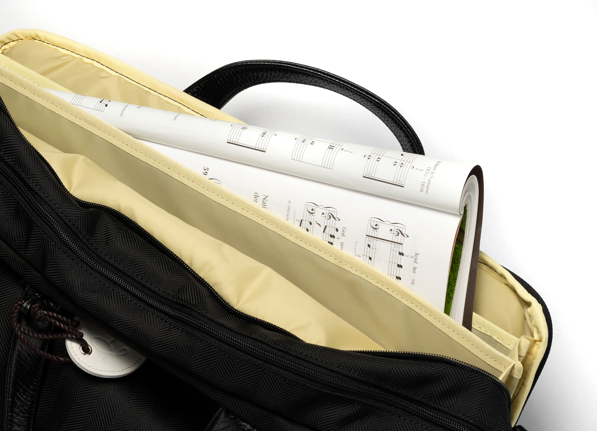 ROI 153 Flute Cover - black, the ROI 153 bag has several compartments that are equipped with zippers, large note compartment DIN A4, practical outer compartment for accessories, stowable backpack system, shoulder strap, lined on the inside and to protect the flute from cooling down, waterproof