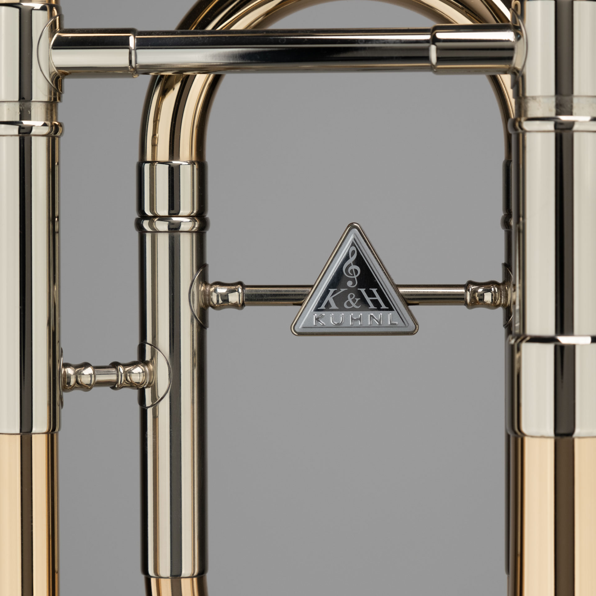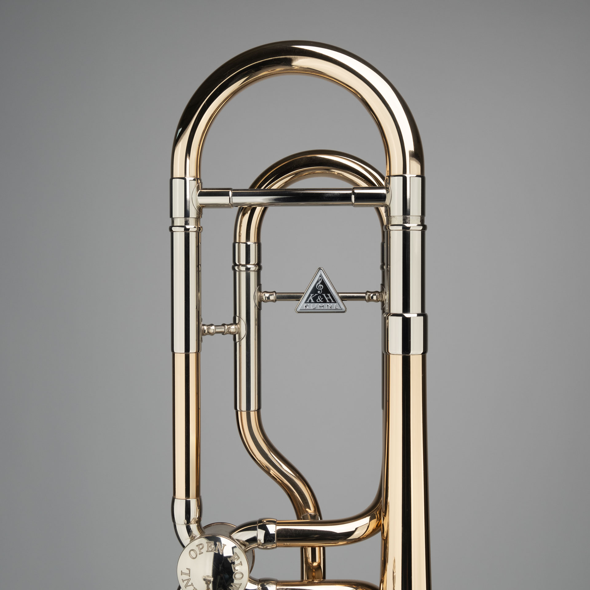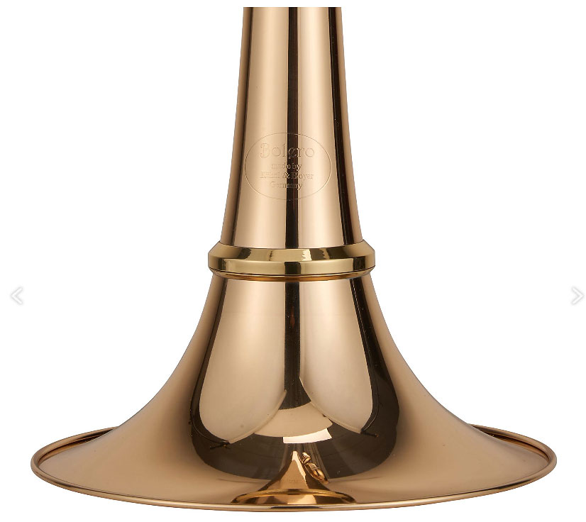 Bb/F-Tenor Trombone -Bolero traditional- with -open flow-valve - Model Manyak compact (traditional) wrap, gold brass, screw ring on the bell flare, bell diameter 220 mm (8.661 Inch), bore 13,9 mm (0.547 Inch), brass slide with exchangeable brass lead pipe, K&H-open flow-nickel silver rotary valve with light rotor, curved gripbrace on body and slide, multi-adjustable, comfortable trigger, clear lacquer, mouthpiece -Bolero-