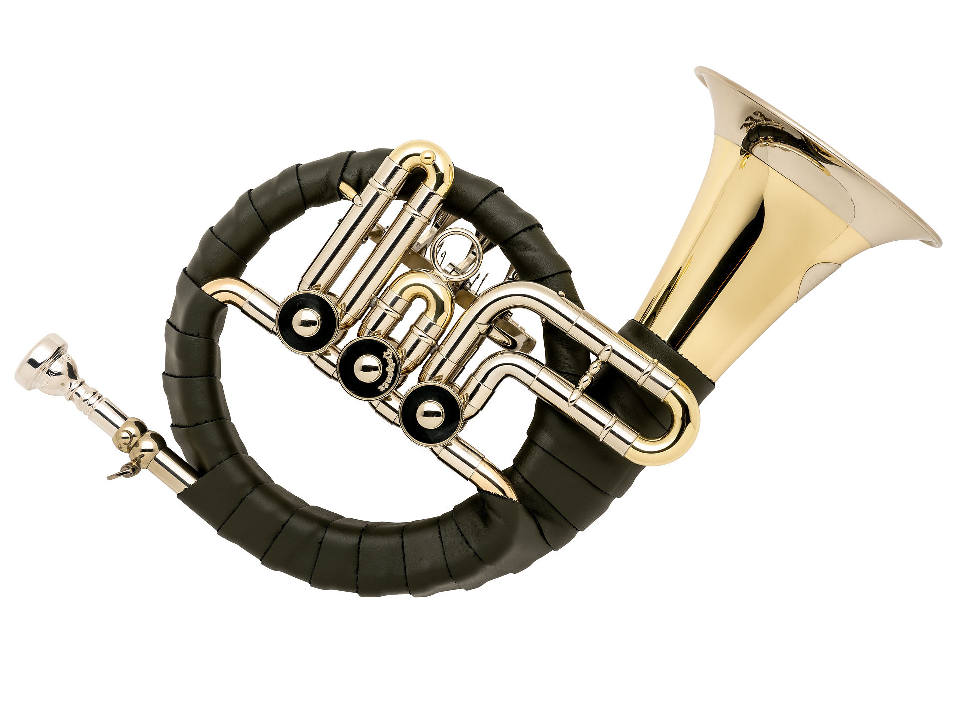 DOTZAUER- Hunting Horn 18915 *de Luxe* - 3 rotary valves, B-Flat, laquered, 3 rotary valves, green genuine leather wrapping, with tuning slide and leather strap, incl. Mouthpiece: Dotzauer 7C-FL