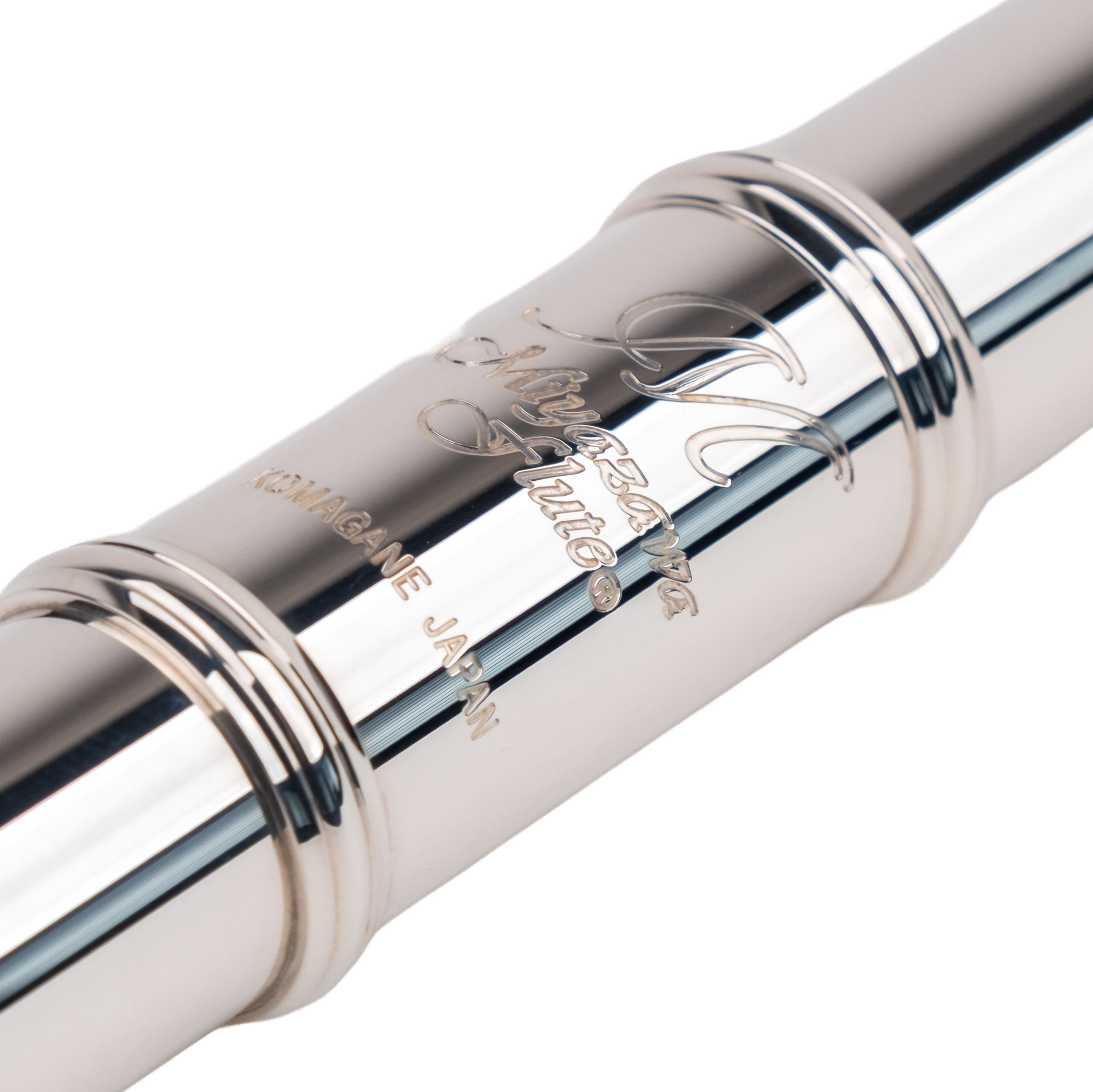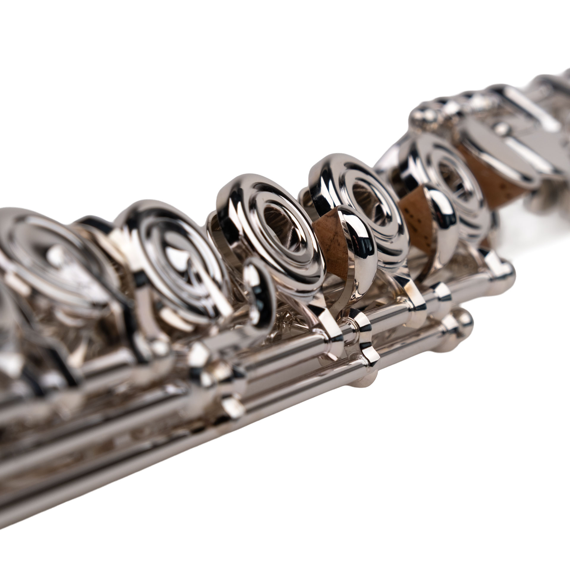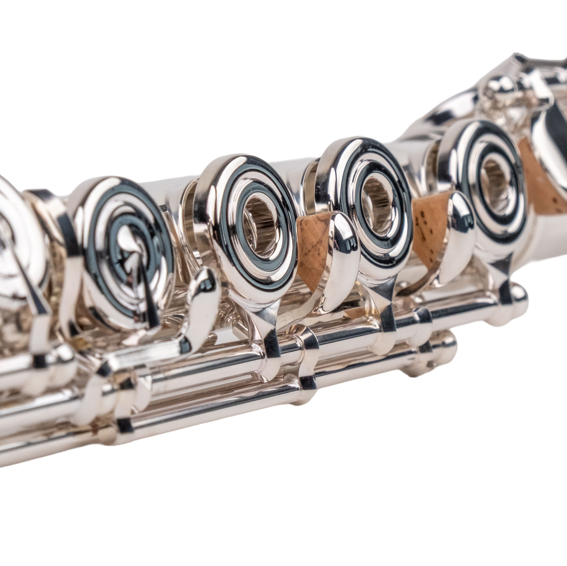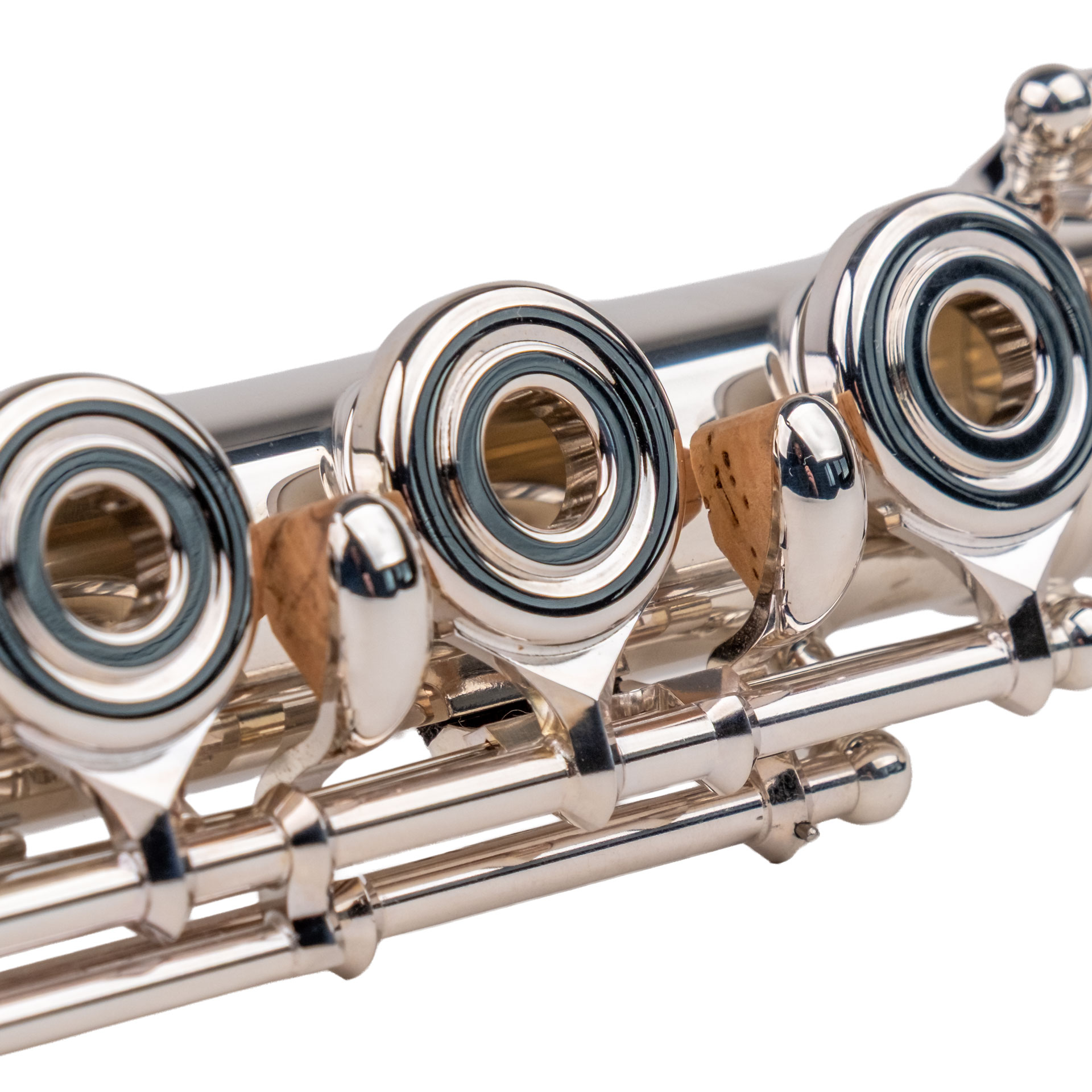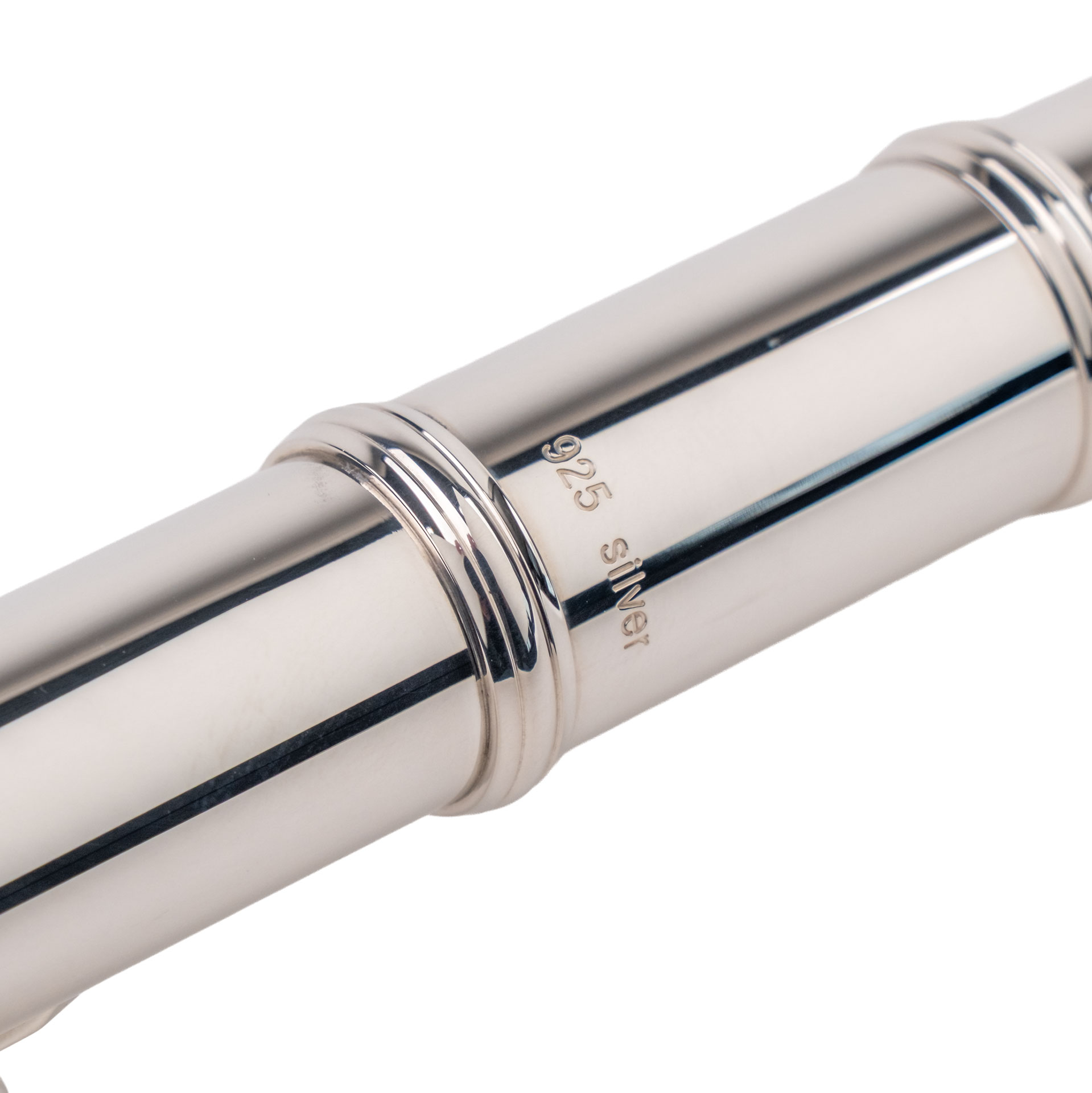 MIYAZAWA flute PB 402RE, ring keys, handmade flute with head, middle and foot joint made of solid sterling silver. Silver-plated mechanism. Drawn tone holes, stainless steel key springs, "partial Brögger" pinless mechanism for the keys