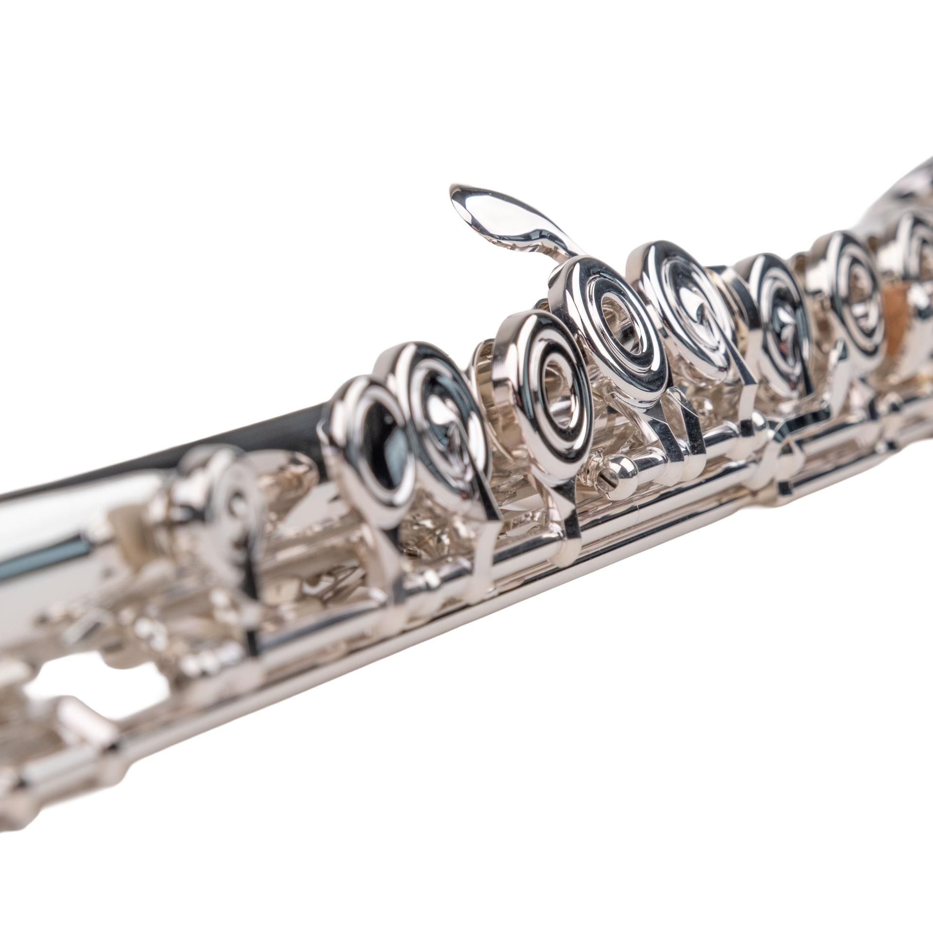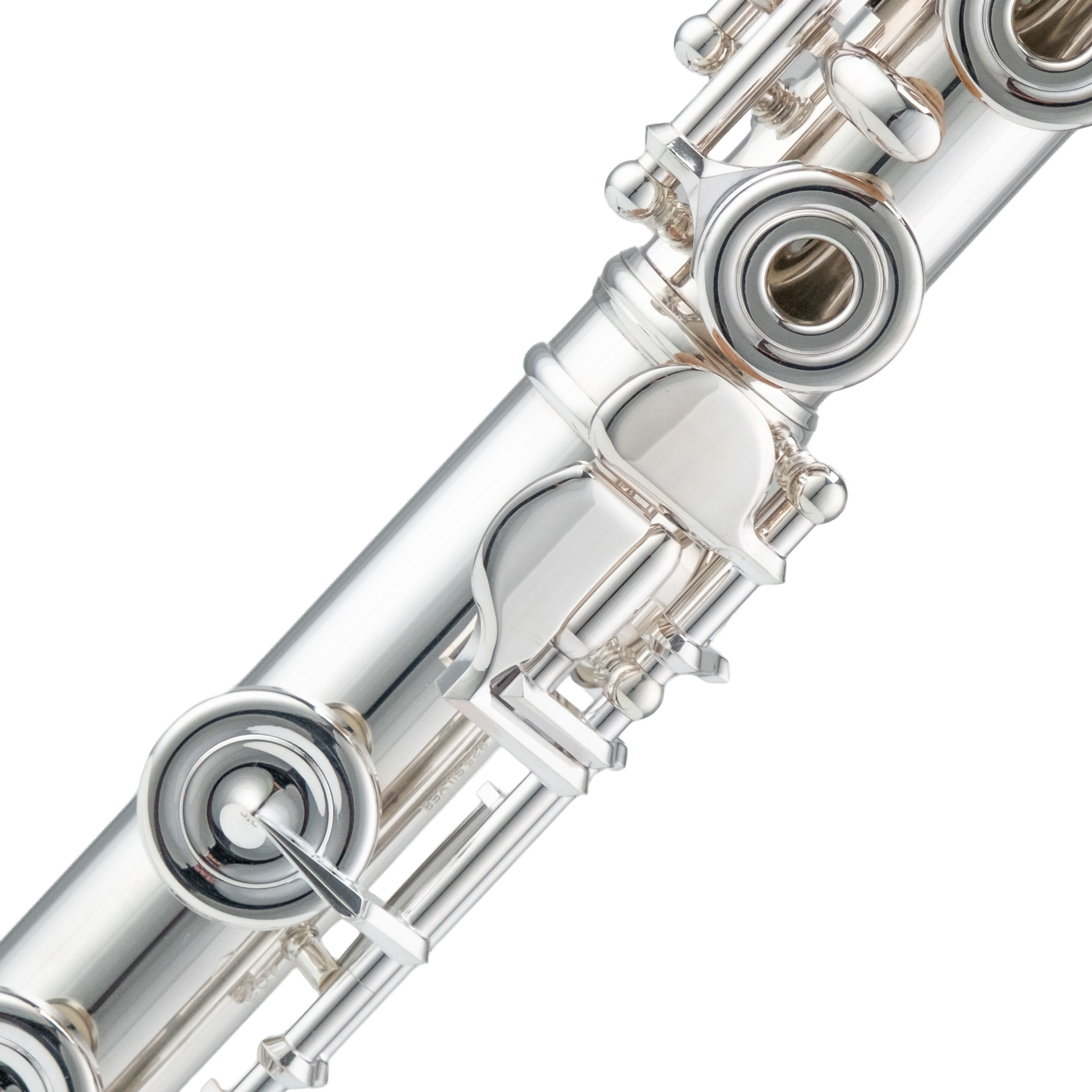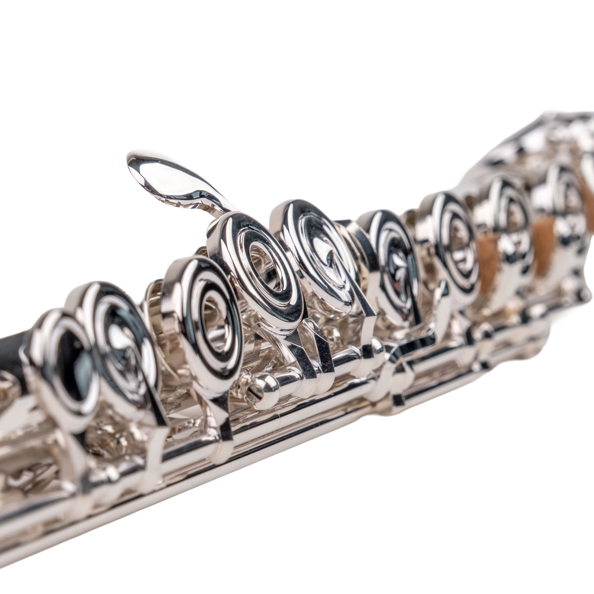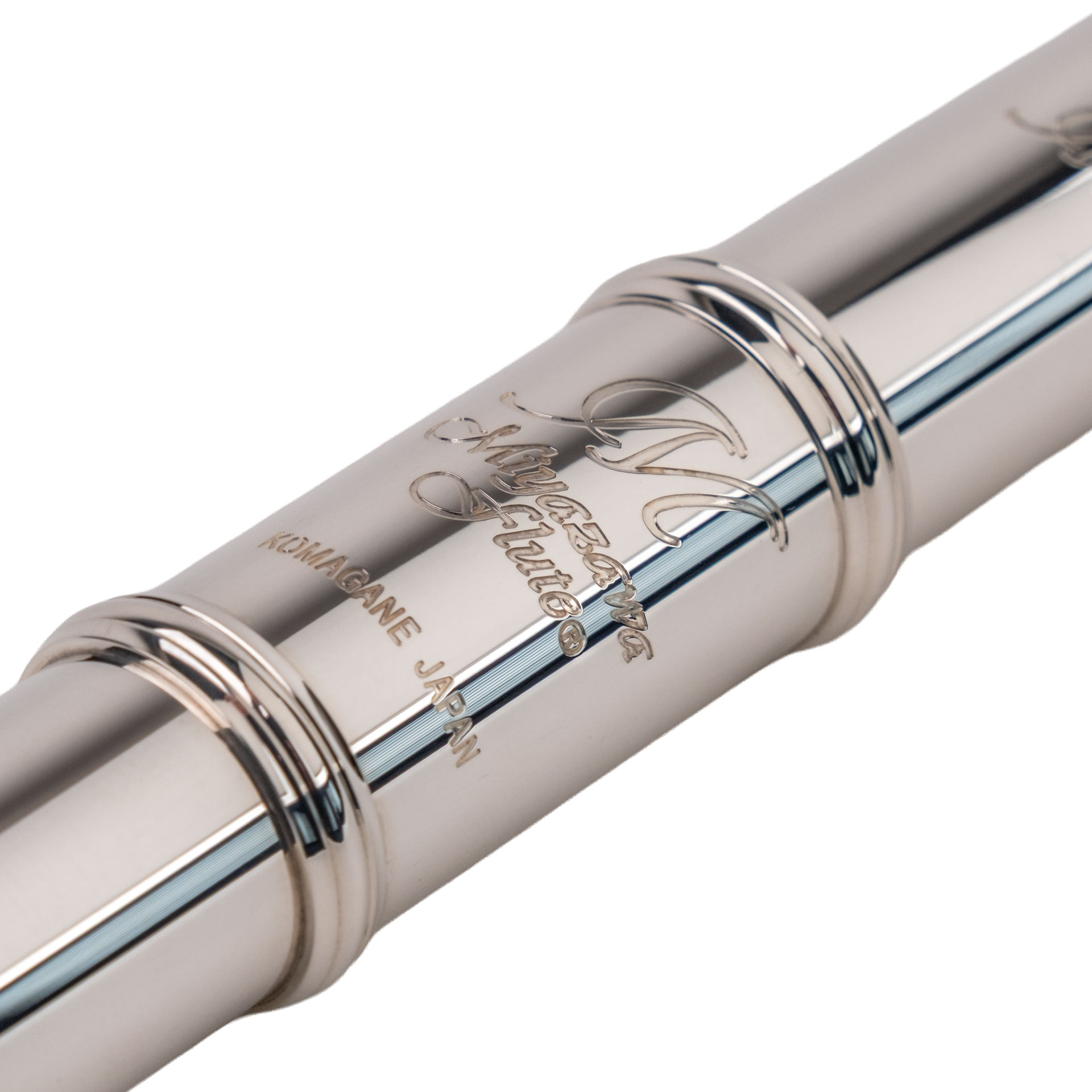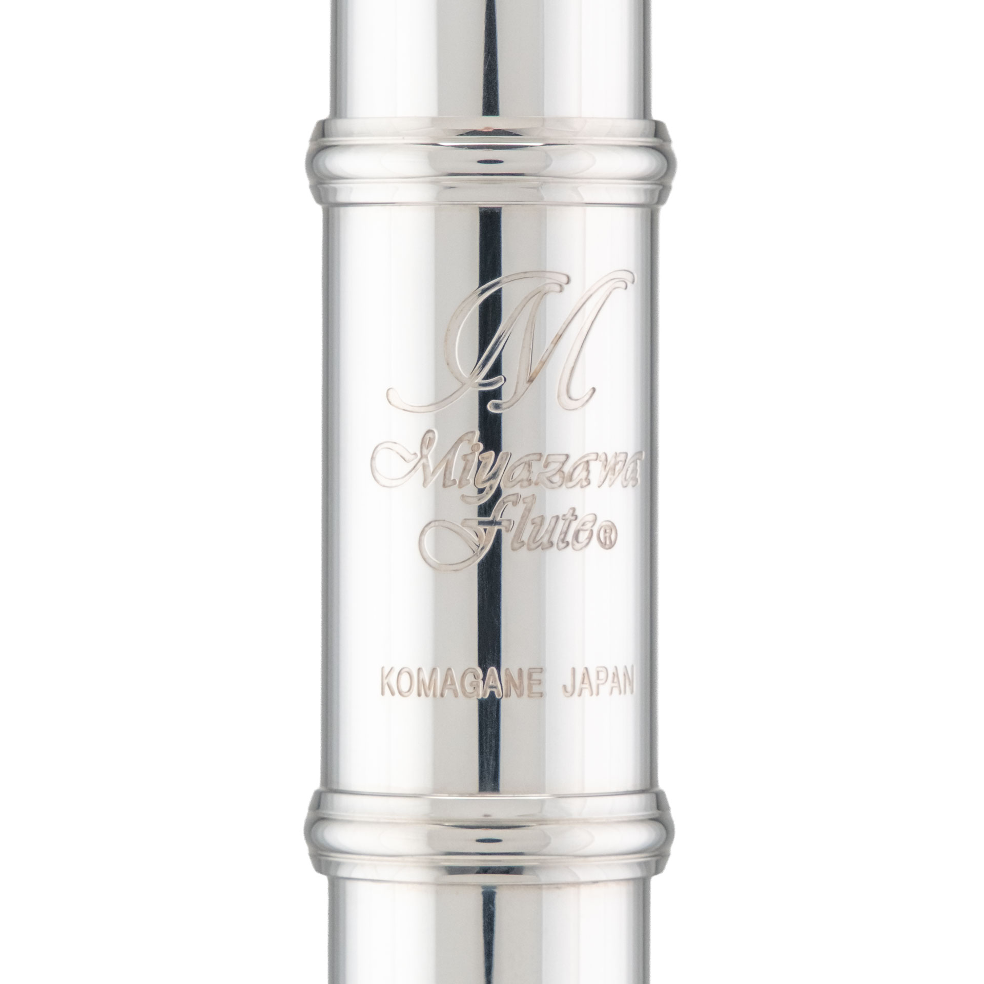 MIYAZAWA flute PB 402RE, ring keys, handmade flute with head, middle and foot joint made of solid sterling silver. Silver-plated mechanism. Drawn tone holes, stainless steel key springs, "partial Brögger" pinless mechanism for the keys
