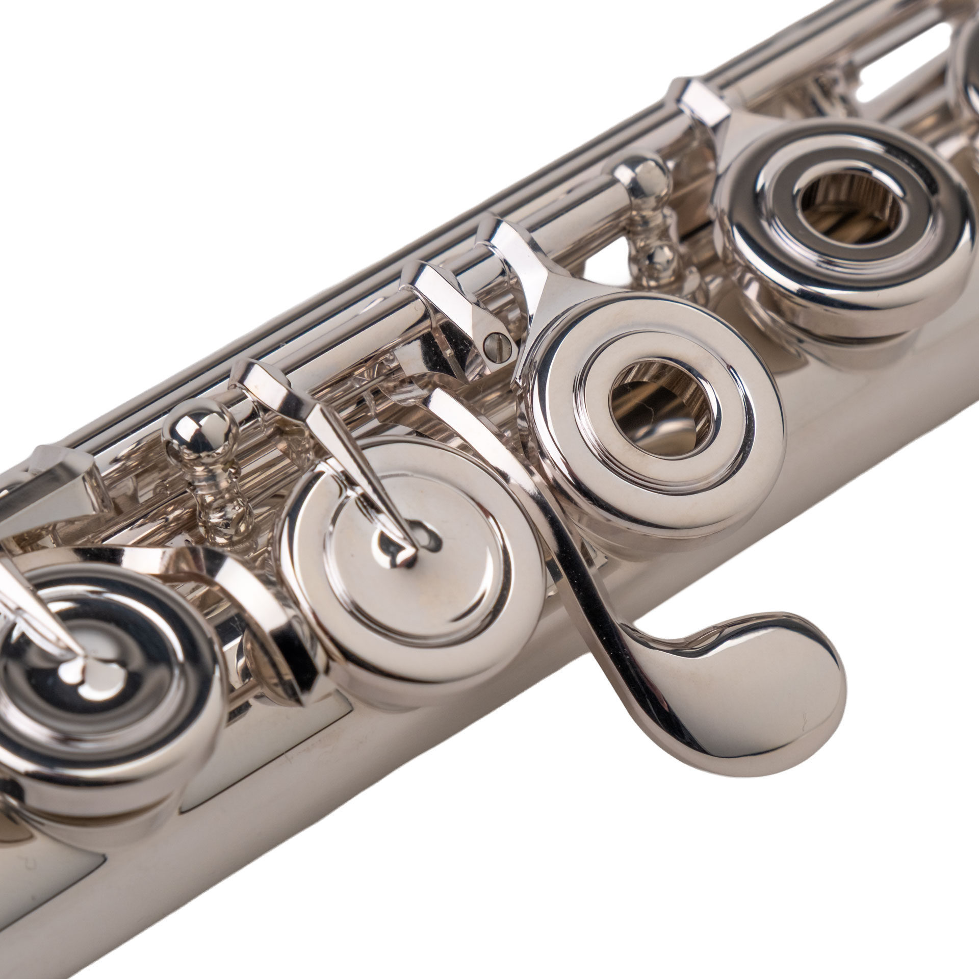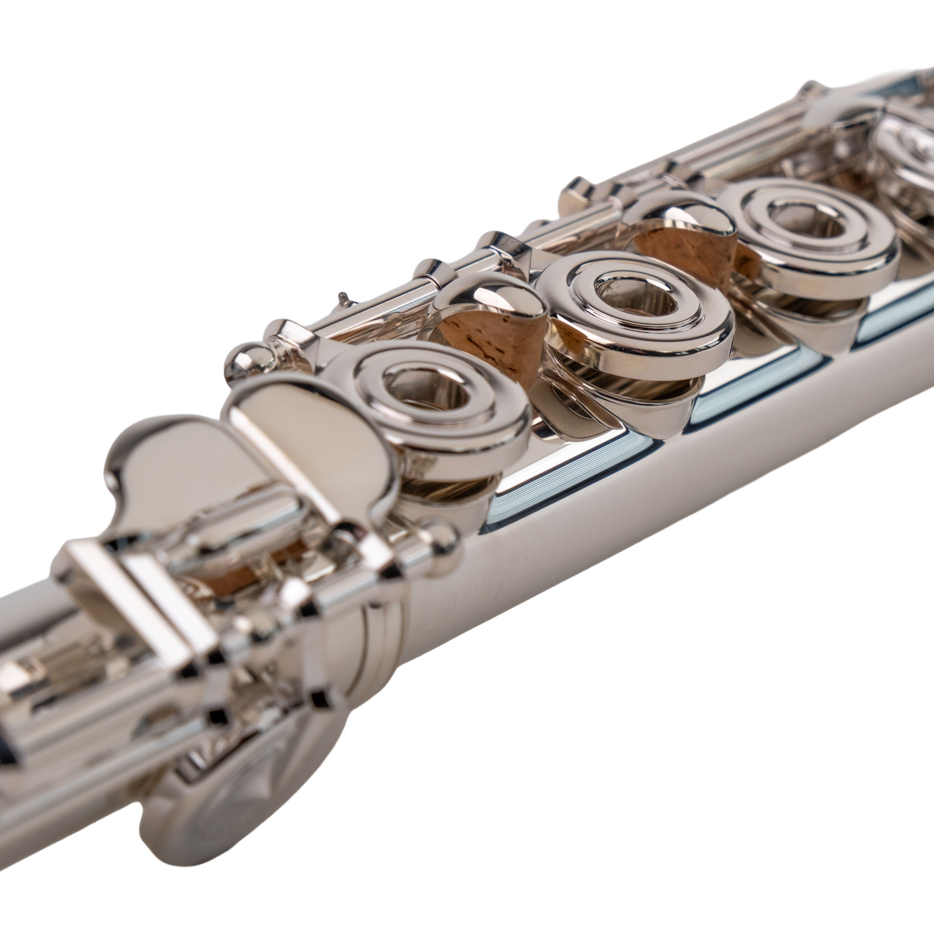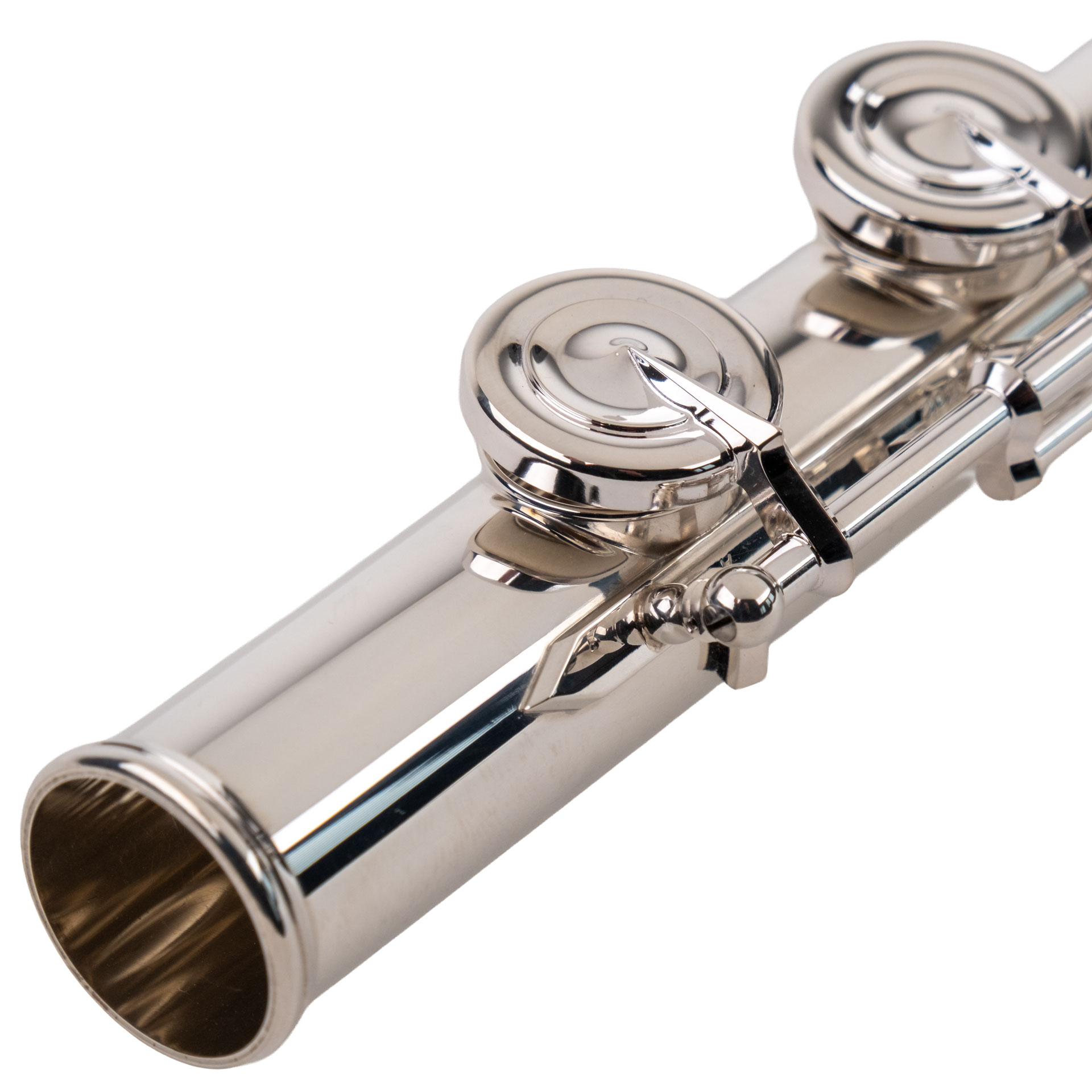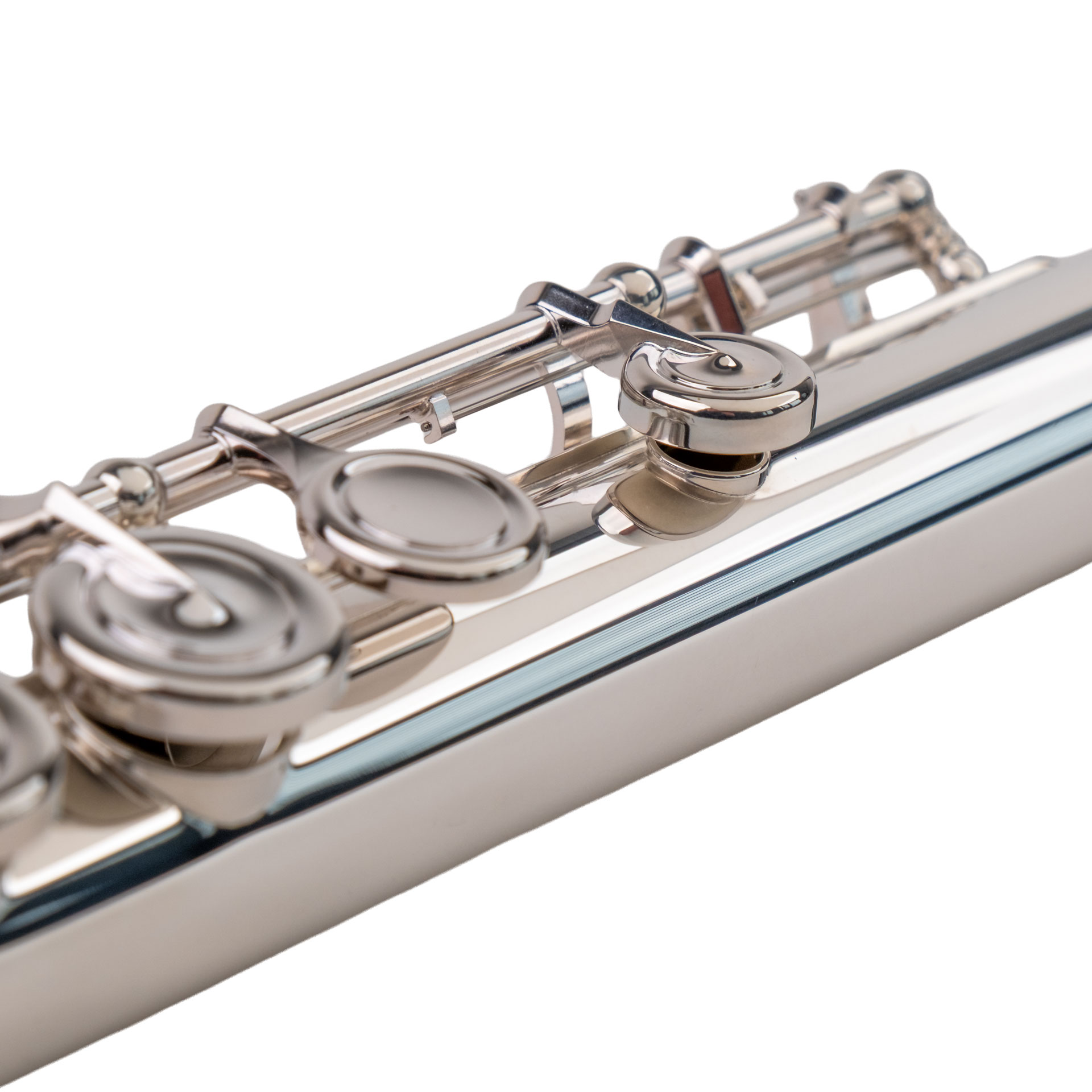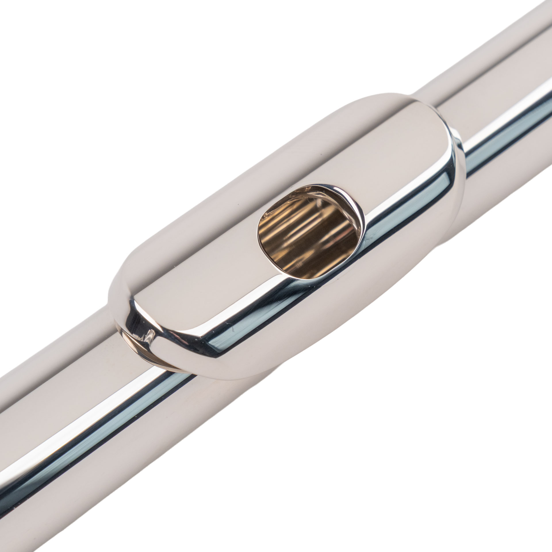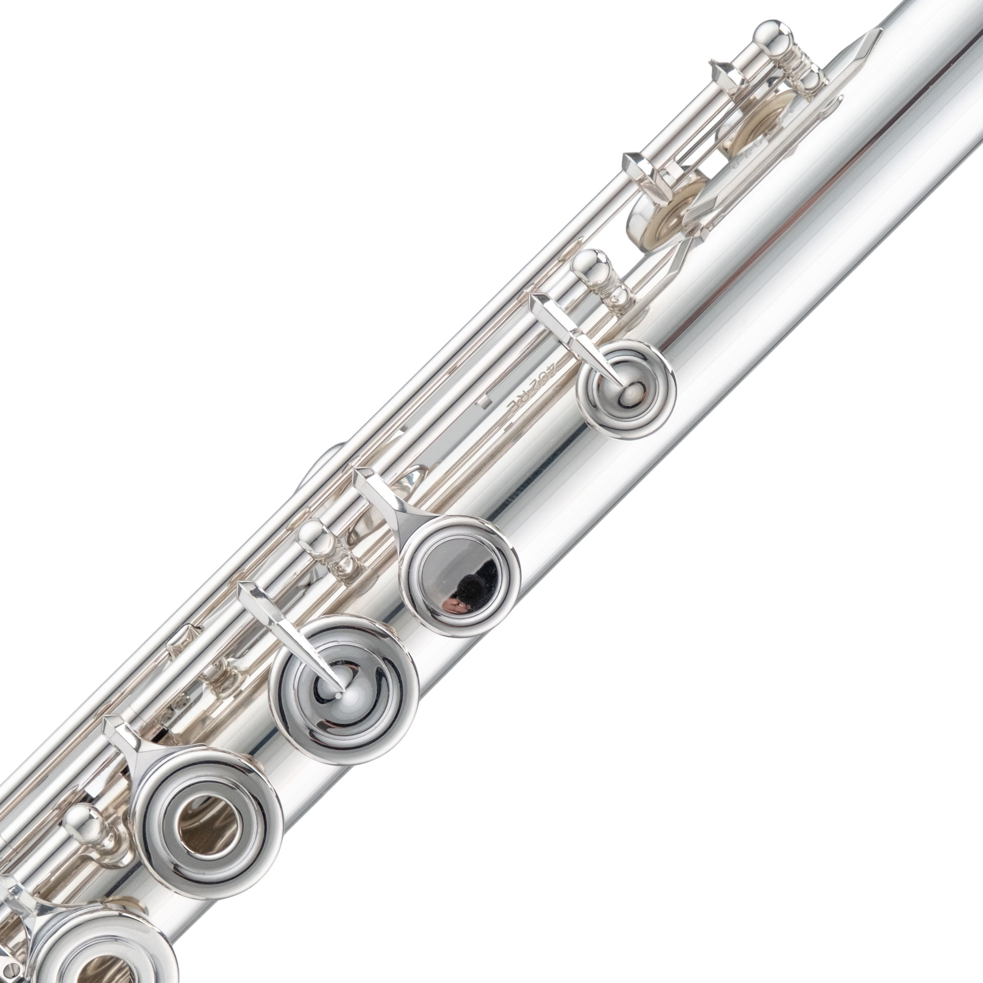 MIYAZAWA flute PB 402RE, ring keys, handmade flute with head, middle and foot joint made of solid sterling silver. Silver-plated mechanism. Drawn tone holes, stainless steel key springs, "partial Brögger" pinless mechanism for the keys