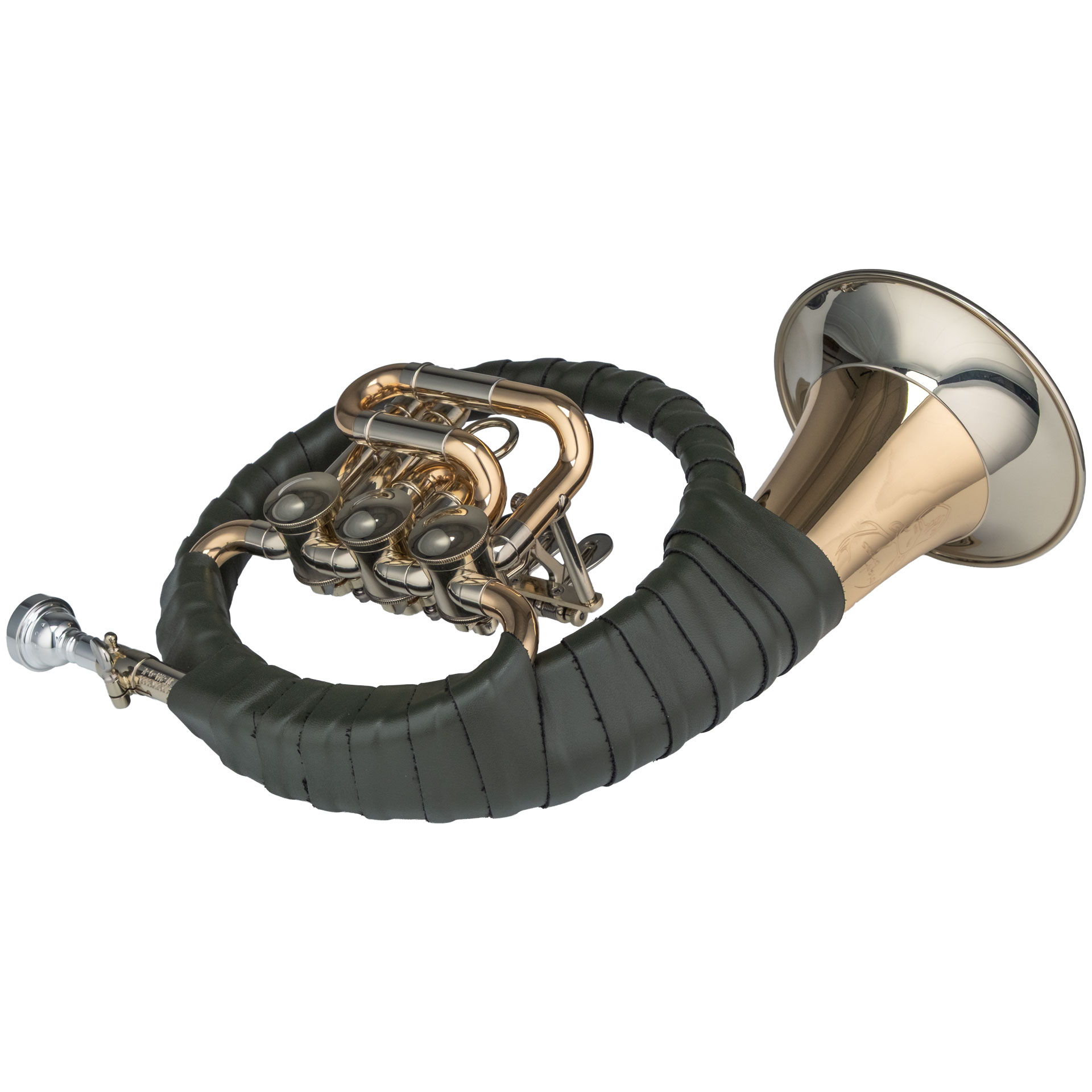 VOIGT BRASS-Hunting Horn JV-244-G-K gold brass, Nickel Silver Rim 3-valve Voigt rotarys, bore: 11.0 mm, spiral spring action with cranked push rods and Minibal ball joints, nickel silver leadpipe (clutch slide), genuine leather wrap, bell with stag engraving, genuine leather wrap, gig bag, silver-plated mouthpiece 1C, care products