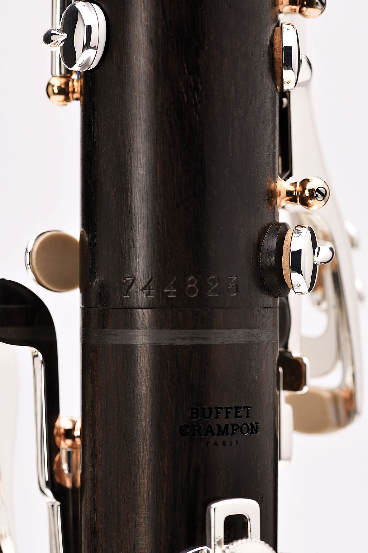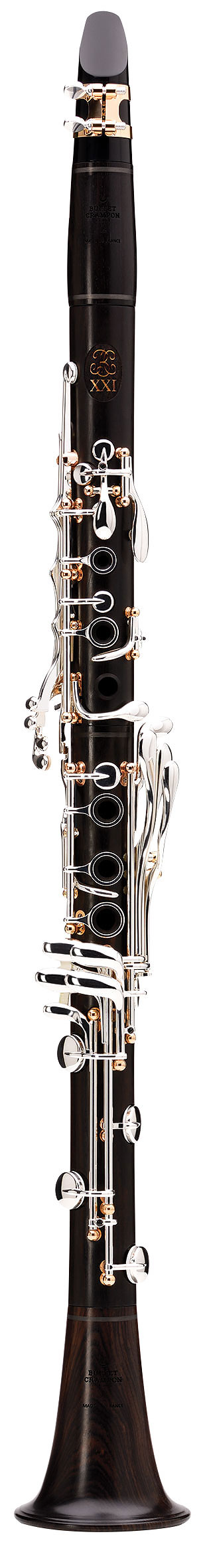 BUFFET Bb-Clarinet BCXXI, key : Bb, natural african blackwood, pitch : 440/442 Hz, 2 barrels (length: 2,59/2,56 inch), poly-cylindrical bore according to the Buffet Crampon method, green line tones holes slots on the upper joint, metal-capped tenons, carbon wire on barrel, lower joint and bell, synthetic cork on tenon, no lubrification necessary, 19 keys and 6 rings, new adjustable thumb rest, Eb lever, low Eb key, silver-plated finish, highly reliable keywork, metal O-ring pins, blue steel springs, pads : combination of GT pads (100 percent waterproof and breathable) and natural cork pads, delivered in case with ligature and accessories