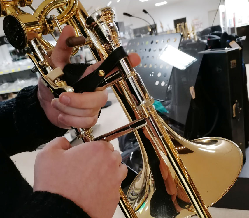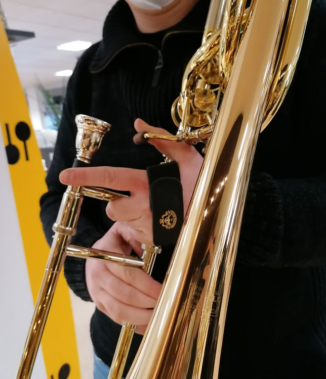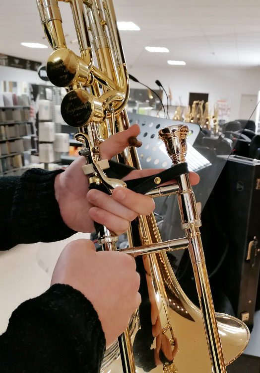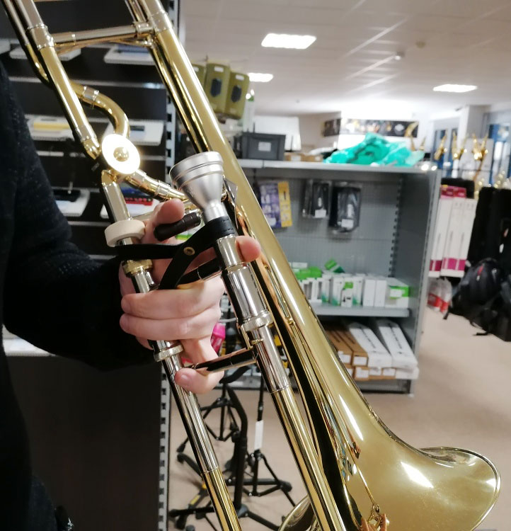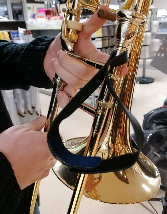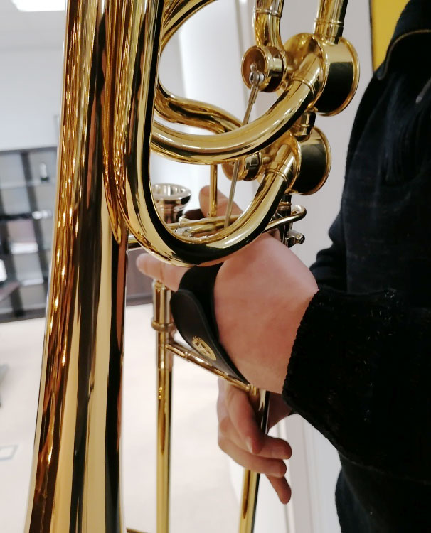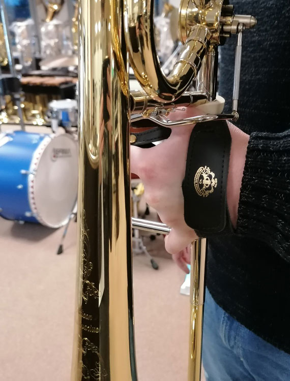 Leather wrist strap allows comfortable and unrestrained holding of the trombone.