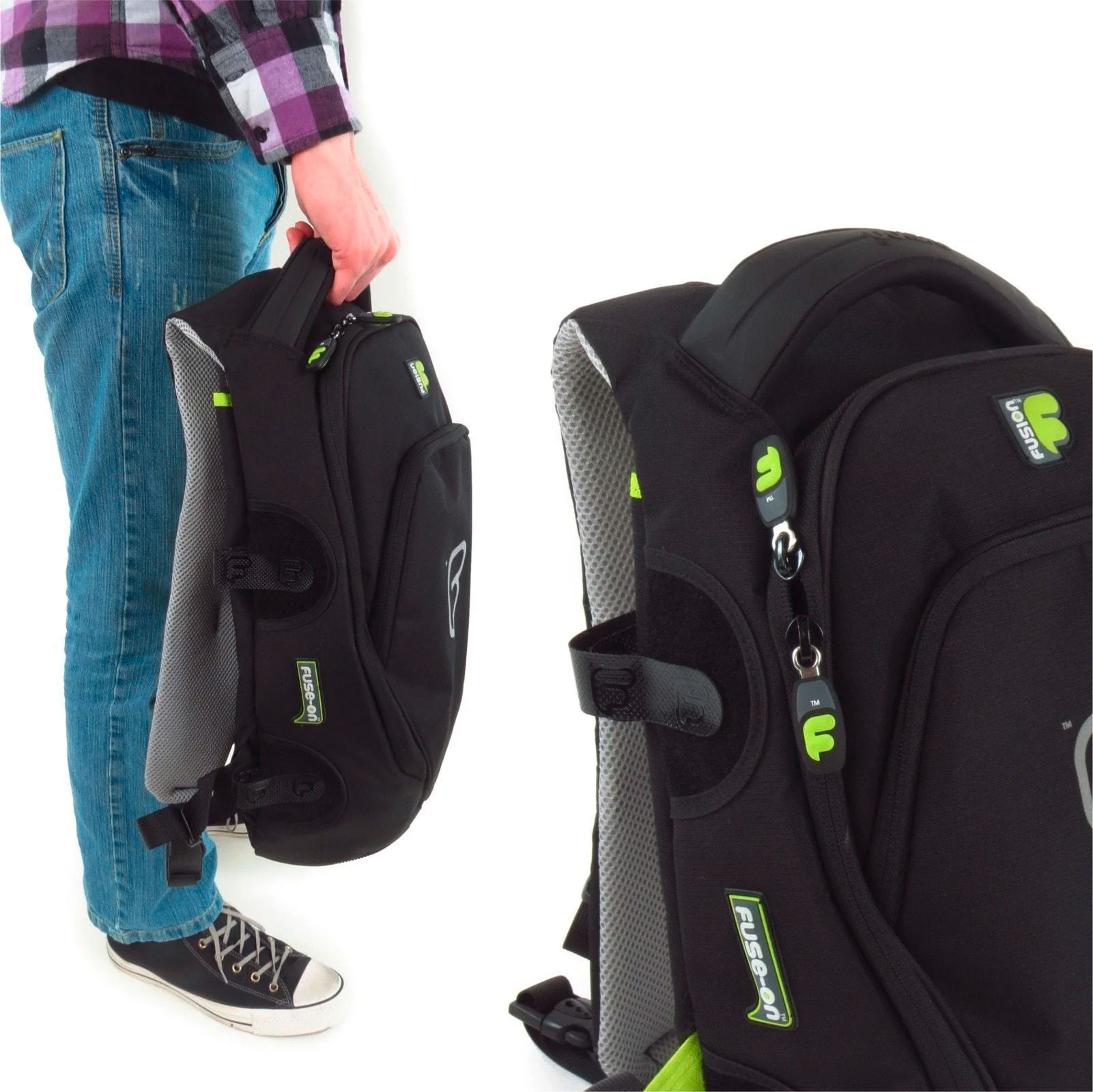 FUSION-FUSE ON-Gigbag Urban-Serie, black, large, wenn eine Fusion-Tasche eine Gummiplakette -Fuse-on- trägt, zeigt dies an, dass sie schnell und leicht mit vier starken Klettriemen, die durch D-Ringe geführt werden, auf die Vorderseite einer Instrumententasche befestigt werden kann. Die meisten Instrumententaschen können eine Zusatztasche halten, aber die Gitarrentasche kann zwei halten, eine am Kopf und eine am unteren Teil der Gitarre. Dieses Konzept wurde speziell für reisende oder vielbeschäftigte Musiker entwickelt, die zusätzlichen Stauraum für Zubehör, Essen und Trinken, Ersatzkleidung oder sogar einen Laptop benötigen. Fuse-On Small Backpack, 10mm Polsterung, Außenmaterial PVC-freies 600D Polyester, mit umweltfreundlicher EVA-Unterlage, unabhängig nutzbar oder als Erweiterung auf Urban aufsetzbar, schwarz