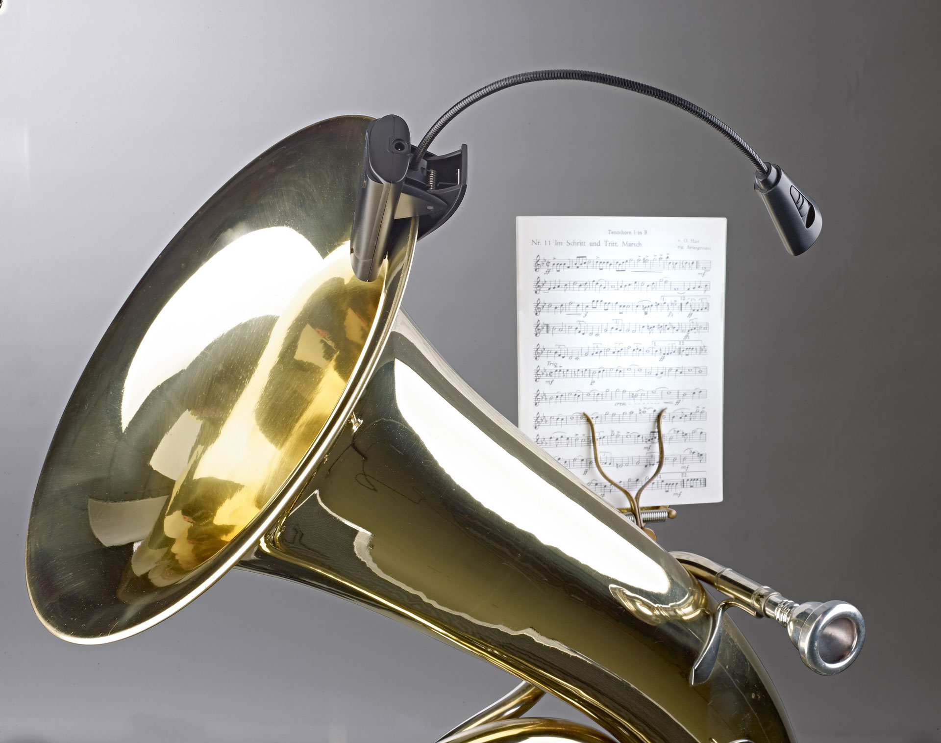K&M Notenpultleuchte 2 LED FlexLight 12242, vielseitig einsetzbare LED-Leuchte mit 2 superhellen LEDs. Extrem lange Lebensdauer von bis zu 100.000 Stunden. Lichtkegel durch flexiblen Schwanenhals äußerst variabel einstellbar. Mit Clip (bis 25 mm) zum Befestigen an Notenpulten, Tischplatten etc., auch als Standleuchte verwendbar. Sehr kompakt und handlich. Betrieb mit Netzteil (nicht im Lieferumfang) oder Batterie möglich. Inklusive 3 Batterien (1,5 V AAA) mit einer Leuchtdauer bis zu 20 Stunden.