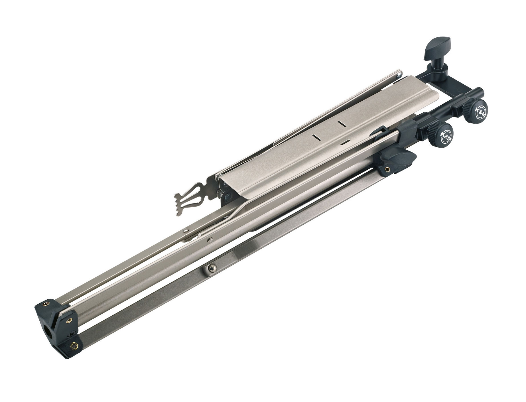 K&M-Notenständer 100/5 nickelfarbig, mit stabilen Profilfüßen, spezielle Klemmelemente schonen die Oberfläche bei der Höhenverstellung, Fußkonstruktion: Strebenkonstruktion, kompakt faltbar, Gewicht: 1,5 kg, Größe zusammengelegt: 460 mm, Höhe: von 500 bis 1.300 mm, Material: Stahl, Notenauflage: 435 x 215 mm, Notenpultkopf: traditionell zusammenlegbar, Produktkategorie: Baseline, Rohrkombination: 2-fach ausziehbar