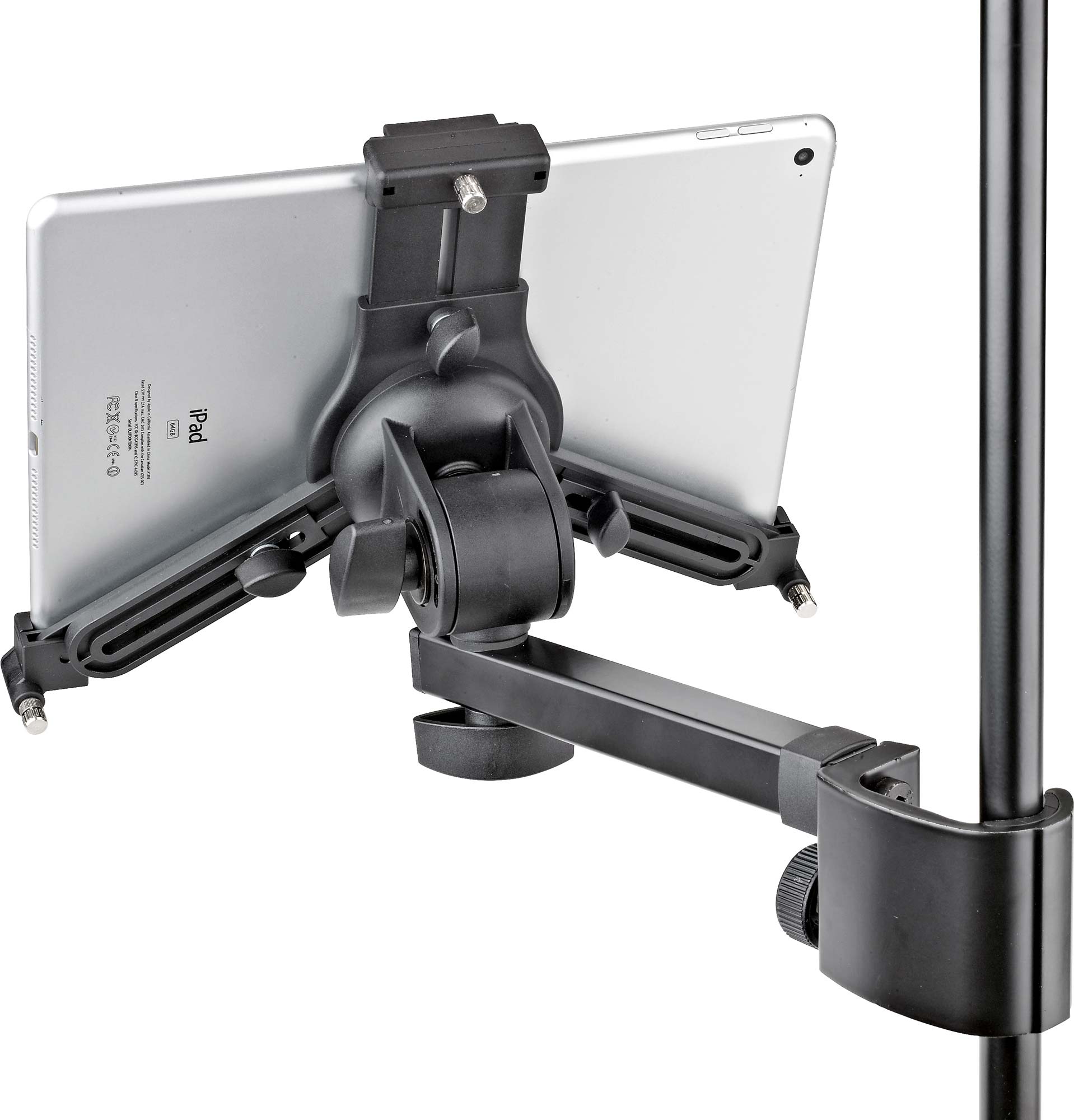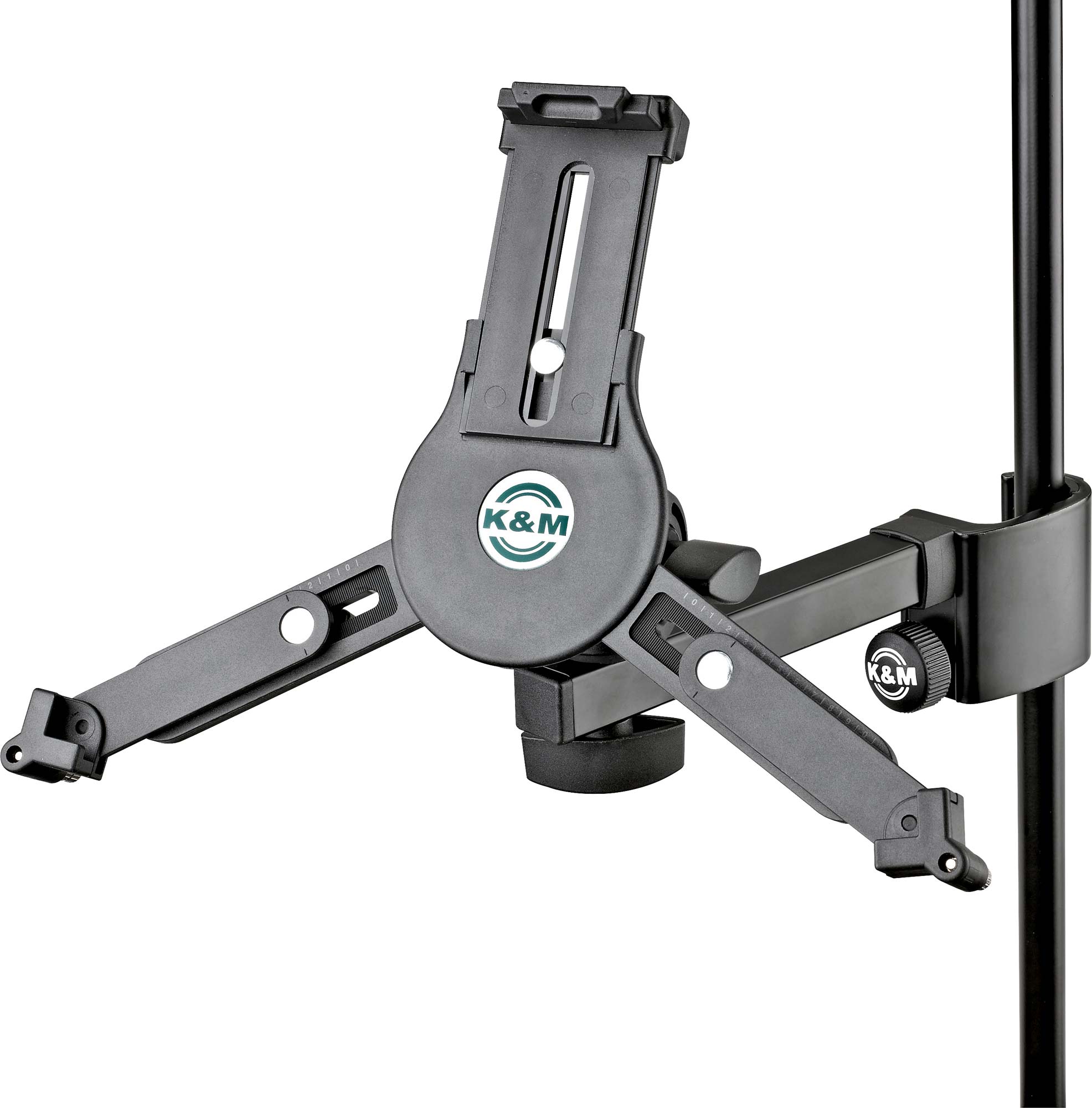 K&M Tablet-PC-Halter 19791 Universeller Tablet Halter für verschiedene Modelle. Die Universal-Tablet-Halterung ist stufenlos auf verschiedene Tablet-Größen ohne Werkzeug einstellbar und hält das Gerät garantiert sicher und effektvoll bei vielen Gelegenheiten. Egal ob auf der Bühne, im Proberaum oder zu Hause - dank des starken Klemmelements mit der ergonomischen Klemmschraube kann der Halter an jedes Rohr bis 30 mm Durchmesser schnell und einfach befestigt werden. Die individuell einstellbaren Haltearme ermöglichen den Einsatz von Tablets mit einer Höhe von 222 bis 334 mm und einer Breite von 128 bis 232 mm (wie z. B. iPad, iPad Air, iPad Pro, Amazon Fire HDX 8.9, Samsung Galaxy Tab ab 9.7, Google Nexus 9, Asus Transformer oder Microsoft Surface sowie Surface Pro). Die Tiefe des Tablets kann dabei zwischen 6 und 11 mm variieren. Beim erstmaligen Einstellen werden die drei Haltearme mittels Klemmschrauben auf die Größe und Tiefe des Tablets eingestellt. Für die weitere Nutzung wird das Tablet dann ganz einfach und schnell über einen Schnappverschluss eingesetzt und auch wieder entnommen. Eine handliche Flügelmutter ermöglicht die stufenlose Einstellung der Neigung, so dass jeder Anwender seine individuelle Position leicht finden kann. Das Tablet kann zwischen Hoch- und Querformat kurzerhand gedreht werden, wobei ein selbstständiges Drehen verhindert wird.