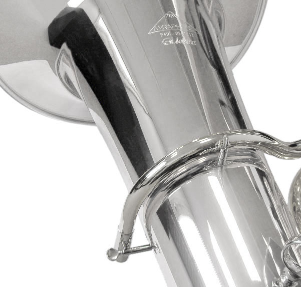MIRAPHONE-F-Tuba -Elektra- S, GMS, 6 Ventile (F-481C), Goldmessing, versilbert, Schallstückdurchmesser 420 mm, 443 Hz, Anzahl der Ventile 6 (4R/2L), 5/4 Größe, ohne Notenhalterkästchen, ohne Trageriemenhalter, Zylindermaschine, Bohrung Maschine verlaufend von 19,6 mm auf 21,2 mm, Spiralfederdruckwerk, Bohrung für Druckausgleich am Ventil, langer Ganzton am oberen, Ventildrücker, 5. Ventil nachgesetzt, Mundstück TU28.