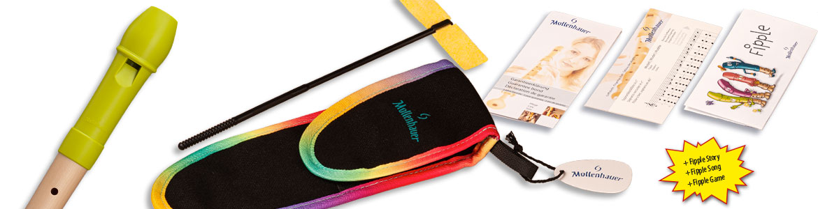 MOLLENHAUER Fipple - Lere - Sopran, apfelgrün, Kunststoff/Ahorn, barocke Griffweise mit Doppelloch. Die sympathische Sopranblockflöte mit farbigem Kopfstück aus Kunststoff in Apfelgrün und Griffstück aus europäischen Ahornholz. Die kindgerechte und hochwertige Materialkombination ist das bewährte Erfolgsrezept für einen guten Einstieg in die Musik. Unempfindlich, zuverlässig und wohltönend, bietet sie mit gebogenem Windkanal eine gute Ansprache im ganzen Tonumfang und eine ausgewogene Stimmung. Die elegante Linienführung des Flötenschnabels und die schwungvolle Gestaltung des Instruments eröffnen von Beginn an den Bezug zu barocken Vorbildern. Das Griffstück aus Holz mit von Hand bearbeiteter, geölter Oberfläche sorgt für eine angenehme Haptik sowie einen schönen Klang. Der Kunststoffkopf erleichtert die hygienische Pflege, indem er einfach mit lauwarmem Wasser durchgespült und außerhalb der Tasche getrocknet wird. Lernmotivierend Jedes Fipple-Modell ist mit einer Charakterfigur verbunden, mit der sich Kinder identifizieren können. Die apfelgrüne Leregunde ist übereifrig sachlich und naturliebend. Sie schwärmt für helle und schwebende Klänge. Die bunte Welt der Fipples beflügelt die Fantasie und fördert die Lernbereitschaft. Zusätzlich zum Instrument wird motivierendes pädagogisches Begleitmaterial angeboten: die abenteuerliche Fipple Story zum Vorlesen oder Selbstlesen der lustige Fipple Song - kleine Musikübungen für den spielerischen Einstieg das Fipple Game - zum Selberbasteln für spannenden Spielespaß