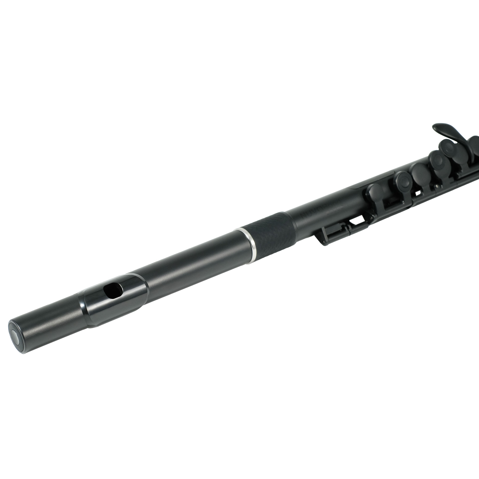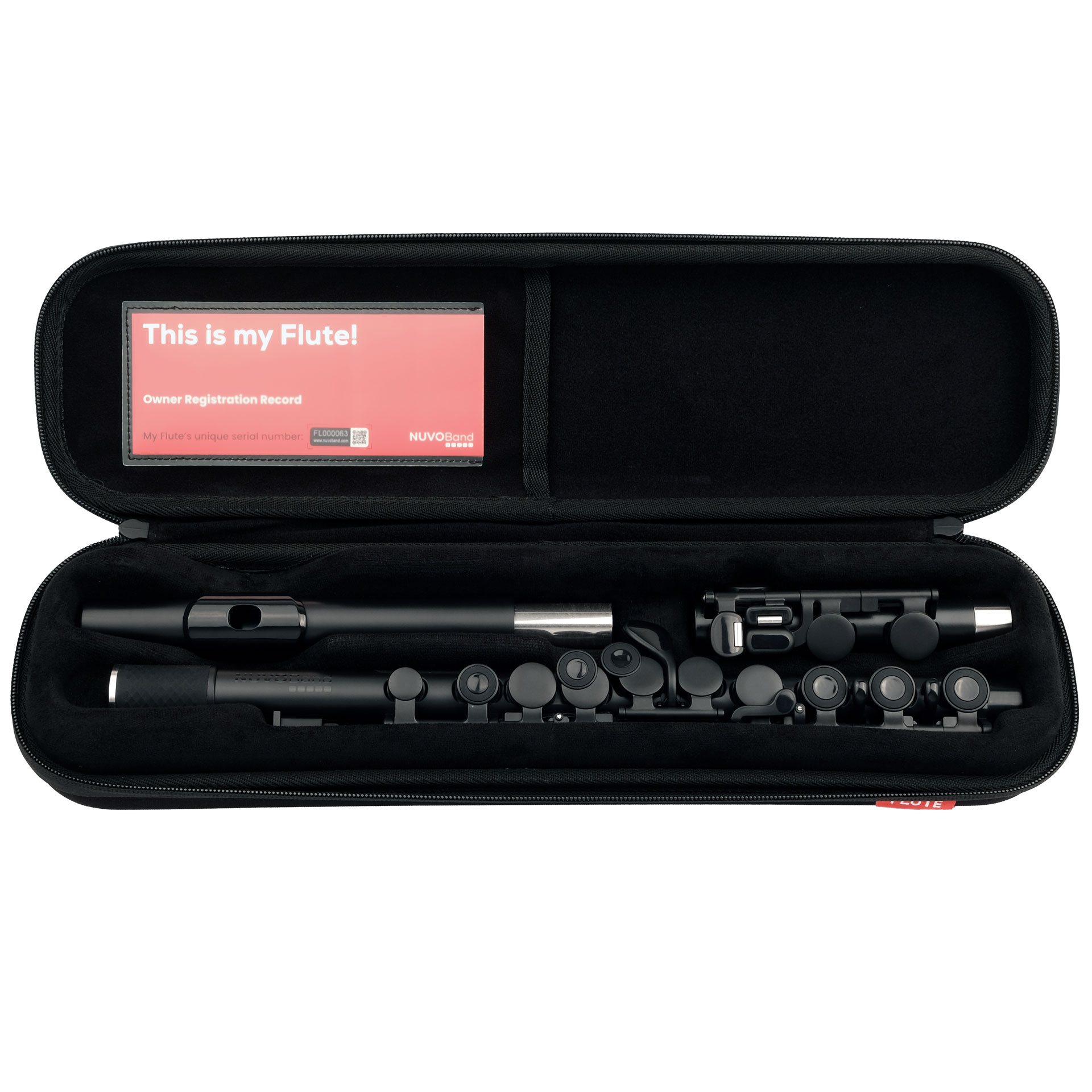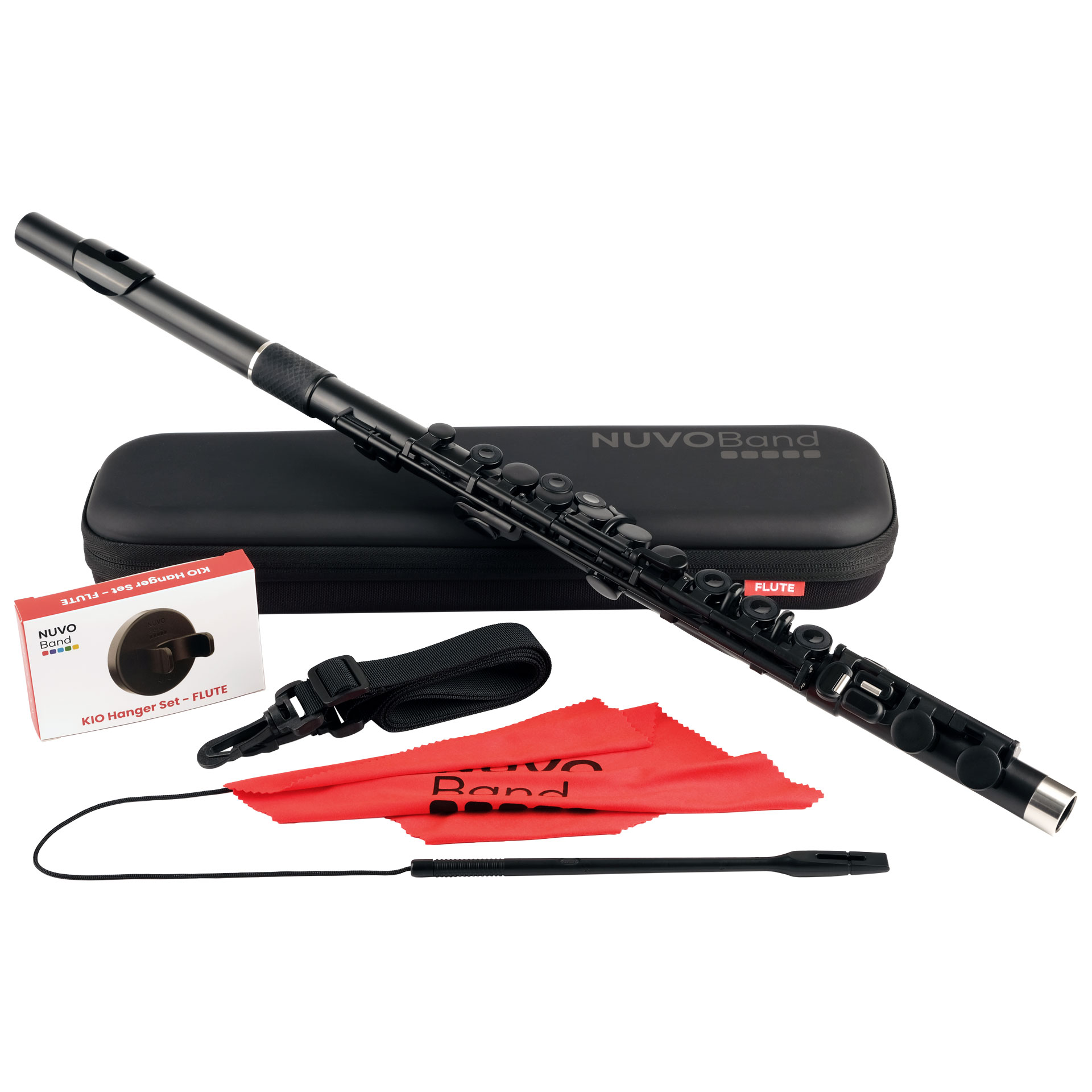 NUVO BAND Querflöte, schwarz, Stimmung: C, TÜV geprüfte Materialien, gerades Kopfstück 100% wasserfest und leicht zu reinigen, Gewicht: 240 Gramm, Kopfstückzapfen und -Aufnahme aus Edelstahl, Mechanik: vorgezogenes G, Trillerklappen, einstellbare Mechanik, sechskant Einstellschrauben, gesicherte Krone, Edelstahlachsen, Silikonpolster, Material Korpus: ABS mit Polycarbonatanteilen, Zubehör: Spezialfett für die Verbindungen, Beschreibung, gepolstertes Etui mit einstellbarem Trageriemen, Farbe: schwarz. Die NUVOBand FLUTE ist besonders widerstandsfähig und zu 100% wasserfest und dadurch auch unter freiem Himmel, bei jedem Wetter ohne Bedenken einsetzbar. Die Querflöte ist etwa halb so schwer wie eine herkömmliche Querflöte aus Metall und erzeugt einen sehr angenehmen, weichen Ton bei hervorragender Intonation. Das patentierte Design und die Klappen bestehen aus einem stabilen technischen Polymer. Dieses Materialgemisch ist auf Festigkeit und Gewicht ausgelegt und weist dabei besonders gute Klangeigenschaften auf. Das Mundloch ist so geschnitten, dass es Anfänger ermutigt und Fortgeschrittenen einen vollen und ansprechenden Ton in allen Registern bietet. Der Korpus mit der Kopfstückaufnahme aus Edelstahl ist so konzipiert, dass auch hochwertige Kopfstücke anderer Fabrikate angepasst werden können - die Aufnahme entspricht der Standardgröße. Die NUVOBand FLUTE verfügt außerdem über sorgfältig positionierte Silikon-Komfort-Pads, die einen sicheren Griff als auch Komfort beim Üben und Spielen gewähren. Das Instrument wird in der gepolsterten Tragetasche in 3 Teilen aufbewahrt, die für einen einfachen und intuitiven Auf- und Abbau und stabilen Transport ausgerichtet sind. Im Lieferumfang enthalten ist die KIO (\"Keep it Out\") Wandaufhängung, mit der Sie das Instrument zum regelmäßigen Üben griffbereit an die Wand hängen können.