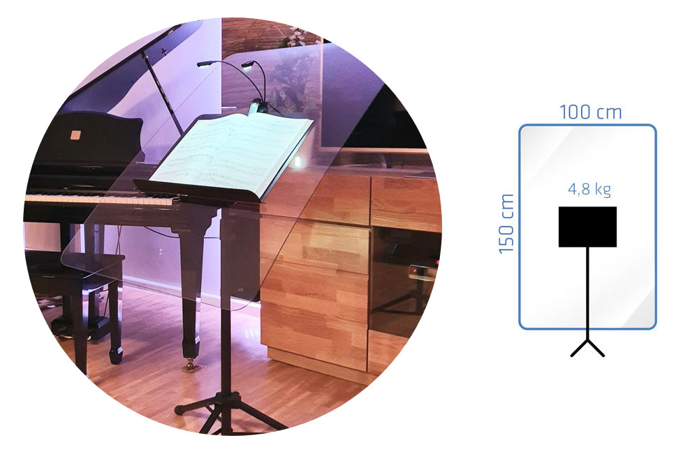 PROPULT Speichel- und Akustikschutz large. Größe 1000 x 1500mm, Gewicht: 4,8kg Die PROPULT Lösung lässt sich bei diversen Blech-Notenpulten (Ausführung für Holz-Pulte auf Anfrage) einsetzen und kann bei sämtlichen Pult-Einstellungen (Höhe, Neigung, Steh-, Sitzposition) verwendet werden. Die Blech-Notenpulte sind wegen ihrer Stabilität hierfür bestens geeignet. Hygienemaßnahmen: Die Polycarbonat-Trennwand deckt den Bereich vor und hinter dem Notenpult ab und schützt Personen in direkter Umgebung vor Spuck-Partikeln und Sprachspeichel (Aerosole und Tröpfchen). Je nach branchenspezifischen Hygienemaßnahmen, kann hierbei auf die Maskenpflicht verzichtet werden - Informieren Sie sich über den aktuellen Stand. Schallschutz: Als parallele Funktion, bietet PROPULT auch einen Schallschutz an. Hier kann die Instrumenten-Lautstärke nach Bedarf entsprechend beeinflusst, bzw. reduziert werden. Die leicht gebogene Platten-Form (Konvex), wie auch die flexible Einstellung des Notenständers ermöglichen eine Reflexion der Schallwellen ohne, dass diese (je nach Instrument und Spielart) zurück auf den Musiker reflektiert werden. Weitere Vorteile: Dank dem ideal transparenten PROPULT Paneel können Personen auf beiden Seiten des Pultes frei kommunizieren. Die Perzeption und Wahrnehmung zwischen den Musikern und dem Publikum bleibt unbeeinflusst. Auch das Notenblättern, Notieren oder die optionale Anbringung der LED-Ausleuchtung ist weiterhin möglich (eine separate Aussparung für Lampenanbringung). Im Außenbereich (Open Air Events) könnten die Musikhefte oder Notenblätter hinter der Scheibe platziert werden (Windschutz). Die bedruckbare Platte kann optional als Wegweiser, Infotafel etc. genutzt werden.
