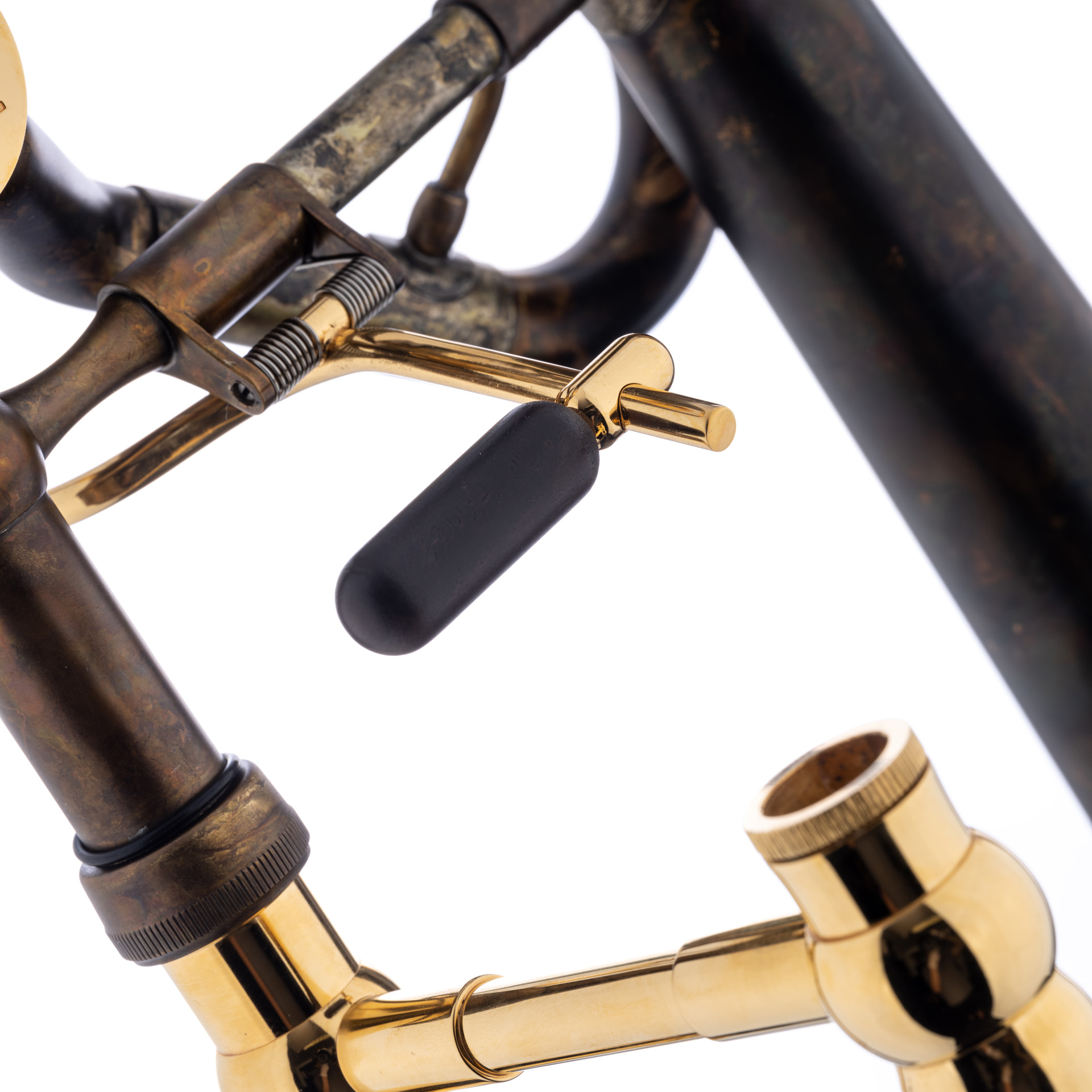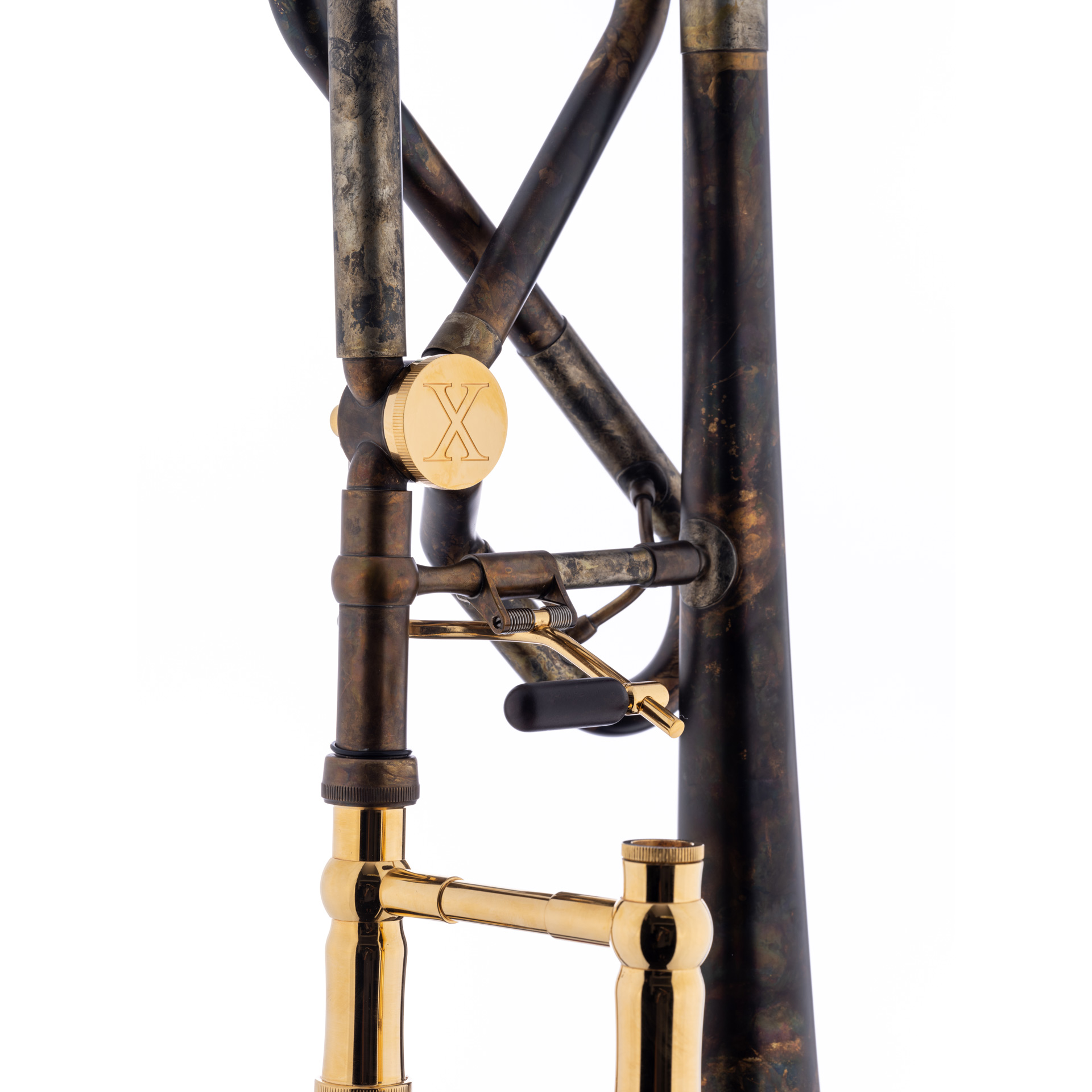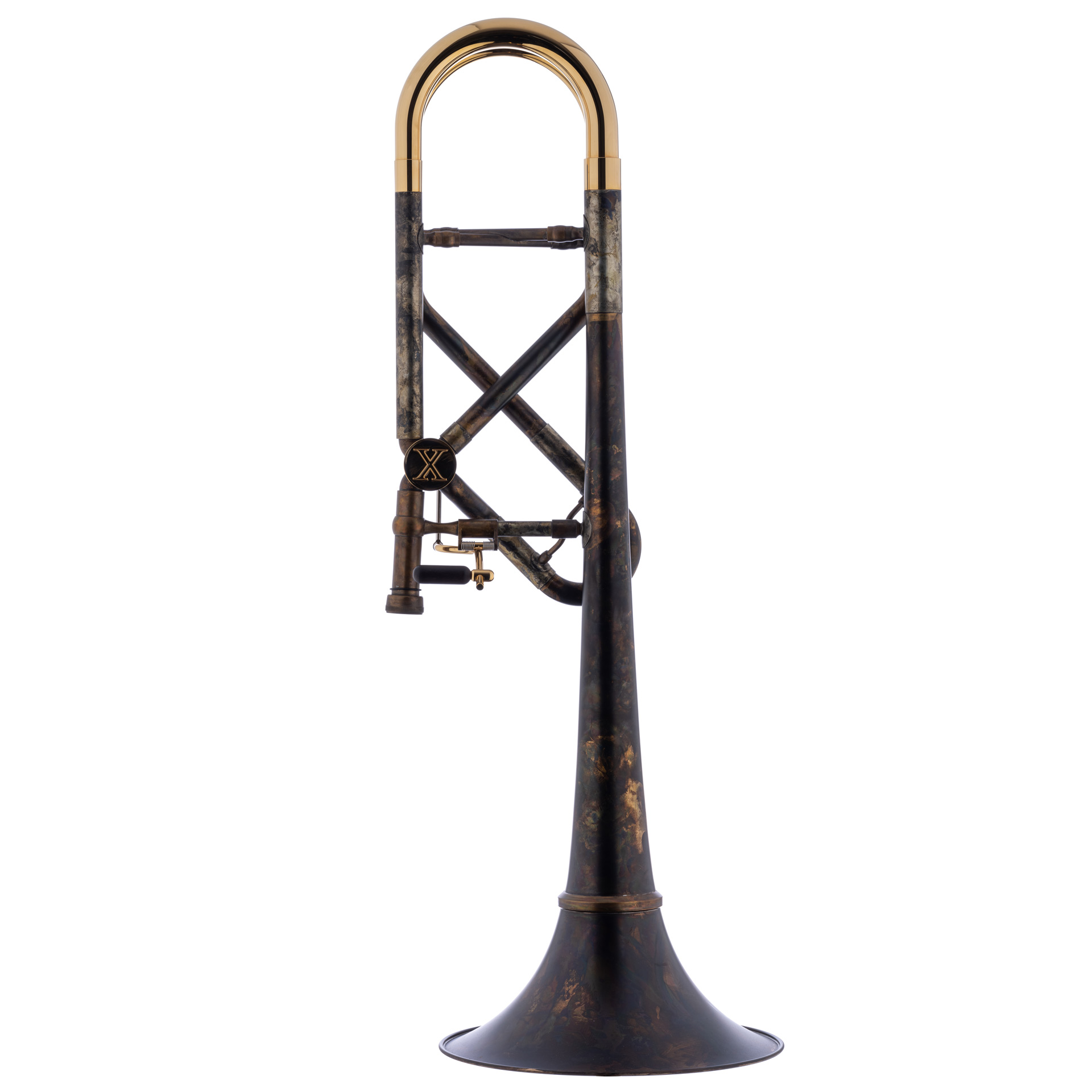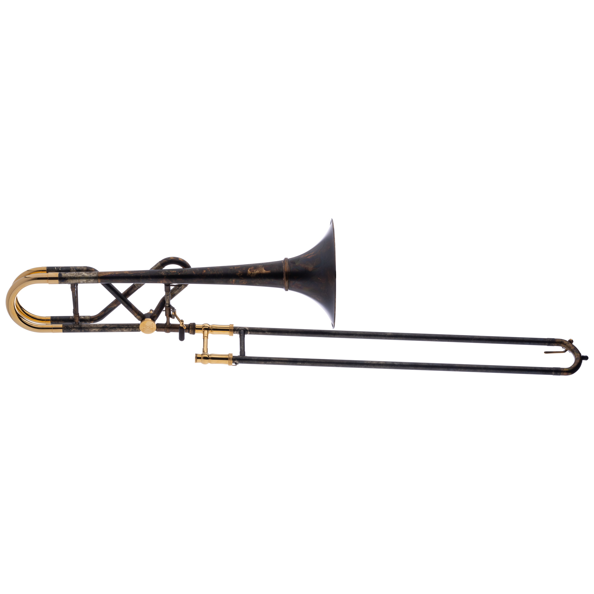 SCHAGERL-B/F-Tenorposaune Kissbone X, Schallbecher: 220 mm (Goldmessing), Wandstärke: 0,55 mm, Bohrung-Zug: 13,90 mm, Bohrung-Ventil: 14,20 mm, Neusilberzug, Goldmessingkorpus, Oberfläche: Oberfläche: Vintage Lack Design (mit vergoldeten Kleinteilen). Das Modell KISSBONE wurde gemeinsam mit Zoltan Kiss von Mnozil Brass entwickelt (Design: Zoltan Kiss und Severin Distelberger).