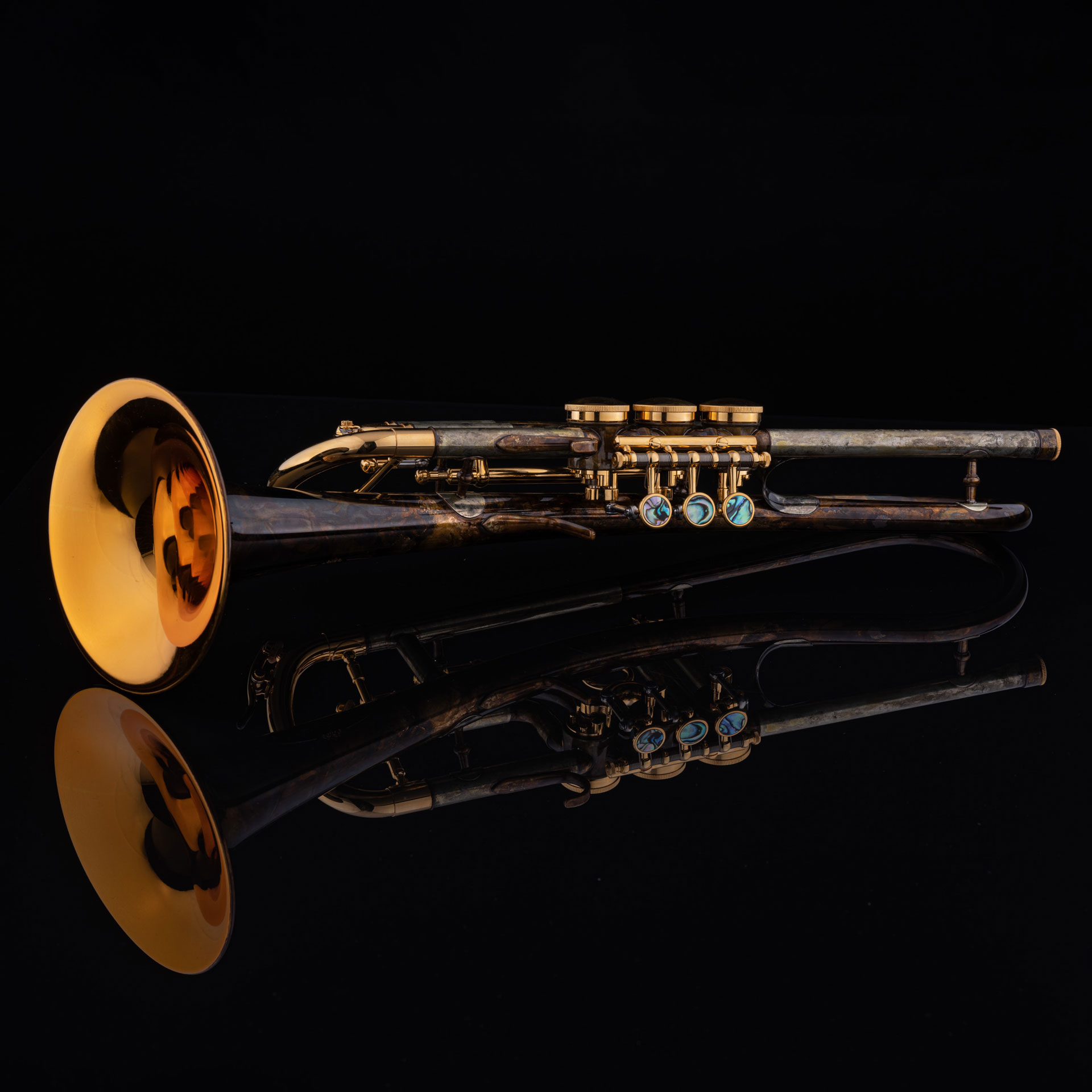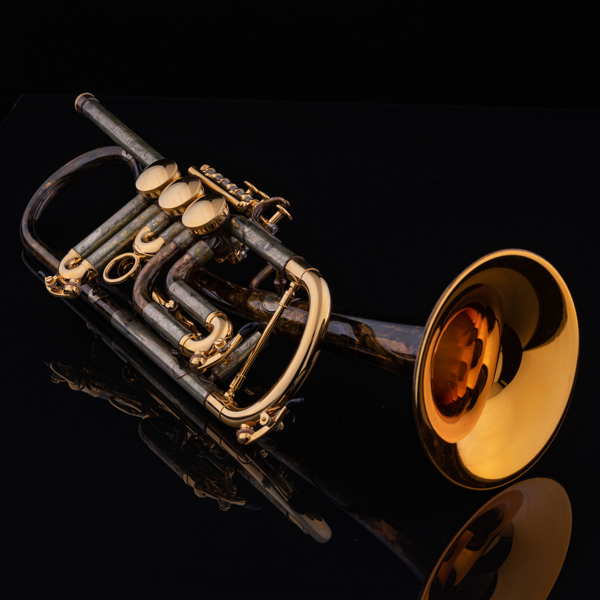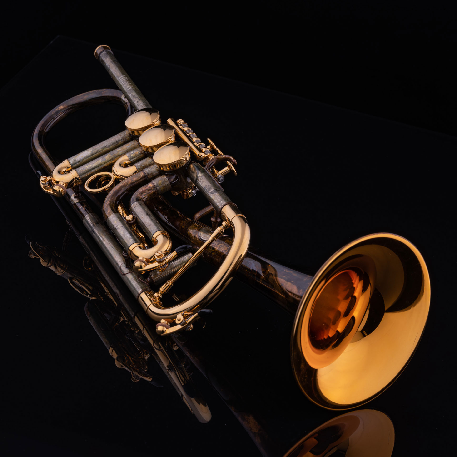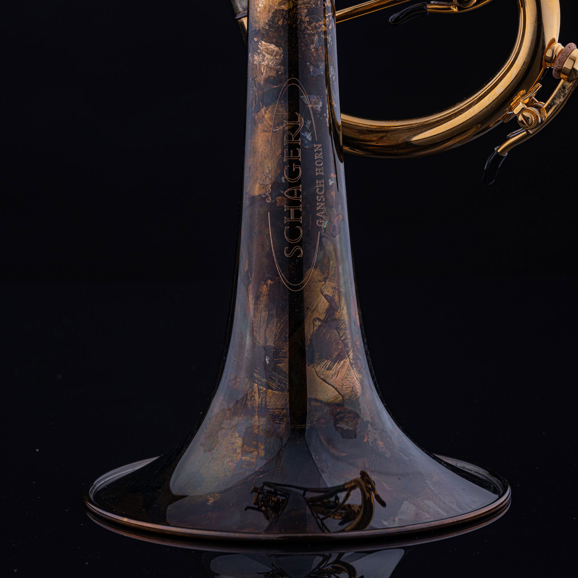 SCHAGERL-Bb-Trompete - Ganschhorn Modell 2021 - Goldmessing, Schallbecher: 130 mm, Blechstärke: 0.45 mm, Ventilstock: ML, Oberfläche: Vintage Matt lackiert mit vergoldeten Anbauteilen. Das Ganschhorn entstand aus dem Wunsch vieler Trompeter, die spielerischen Vorzüge einer Drehventil mit denen einer Perinet-Trompete zu verbinden. Auch das Schallstück-Design wird von vielen Spielern als vorteilhaft empfunden, da es einen besseren Kontakt zu Publikum oder Mikrophon erlaubt. Zusammen mit Thomas Gansch entwickelte die Firma Schagerl dieses einzigartige Instrument, dessen Drehventil-Maschine eingebaut ist. Dadurch ergibt sich ein angenehmes Perinet-Handling mit den kurzen Wegen einer Drehventil-Maschine. Durch das besonders gebogene Schallstück ist das Ganschhorn zudem ein echter -Hingucker-. Dieses Instrument wird ohne Mundstück ausgeliefert.
