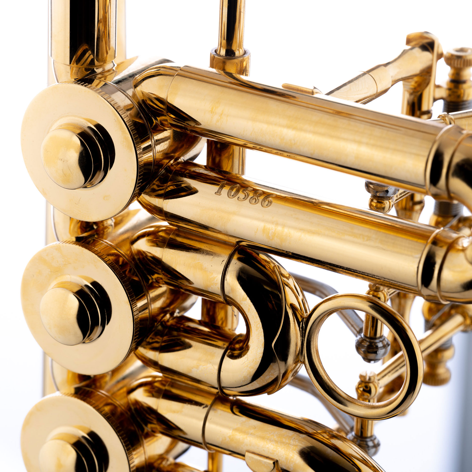SCHAGERL-Bb-Trompete - Hans Gansch Heavy -Messing Mundrohr, Goldmessing Schallbecher, Schallbecher: 137 mm, Blechstärke: 0.50 mm, Ventilstock: L, Tonausgleich am 3. Ventilzug, Oberfläche vergoldet Das Streben nach der bestmöglichen Qualität der Instrumente hat bei Schagerl höchste Priorität. Gemeinsam mit und für Prof. Hans Gansch (Mozarteum Salzburg) wurden die Signature B- und C-Trompetenmodelle -HANS GANSCH- entwickelt. Dieses Instrument wird ohne Mundstück ausgeliefert.