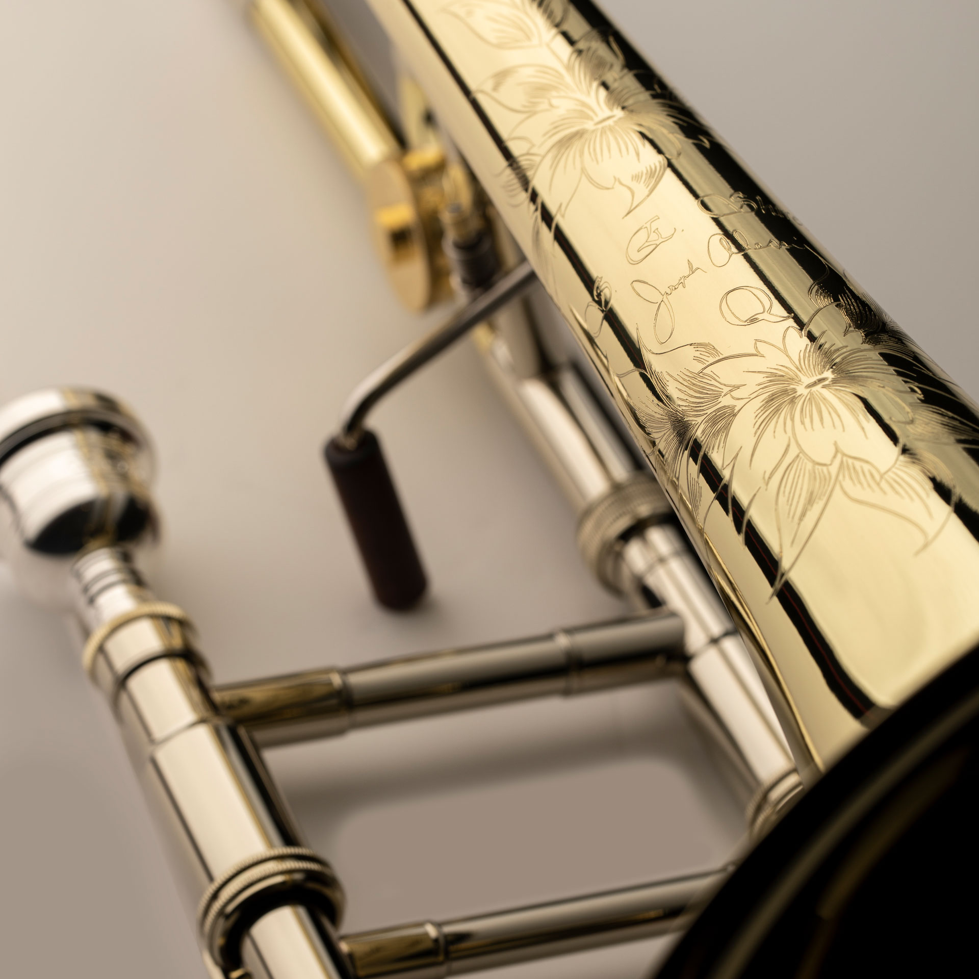 SHIRES-B/F Tenorposaune TBQ Alessi QAlessi-Schallbecher: 8,5 Zoll, zweiteilig, leichtes Gelbmessing mit ungelöteter Rand und spezieller Wärmebehandlung. QAlessi-Quartventil F mit F-Zugbogen aus Goldmessing und gravierter Ventilkappe. QAlessi-Stimmzug: Goldmessing, gezogenes Rohr. QAlessi Posaunenzug: 0,547 Zoll, Goldmessing in Standardgewicht, breiter Messing-Bogen. Drei austauschbare Mundrohre aus Messing. Gravur auf dem Schallbecher: S.E. Shires Joseph Alessi Model, individuelle Gravur. Inklusive Q-Serie Tenorposaunenkoffer, Mundstück und Pflege-Set. Die Tenorposaune Joseph Alessi Q Series Artist Model wurde gemeinsam mit Herrn Alessi entwickelt, um ein außergewöhnliches Instrument zu einem erschwinglichen Preis anzubieten. Ähnlich wie das Modell der Custom Series zeichnet sich dieses Instrument durch eine revolutionäre Kombination von Materialien und Konstruktion aus, die eine perfekte Balance zwischen Klangfarbe, Effizienz und Resonanz schafft. Das QAlessi-Schallstück besteht aus einem ungelöteten, zweiteiligen, leichten Messing-Schallstück, das diesem Instrument eine gute Projektion verleiht und gleichzeitig einen breiten und warmen Klang gewährleistet. Das neu entwickelte Drehventil der Alessi Q-Serie verfügt über einen F-Zugbogen aus Goldmessing, der für Tiefe und Dichte des Klangs sorgt und gleichzeitig die Klarheit und Stabilität eines Drehventils bietet. Ein Stimmzug aus Goldmessing verleiht dem Klang dieses Instruments ebenfalls Komplexität und Wärme. Der QAlessi-Handzug besteht aus einer Kombination verschiedener Legierungen, um eine perfekte Balance zwischen Konsistenz und Klarheit sowie Flexibilität im Timbre zu erreichen. Die Joseph Alessi Q-Serie Tenorposaune bietet ultimative Vielseitigkeit für jeden Musiker, der sich von der Masse abheben möchte.