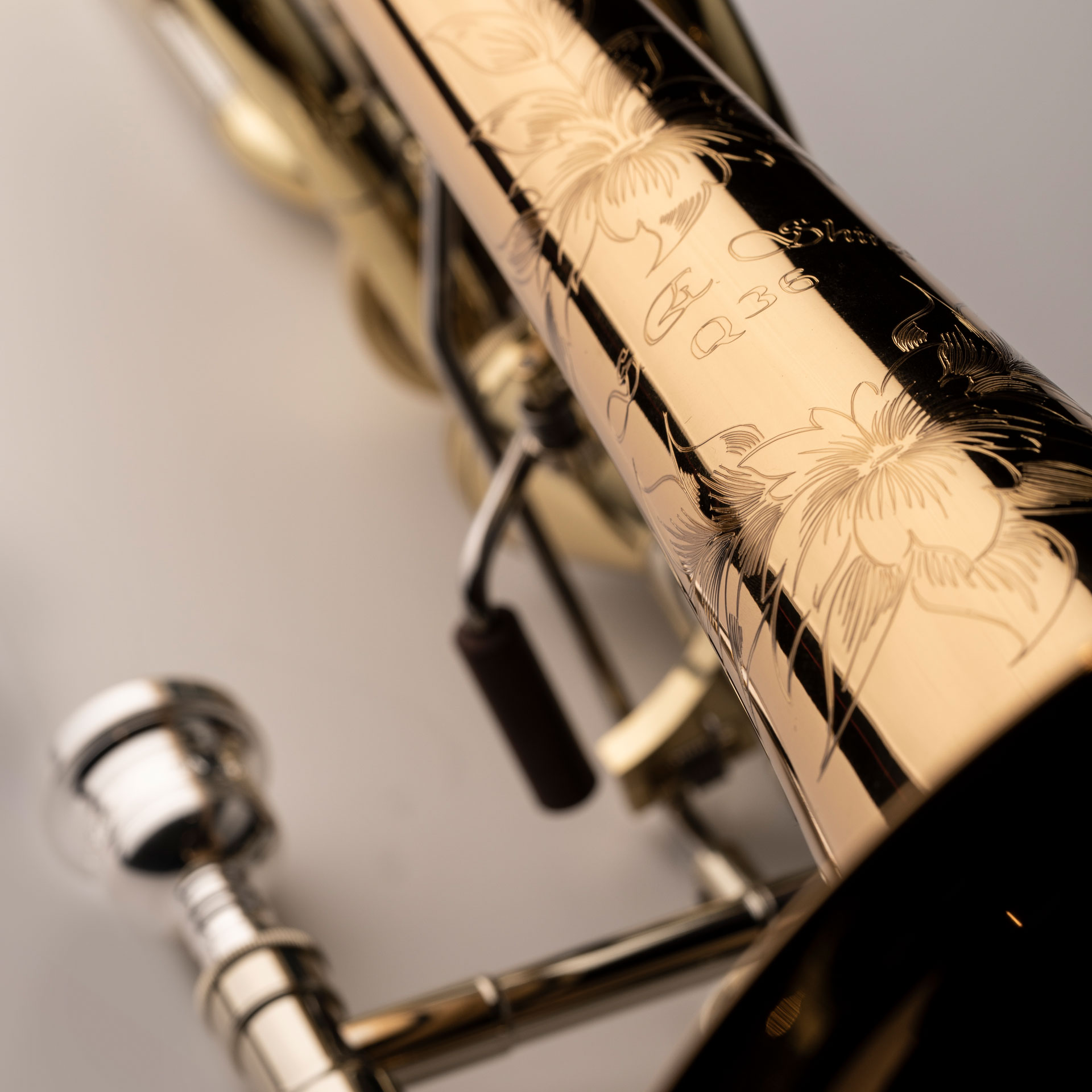 - Schallstückgravur: S.E. Shires Herstellermarke und traditionelles Blumenmuster.