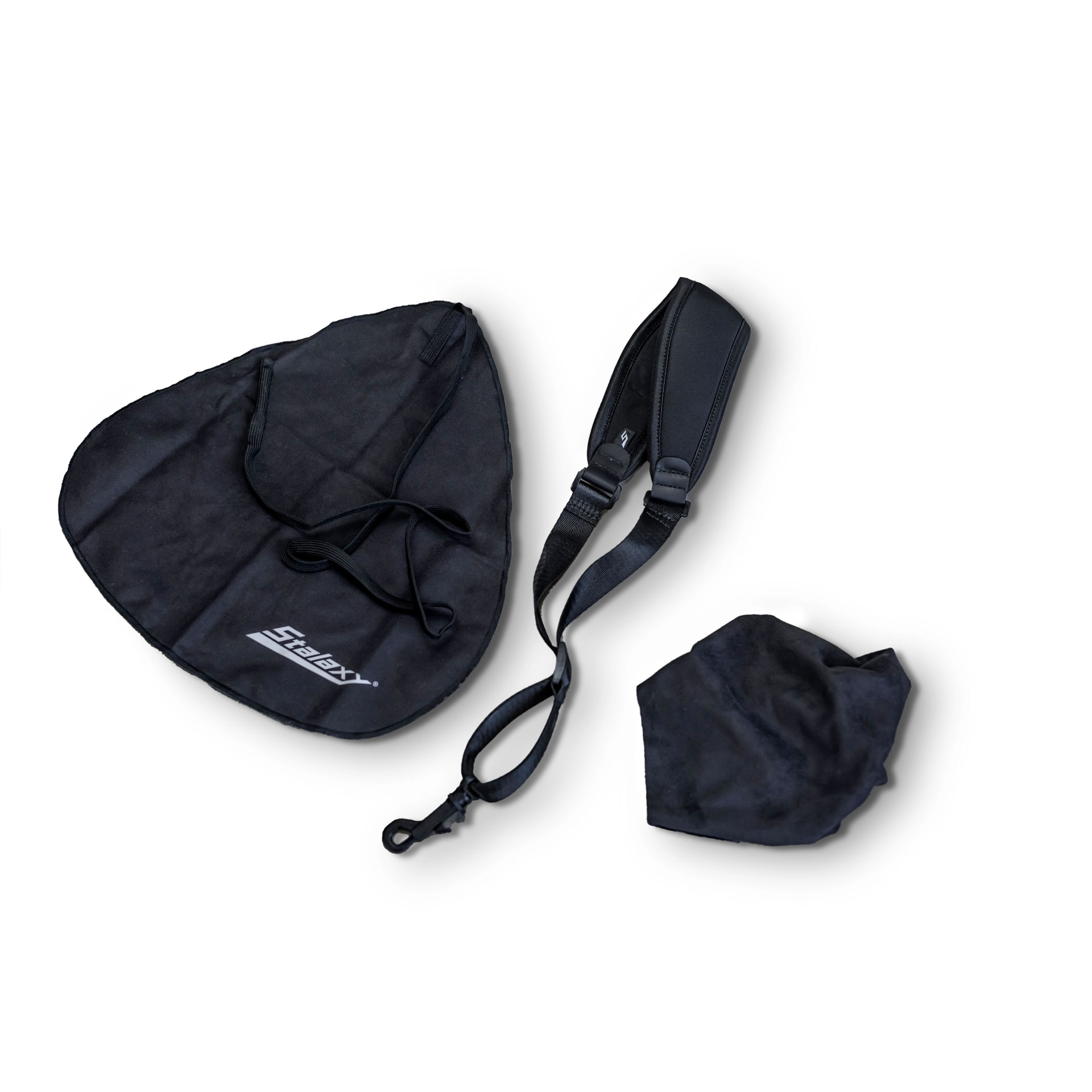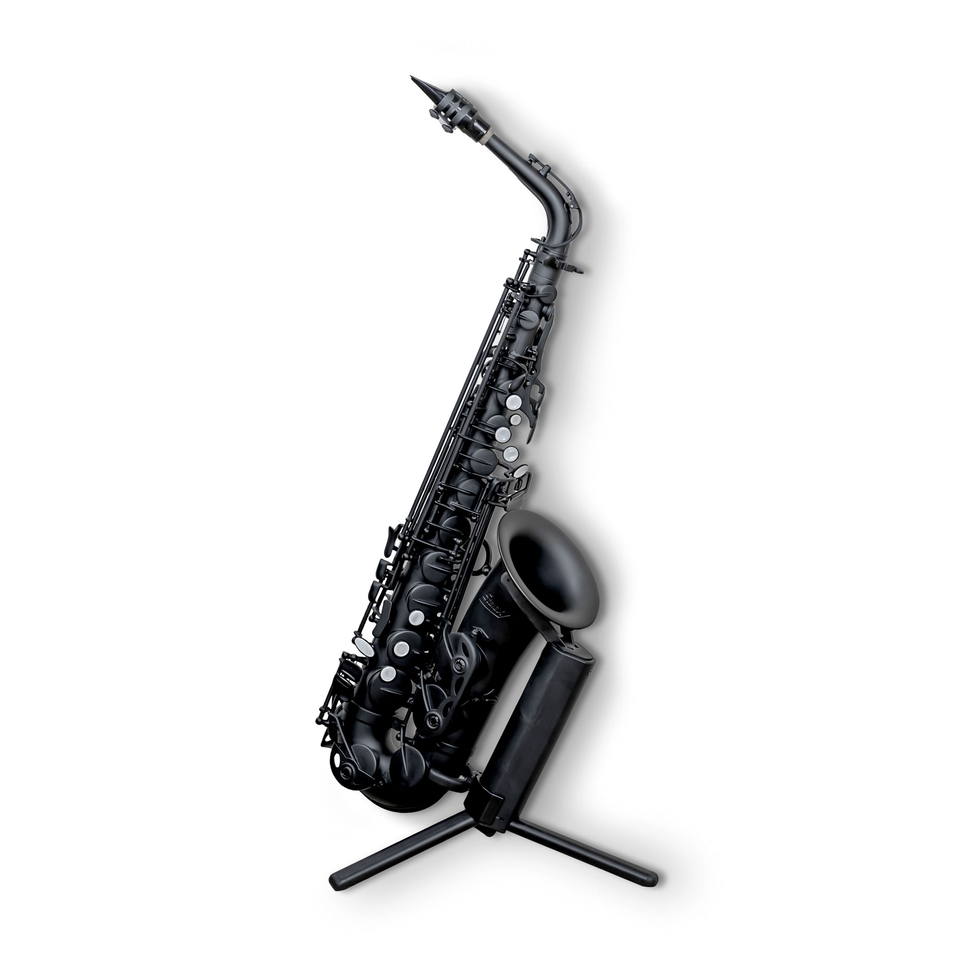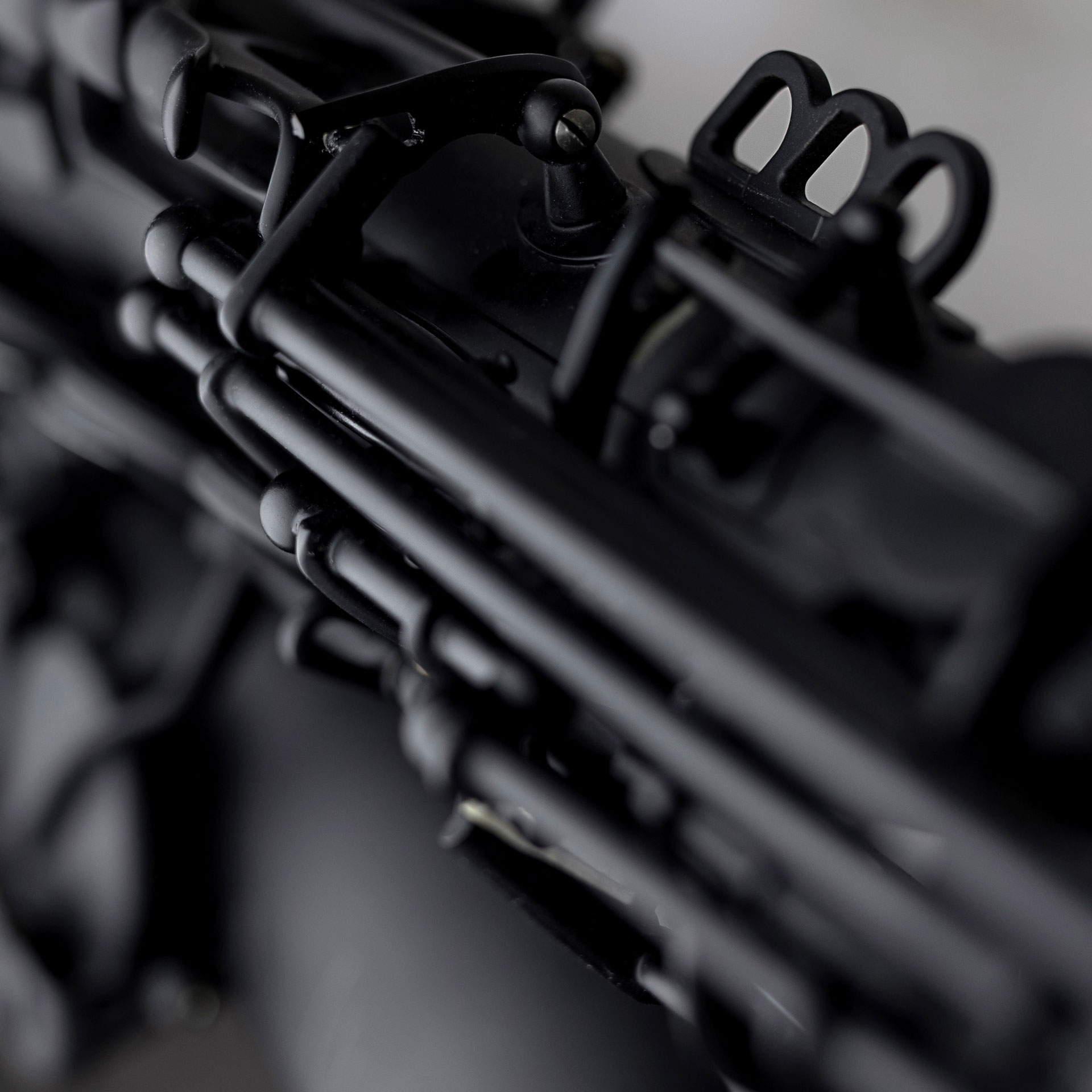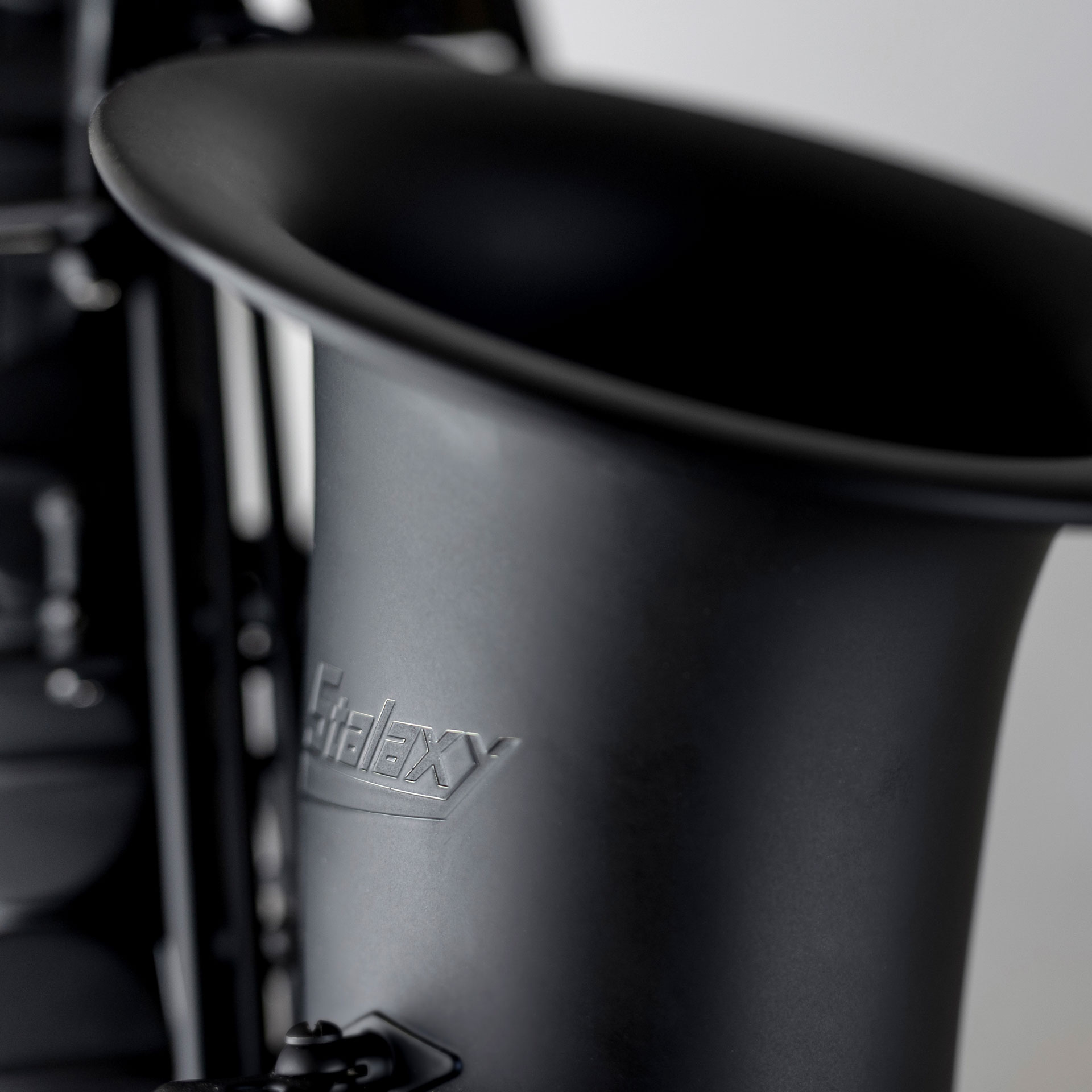 Stalaxy Altsaxophon, Korpus, S-Bogen und Mechanik aus Messing, Stalaxy Thunder Bogen mit Soundverbesserung, Mattschwarze Lackierung RAL 9005 mit spezial Lack, schwarze Polster, schwarze Filze, Daumenhalter aus Metall, Hoch F# Klappe, inkl. Stalaxy Online-Kurs, Putzzeug und Zubehör, Robuster Stalaxy Leichtkoffer mit Rucksacktragevorrichtung und Tragetaschenfunktion sowie DinA4 Fach für Noten und Hefte. Das Stalaxy Saxophon ist das weltweit erste komplett mattschwarze Messing Saxophon und hebt sich damit von allen anderen Modellen auf dem Markt ab. Unsere Vision war es, mit einzigartigem Design und erstklassigem Spielgefühl sowohl Einsteiger als auch fortgeschrittene Spieler zu begeistern. Einsteiger können zudem zusätzlich von dem beim Kauf mitgelieferten kostenlosen Stalaxy Online-Kurs profitieren. Du erhältst damit einen hervorragenden Einstieg in die Welt des Saxophonspielens - und das ganz ohne Präsenzunterricht! Der Kurs beginnt am Anfang mit essenziellen Dingen wie Aufbau des Saxophons, der richtigen Haltung, den ersten Noten etc. und vermittelt so spielerisch ganz ohne Druck die Basics. Schon nach kurzer Zeit können die ersten Lieder gespielt werden! Für fortgeschrittene Spieler ist vor allem das futuristische Design ausschlaggebend. Dazu verfügt das Stalaxy über eine sehr gute Ansprache, Intonation und Attack und punktet auch im Sound durch viel Flexibilität. Neben dem Stalaxy Saxophon und dem Stalaxy Online-Kurs ist auch alles weitere Zubehör dabei. Das Zubehör ist mit dezentem Stalaxy Slogan versehen und so erhält der Käufer ein passendes und im Detail aufeinander abgestimmtes Komplettpaket. Es kann sofort losgehen! Neben dem mattschwarzen Design und dem Zubehör gibt es noch andere verschiedene Features am Instrument. Am kompletten Saxophon ist kein Plastik verbaut, was es qualitativ sehr hochwertig macht. Unsere White River Shell Knöpfe sind aus ausgewähltem Perlmutt. Der Gurt kann an einem der drei Einhängeösen befestigt werden, wodurch eine Feinjustierung ermöglicht und das industrielle Design des Saxophons unterstützt wird. Die White River Shell Knöpfe, auf die der Spieler die Finger legt, fühlen sich wertig an und schimmern im Kontrast zu dem mattschwarzem Sax in einem schönen, hochwertigen Weiß. Die Stalaxy Logos an Mundstück, S-Bogen und Korpus sind fein sowie tief graviert und dabei trotzdem sehr dezent - ganz ohne plakativ zu wirken.