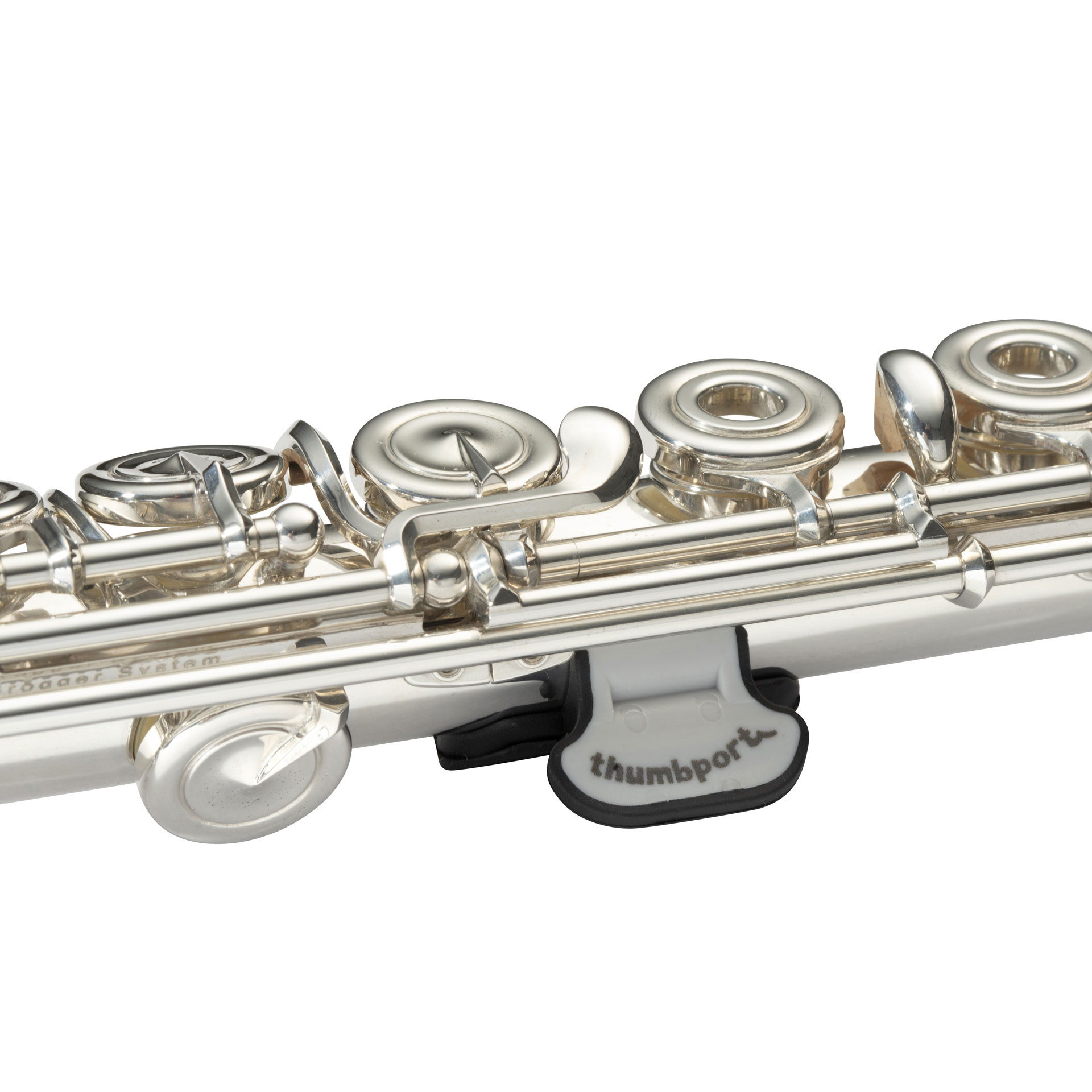 THUMBPORT-Daumenstütze grau-schwarz, der Thumbport ermöglicht eine bessere Balance beim Halten der Flöte. Es besteht aus einer C-förmigen Schale und einer daumenartigen Verlängerung. Der Thumbport hilft dem Spieler, den rechten Daumen an einer effizienten Stelle zu platzieren und bietet zusätzlichen Halt.