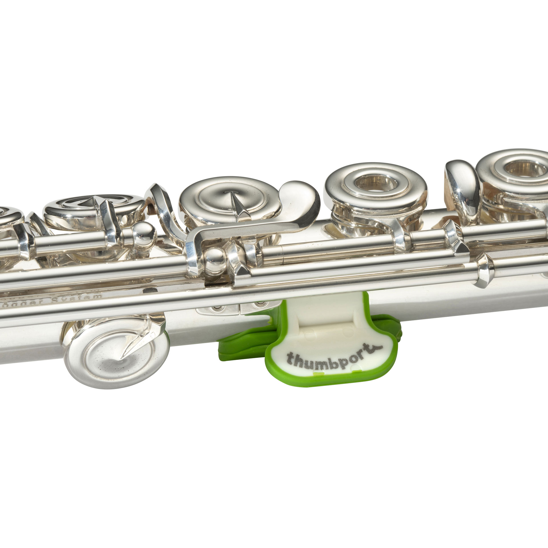 THUMBPORT-Daumenstütze grün-weiss, der Thumbport ermöglicht eine bessere Balance beim Halten der Flöte. Es besteht aus einer C-förmigen Schale und einer daumenartigen Verlängerung. Der Thumbport hilft dem Spieler, den rechten Daumen an einer effizienten Stelle zu platzieren und bietet zusätzlichen Halt.