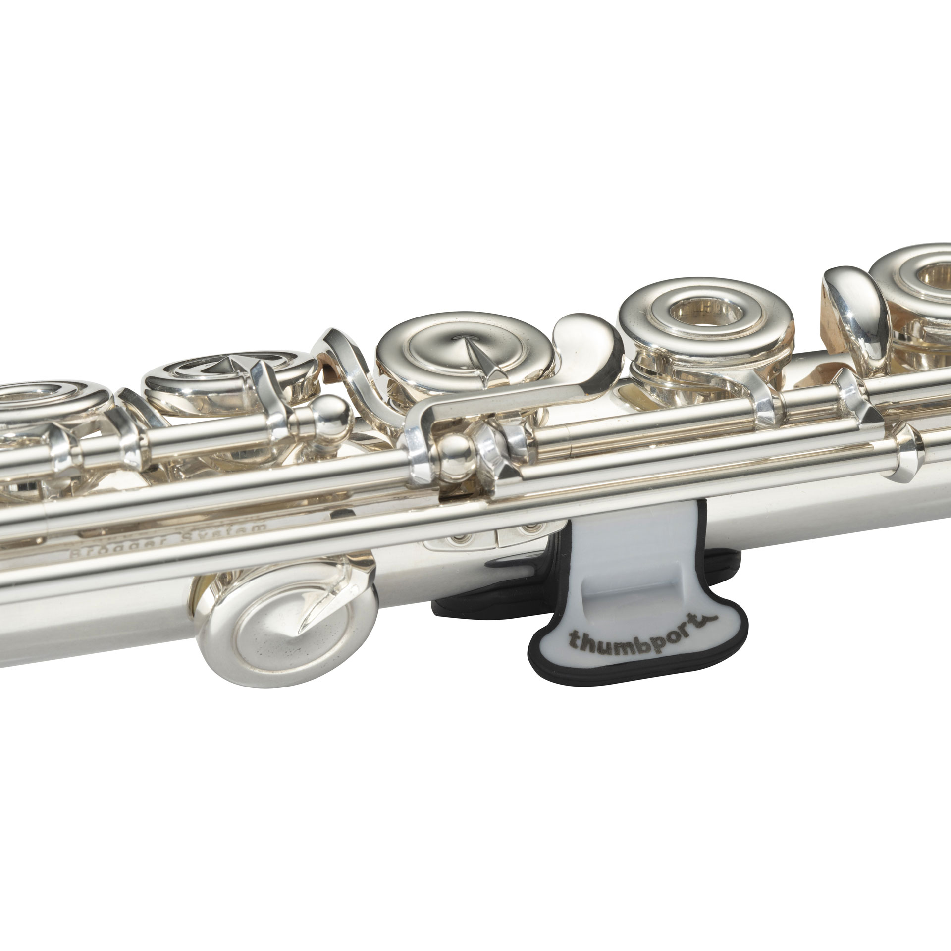 THUMBPORT II - Daumenstütze grau-schwarz, der Thumbport II hat einen niedrigeren Winkel für den Daumen. Es ist etwas dicker und steifer. Er berührt das Flötenrohr weniger und sein Verlängerungsarm ist etwas kürzer (wenn er an der Flöte befestigt ist, kann er für manche leichter in den Koffer passen). Außerdem hat das Ende der Verlängerung eine abgerundetere Form.
