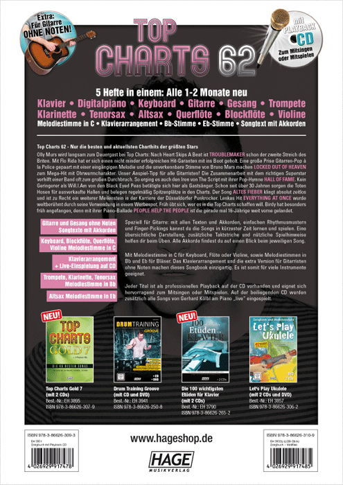 Top Charts 62 - Die besten und erfolgreichsten Titel aus den aktuellen Charts Olly Murs wird langsam zum Dauergast bei Top Charts: Nach Heart Skips A Beat ist TROUBLEMAKER schon der zweite Streich des Briten. Mit Flo Rida hat er sich einen nicht minder erfolgreichen Hit-Garanten mit ins Boot geholt. Eine große Prise Gitarren-Pop à la Police gepaart mit einer eingängigen Melodie und die unverkennbare Stimme von Bruno Mars machen LOCKED OUT OF HEAVEN zum Mega-Hit mit Ohrwurmcharakter. Unser Anspiel-Tipp für alle Gitarristen! Die Zusammenarbeit mit dem richtigen Superstar verhilft einer Band oft zum großen Durchbruch. So erging es auch den Iren von The Script mit ihrer Pop-Hymne HALL OF FAME. Kein Geringerer als Will.I.Am von den Black Eyed Peas betätigte sich hier als Gastsänger. Schon seit über 30 Jahren sorgen die Toten Hosen für ausverkaufte Hallen und belegen regelmäßig Spitzenplätze in den Charts. Der Song ALTES FIEBER klingt absolut zeitlos und ist zu Recht ein weiterer Meilenstein in der Karriere der Düsseldorfer Punkrocker. Lenkas Hit EVERYTHING AT ONCE wurde weltberühmt durch seine Verwendung in einem Werbespot. Früh übt sich, wer es in die Top Charts schaffen will. Birdy hat besonders früh angefangen, denn mit ihrer Piano-Ballade PEOPLE HELP THE PEOPLE ist die gerade mal 16-Jährige weit vorne gelandet. 5 Hefte in einem - Das universelle Songbook für viele Instrumente! Für Gitarre und Gesang ohne Noten: Songtexte mit Akkorden Mit allen Songtexten und Akkorden, einfachen Rhythmusmustern und Finger-Pickings kannst du die Songs in kürzester Zeit spielen und singen. Eine übersichtliche Darstellung, Taktstriche und nützliche Spielhinweise helfen dir beim Üben. Alle Akkorde findest du auf einen Blick beim jeweiligen Song. Für Klavier und Digitalpiano: Klavierarrangement Die Klavierarrangements wurden leicht bis mittelschwer arrangiert und sind so aufgebaut, dass sie optimal am Klavier klingen. Auf der beiliegenden CD wurden alle Songs von Gerhard Kölbl am Piano \"live\" eingespielt. Somit können alle Songs vor dem Spielen angehört werden und sind dadurch leichter zu spielen und zu erlernen. Für Keyboard und C-Instrumente: Melodiestimme in C Melodiestimme mit Akkorden, vollständigem Songtext, Soundvorschlägen, Tempohinweisen und Rhythmusangaben. Auch geeignet für Violine und Flöte. Für Trompete, Tenorhorn, Tenorsax und Klarinette: Melodiestimme in B Die Melodiestimme in B entspricht der Melodiestimme in C. Zum Mitspielen gibt es deshalb auf der CD zusätzliche Playbacks für B-Instrumente. Tipp: Wenn Du zusammen mit einem Keyboard spielen möchtest, so muss das Keyboard um 2 Halbtöne tiefer transponiert werden. Für Altsax und Es-Klarinette: Melodiestimme in Es Für Es-Instrumente gibt es eine extra Stimme in Es. Die über den Noten stehenden Akkorde sind klingend in C für Gitarre notiert. Tipp: Wenn Du zusammen mit einem Keyboard spielen möchtest, so muss das Keyboard um 2 Halbtöne tiefer transponiert werden. Professionelle Playbacks Zu jedem Song gibt es ein professionelles Playback auf der beiliegenden CD. Die Playbacks eignen sich hervorragend zum Mitsingen oder Mitspielen.