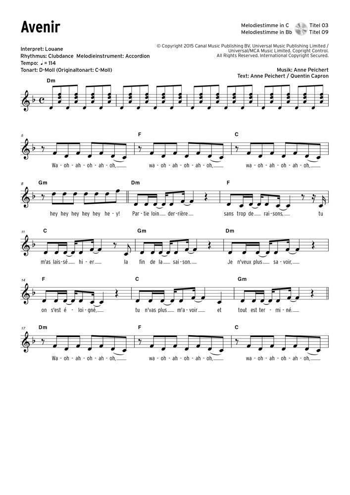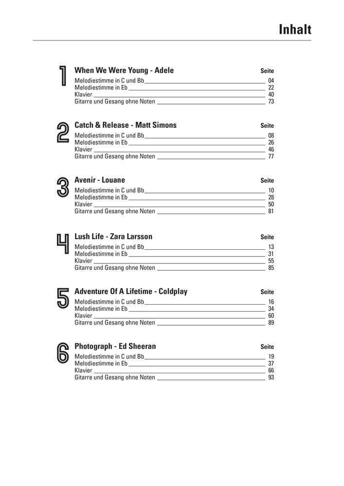 Top Charts 76 - Die besten und erfolgreichsten Hits aus den aktuellen Charts! Das Stimmwunder Adele ist die zurzeit unangefochtene Königin der Charts. Auch 'When We Were Young' reiht sich in die lange Reihe zeitloser Hits aus ihrer Feder. 'Lush Life' von Zara Larsson war der am meisten gespielte Titel in Schweden im Jahr 2015. Jetzt erobert Zara auch die internationalen Charts, denn nicht nur ihre Landsleute sind von dem Gute-Laune-Song begeistert. Dass die französische Sprache Hitpotenzial hat, erleben wir immer wieder. 'Avenir' von Louane bestätigt das: Mit seinem rhythmischen Piano Riff ist der Titel extrem eingängig und vermittelt eine tolle Stimmung. Während Coldplay früher eine astreine Gitarrenband waren, klingt ihre aktuelle Single 'Adventure Of A Lifetime' eher nach Disco und Tanzen. Der energiegeladene Song ist sehr melodiös und Beat-orientiert. 'Catch & Release' von Matt Simons wurde bereits 2014 als Akustik-Version veröffentlicht. Aber erst der Remix des tollen Songs im angesagten Deep-House Stil schaffte es in die Charts. Ähnlich wie Adele ist auch Ed Sheeran ein Hit-Garant. Bei seinem aktuellen Titel 'Photograph' stimmt auch wieder alles: eine gefühlvolle Melodie und ein Spannungsbogen, der sich zum Ende steigert. So macht der Song viel Spaß beim Spielen, egal mit welchem Instrument. 5 Hefte in einem - Das universelle Songbook für viele Instrumente! Für Gitarre und Gesang ohne Noten: Songtexte mit Akkorden Mit allen Songtexten und Akkorden, einfachen Rhythmusmustern und Finger-Pickings kannst du die Songs in kürzester Zeit spielen und singen. Eine übersichtliche Darstellung, Taktstriche und nützliche Spielhinweise helfen dir beim Üben. Alle Akkorde findest du auf einen Blick beim jeweiligen Song. Für Klavier und Digitalpiano: Klavierarrangement Die Klavierarrangements wurden leicht bis mittelschwer arrangiert und sind so aufgebaut, dass sie optimal am Klavier klingen. Auf der beiliegenden CD wurden alle Songs von Gerhard Kölbl am Piano \"live\" eingespielt. Somit können alle Songs vor dem Spielen angehört werden und sind dadurch leichter zu spielen und zu erlernen. Für Keyboard und C-Instrumente: Melodiestimme in C Melodiestimme mit Akkorden, vollständigem Songtext, Soundvorschlägen, Tempohinweisen und Rhythmusangaben. Auch geeignet für Violine und Flöte. Für Trompete, Tenorhorn, Tenorsax und Klarinette: Melodiestimme in B Die Melodiestimme in B entspricht der Melodiestimme in C. Zum Mitspielen gibt es deshalb auf der CD zusätzliche Playbacks für B-Instrumente. Tipp: Wenn Du zusammen mit einem Keyboard spielen möchtest, so muss das Keyboard um 2 Halbtöne tiefer transponiert werden. Für Altsax und Es-Klarinette: Melodiestimme in Es Für Es-Instrumente gibt es eine extra Stimme in Es. Die über den Noten stehenden Akkorde sind klingend in C für Gitarre notiert. Tipp: Wenn Du zusammen mit einem Keyboard spielen möchtest, so muss das Keyboard um 2 Halbtöne tiefer transponiert werden.