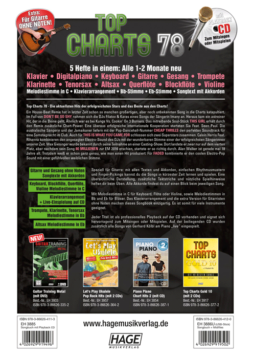Top Charts 78 - Die aktuellsten Hits der erfolgreichsten Stars und das Beste aus den Charts! Ein House-Beat Remix hat in letzter Zeit schon so manchen großartigen, aber noch unbekannten Song in die Charts katapultiert. Im Fall von Don't Be So Shy nahmen sich die DJs Filatov & Karas eines Songs der Sängerin Imany an. Heraus kam ein astreiner Hit, der in die Beine geht. Ähnlich war es bei Kungs Vs. Cookin' On 3 Burners. Das mitreißende Soul-Stück This Girl erhält durch den Remix zusätzliche Chart-Power. Eine überaus erfolgreiche internationale Kooperation starteten Sia Feat. Sean Paul. Die australische Sängerin und der Jamaikaner liefern mit der Pop-Dancehall-Nummer Cheap Thrills den perfekten Soundtrack für eine Samstagnacht im Club. Auch für This Is What You Came For schlossen sich zwei Superstars zusammen. Calvin Harris Feat. Rihanna kombinieren den angesagten Electro-Sound des DJs mit der wunderbaren Stimme einer der erfolgreichsten Sängerinnen unserer Zeit. Max Giesinger wurde bekannt durch seine Teilnahme an einer Casting-Show. Dort landete er zwar nur auf dem vierten Platz, aber nachdem sein Song 80 Millionen zur EM 2016 erschien, startete er so richtig durch. Alan Walker ist gerade mal 18 Jahre alt. Trotzdem weiß er schon ganz genau, wie man einen Hit produziert: Für Faded kombinierte er den coolen Electro-Pop Sound mit einer gefühlvollen weiblichen Stimme. 5 Hefte in einem - Das universelle Songbook für viele Instrumente! Für Gitarre und Gesang ohne Noten: Songtexte mit Akkorden Mit allen Songtexten und Akkorden, einfachen Rhythmusmustern und Finger-Pickings kannst du die Songs in kürzester Zeit spielen und singen. Eine übersichtliche Darstellung, Taktstriche und nützliche Spielhinweise helfen dir beim Üben. Alle Akkorde findest du auf einen Blick beim jeweiligen Song. Für Klavier und Digitalpiano: Klavierarrangement Die Klavierarrangements wurden leicht bis mittelschwer arrangiert und sind so aufgebaut, dass sie optimal am Klavier klingen. Auf der beiliegenden CD wurden alle Songs von Gerhard Kölbl am Piano \"live\" eingespielt. Somit können alle Songs vor dem Spielen angehört werden und sind dadurch leichter zu spielen und zu erlernen. Für Keyboard und C-Instrumente: Melodiestimme in C Melodiestimme mit Akkorden, vollständigem Songtext, Soundvorschlägen, Tempohinweisen und Rhythmusangaben. Auch geeignet für Violine und Flöte. Für Trompete, Tenorhorn, Tenorsax und Klarinette: Melodiestimme in B Die Melodiestimme in B entspricht der Melodiestimme in C. Zum Mitspielen gibt es deshalb auf der CD zusätzliche Playbacks für B-Instrumente. Tipp: Wenn Du zusammen mit einem Keyboard spielen möchtest, so muss das Keyboard um 2 Halbtöne tiefer transponiert werden. Für Altsax und Es-Klarinette: Melodiestimme in Es Für Es-Instrumente gibt es eine extra Stimme in Es. Die über den Noten stehenden Akkorde sind klingend in C für Gitarre notiert. Tipp: Wenn Du zusammen mit einem Keyboard spielen möchtest, so muss das Keyboard um 2 Halbtöne tiefer transponiert werden. Professionelle Playbacks Zu jedem Song gibt es ein professionelles Playback auf der beiliegenden CD. Die Playbacks eignen sich hervorragend zum Mitsingen oder Mitspielen. .