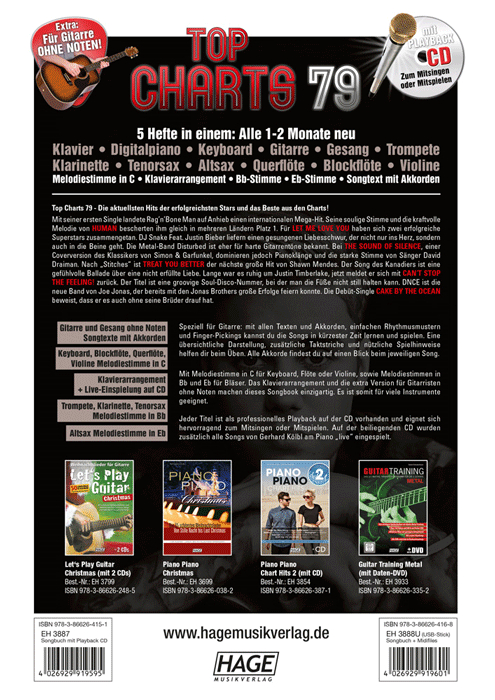Top Charts 79 - Die aktuellsten Hits der erfolgreichsten Stars und das Beste aus den Charts! Mit seiner ersten Single landete Rag'n'Bone Man auf Anhieb einen internationalen Mega-Hit. Seine soulige Stimme und die kraftvolle Melodie von Human bescherten ihm gleich in mehreren Ländern Platz 1. für Let Me Love You haben sich zwei erfolgreiche Superstars zusammengetan. DJ Snake Feat. Justin Bieber liefern einen gesungenen Liebesschwur, der nicht nur ins Herz, sondern auch in die Beine geht. Die Metal-Band Disturbed ist eher für harte Gitarrentöne bekannt. Bei The Sound Of Silence, einer Coverversion des Klassikers von Simon & Garfunkel, dominieren jedoch Pianoklänge und die starke Stimme von Sänger David Draiman. Nach Stitches\" ist Treat You Better der nächste große Hit von Shawn Mendes. Der Song des Kanadiers ist eine gefühlvolle Ballade über eine nicht erfüllte Liebe. Lange war es ruhig um Justin Timberlake, jetzt meldet er sich mit Can't Stop the Feeling! zurück. Der Titel ist eine groovige Soul-Disco-Nummer, bei der man die Füße nicht still halten kann. DNCE ist die neue Band von Joe Jonas, der bereits mit den Jonas Brothers große Erfolge feiern konnte. Die Debüt-Single Cake By The Ocean beweist, dass er es auch ohne seine Brüder drauf hat. 5 Hefte in einem - Das universelle Songbook für viele Instrumente! Für Gitarre und Gesang ohne Noten: Songtexte mit Akkorden Mit allen Songtexten und Akkorden, einfachen Rhythmusmustern und Finger-Pickings kannst du die Songs in kürzester Zeit spielen und singen. Eine übersichtliche Darstellung, Taktstriche und nützliche Spielhinweise helfen dir beim Üben. Alle Akkorde findest du auf einen Blick beim jeweiligen Song. Für Klavier und Digitalpiano: Klavierarrangement Die Klavierarrangements wurden leicht bis mittelschwer arrangiert und sind so aufgebaut, dass sie optimal am Klavier klingen. Auf der beiliegenden CD wurden alle Songs von Gerhard Kölbl am Piano \"live\" eingespielt. Somit können alle Songs vor dem Spielen angehört werden und sind dadurch leichter zu spielen und zu erlernen. Für Keyboard und C-Instrumente: Melodiestimme in C Melodiestimme mit Akkorden, vollständigem Songtext, Soundvorschlägen, Tempohinweisen und Rhythmusangaben. Auch geeignet für Violine und Flöte. Für Trompete, Tenorhorn, Tenorsax und Klarinette: Melodiestimme in B Die Melodiestimme in B entspricht der Melodiestimme in C. Zum Mitspielen gibt es deshalb auf der CD zusätzliche Playbacks für B-Instrumente. Tipp: Wenn Du zusammen mit einem Keyboard spielen möchtest, so muss das Keyboard um 2 Halbtöne tiefer transponiert werden. Für Altsax und Es-Klarinette: Melodiestimme in Es Für Es-Instrumente gibt es eine extra Stimme in Es. Die über den Noten stehenden Akkorde sind klingend in C für Gitarre notiert. Tipp: Wenn Du zusammen mit einem Keyboard spielen möchtest, so muss das Keyboard um 2 Halbtöne tiefer transponiert werden. Professionelle Playbacks Zu jedem Song gibt es ein professionelles Playback auf der beiliegenden CD. Die Playbacks eignen sich hervorragend zum Mitsingen oder Mitspielen.