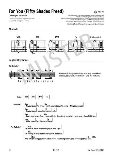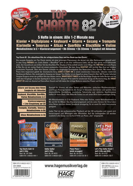Top Charts 82 - Die aktuellsten Hits der erfolgreichsten Stars und das Beste aus den Charts! Die neueste Ausgabe von Top Charts startet mit einer groovigen Popnummer, die derzeit von allen Radiosendern gespielt wird. In dem Song Friends von Justin Bieber + BloodPop® geht es um eine verflossene Liebe, mit der man gerne noch befreundet wäre. Der Soundtrack zum dritten Teil des Kinofilms Fifty Shades of Grey enthält wieder einen Mega-Hit. For You von Liam Payne & Rita Ora ist ein cooles Duett mit einem pumpenden Dancebeat. Bei dem Song Rooftop trifft leichter Neo-Soul auf modern produzierte Popmusik. Über dem Ganzen schwebt die eingängige Gesangslinie des Newcomers Nico Santos. Mit einem Solo-Piano-Intro beginnend gipfelt der dramatische Song Leave A Light On in einem emotionalen Crescendo, inklusive modernen Synthsound-Refrain. Der eindringliche Gesang von Sänger Tom Walker ist ein Appell an einen Freund in Not. Mit Thunder lieferten Imagine Dragons einen der größten Hits des letzten Jahres. Whatever It Takes ist die Nachfolge-Single der Indie-Rocker und sie steht dem Vorgänger in Sachen Spielspaß in nichts nach. Sängerin P!nk steht für emotionale Songs mit Rockeinschlag. Bei What About Us setzt sie diesmal auf Dancefloor-Sound und hält dabei die richtige Balance zwischen Power und Gefühl. 5 Hefte in einem - Das universelle Songbook für viele Instrumente! Für Gitarre und Gesang ohne Noten: Songtexte mit Akkorden Mit allen Songtexten und Akkorden, einfachen Rhythmusmustern und Finger-Pickings kannst du die Songs in kürzester Zeit spielen und singen. Eine übersichtliche Darstellung, Taktstriche und nützliche Spielhinweise helfen dir beim Üben. Alle Akkorde findest du auf einen Blick beim jeweiligen Song. Für Klavier und Digitalpiano: Klavierarrangement Die Klavierarrangements wurden leicht bis mittelschwer arrangiert und sind so aufgebaut, dass sie optimal am Klavier klingen. Auf der beiliegenden CD wurden alle Songs von Gerhard Kölbl am Piano \"live\" eingespielt. Somit können alle Songs vor dem Spielen angehört werden und sind dadurch leichter zu spielen und zu erlernen. Für Keyboard und C-Instrumente: Melodiestimme in C Melodiestimme mit Akkorden, vollständigem Songtext, Soundvorschlägen, Tempohinweisen und Rhythmusangaben. Auch geeignet für Violine und Flöte. Für Trompete, Tenorhorn, Tenorsax und Klarinette: Melodiestimme in B Die Melodiestimme in B entspricht der Melodiestimme in C. Zum Mitspielen gibt es deshalb auf der CD zusätzliche Playbacks für B-Instrumente. Tipp: Wenn Du zusammen mit einem Keyboard spielen möchtest, so muss das Keyboard um 2 Halbtöne tiefer transponiert werden. Für Altsax und Es-Klarinette: Melodiestimme in Es Für Es-Instrumente gibt es eine extra Stimme in Es. Die über den Noten stehenden Akkorde sind klingend in C für Gitarre notiert. Tipp: Wenn Du zusammen mit einem Keyboard spielen möchtest, so muss das Keyboard um 2 Halbtöne tiefer transponiert werden. Professionelle Playbacks Zu jedem Song gibt es ein professionelles Playback auf der beiliegenden CD. Die Playbacks eignen sich hervorragend zum Mitsingen oder Mitspielen.