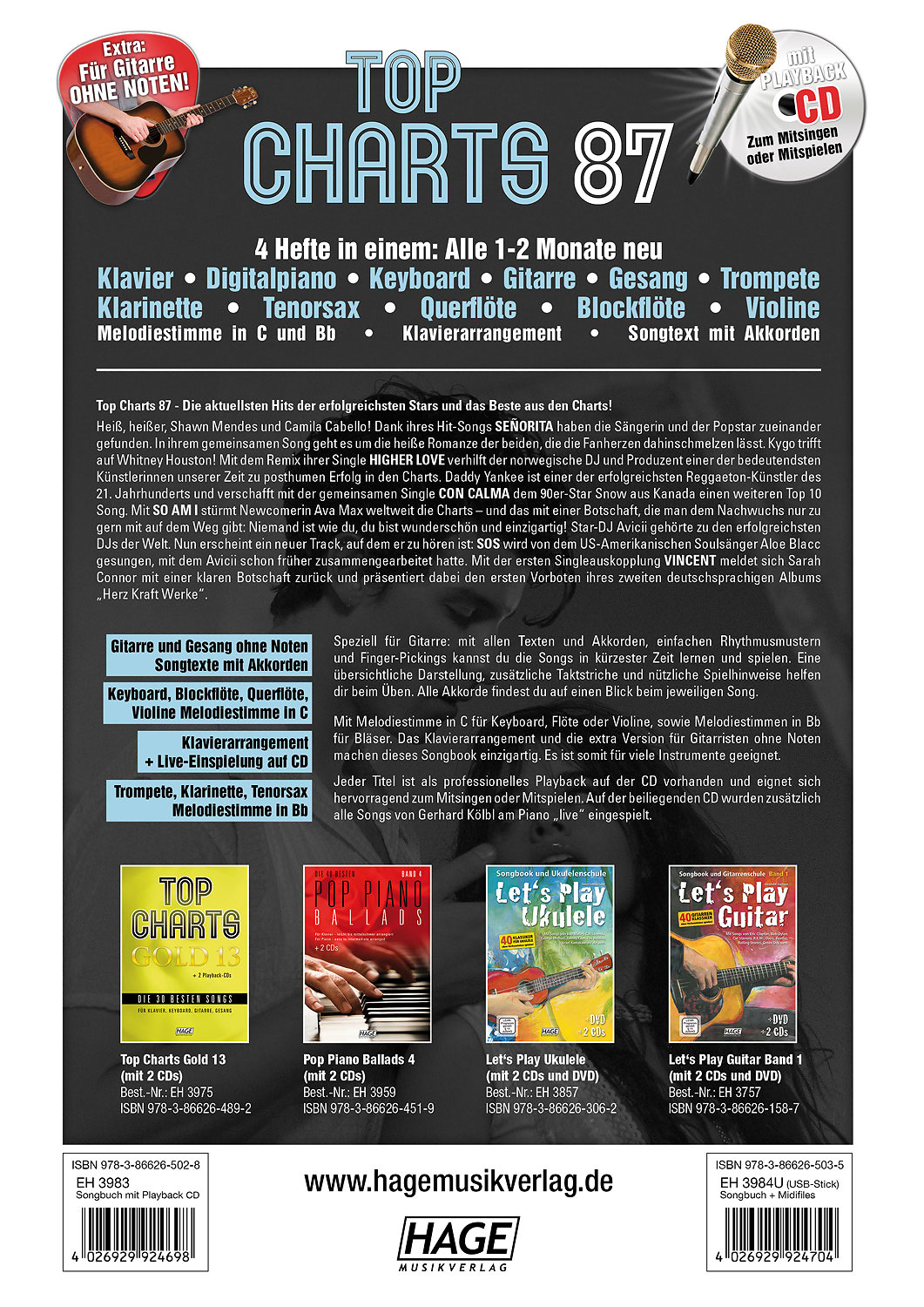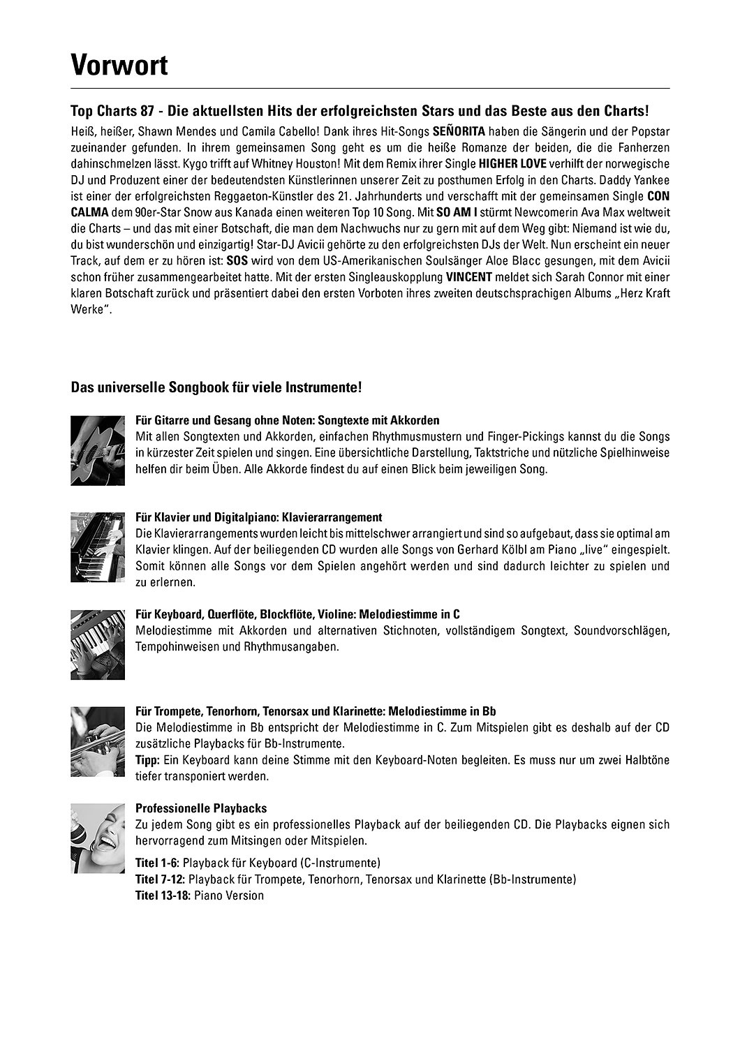 Top Charts 87 - Die aktuellsten Hits der erfolgreichsten Stars und das Beste aus den Charts! Heiß, heißer, Shawn Mendes und Camila Cabello! Dank ihres Hit-Songs SEÑORITA haben die Sängerin und der Popstar zueinander gefunden. In ihrem gemeinsamen Song geht es um die heiße Romanze der beiden, die die Fanherzen dahinschmelzen lässt. Kygo trifft auf Whitney Houston! Mit dem Remix ihrer Single HIGHER LOVE verhilft der norwegische DJ und Produzent einer der bedeutendsten Künstlerinnen unserer Zeit zu posthumen Erfolg in den Charts. Daddy Yankee ist einer der erfolgreichsten Reggaeton-Künstler des 21. Jahrhunderts und verschafft mit der gemeinsamen Single CON CALMA dem 90er-Star Snow aus Kanada einen weiteren Top 10 Song. Mit SO AM I stürmt Newcomerin Ava Max weltweit die Charts - und das mit einer Botschaft, die man dem Nachwuchs nur zu gern mit auf dem Weg gibt: Niemand ist wie du, du bist wunderschön und einzigartig! Star-DJ Avicii gehörte zu den erfolgreichsten DJs der Welt. Nun erscheint ein neuer Track, auf dem er zu hören ist: SOS wird von dem US-Amerikanischen Soulsänger Aloe Blacc gesungen, mit dem Avicii schon früher zusammengearbeitet hatte. Mit der ersten Singleauskopplung VINCENT meldet sich Sarah Connor mit einer klaren Botschaft zurück und präsentiert dabei den ersten Vorboten ihres zweiten deutschsprachigen Albums Herz Kraft Werke. 4 Hefte in einem - Das universelle Songbook für viele Instrumente! Für Gitarre und Gesang ohne Noten: Songtexte mit Akkorden Mit allen Songtexten und Akkorden, einfachen Rhythmusmustern und Finger-Pickings kannst du die Songs in kürzester Zeit spielen und singen. Eine übersichtliche Darstellung, Taktstriche und nützliche Spielhinweise helfen dir beim Üben. Alle Akkorde findest du auf einen Blick beim jeweiligen Song. Für Klavier und Digitalpiano: Klavierarrangement Die Klavierarrangements wurden leicht bis mittelschwer arrangiert und sind so aufgebaut, dass sie optimal am Klavier klingen. Auf der beiliegenden CD wurden alle Songs von Gerhard Kölbl am Piano \"live\" eingespielt. Somit können alle Songs vor dem Spielen angehört werden und sind dadurch leichter zu spielen und zu erlernen. Für Keyboard und C-Instrumente: Melodiestimme in C Melodiestimme mit Akkorden, vollständigem Songtext, Soundvorschlägen, Tempohinweisen und Rhythmusangaben. Auch geeignet für Violine und Flöte. Für Trompete, Tenorhorn, Tenorsax und Klarinette: Melodiestimme in B Die Melodiestimme in B entspricht der Melodiestimme in C. Zum Mitspielen gibt es deshalb auf der CD zusätzliche Playbacks für B-Instrumente. Tipp: Wenn Du zusammen mit einem Keyboard spielen möchtest, so muss das Keyboard um 2 Halbtöne tiefer transponiert werden. werden.