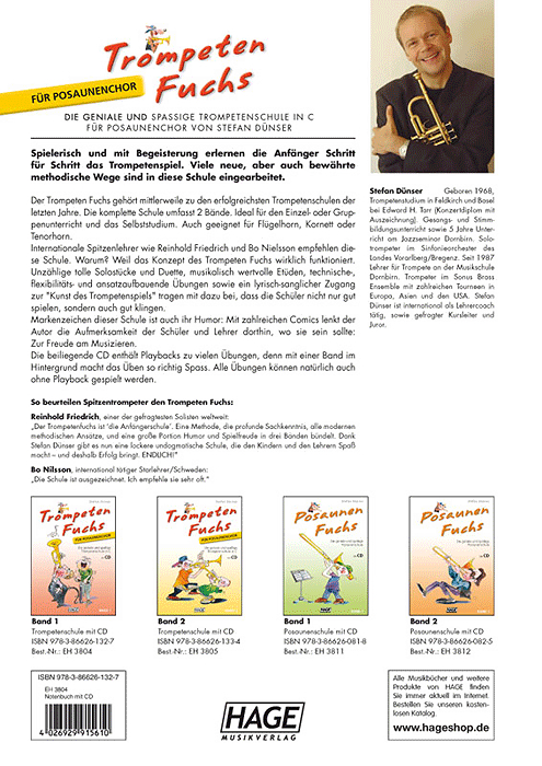 Trompeten Fuchs, Band 1 - Trompetenschule mit CD Spielerisch und mit Begeisterung erlernen die Anfänger Schritt für Schritt das Trompetenspiel. Viele neue, aber auch bewährte methodische Wege sind in diese Schule eingearbeitet. Internationale Spitzenlehrer wie Reinhold Friedrich und Bo Nielsson empfehlen diese Schule. Warum? Weil das Konzept des Trompeten Fuchs wirklich funktioniert. Unzählige tolle Solostücke und Duette von Klassik bis Pop, methodisch wertvolle Etüden, technische-, flexibiltäts- und ansatzaufbauende Übungen sowie ein lyrischsanglicher Zugang zur \"Kunst des Trompetenspiels\" tragen mit dazu bei, dass die Schüler nicht nur gut spielen, sondern auch gut klingen. Markenzeichen dieser Schule ist auch ihr Humor: Mit zahlreichen Comics lenkt der Autor die Aufmerksamkeit der Schüler und Lehrer dorthin, wo sie sein sollte: Zur Freude am Musizieren. Die beiliegende CD enthält lustige Playbacks zu vielen Übungen, denn mit einer Band im Hintergrund macht das Üben so richtig Spass. Alle Übungen können natürlich auch ohne Playback gespielt werden. Der Trompeten Fuchs gehört mittlerweile zu den erfolgreichsten Trompetenschulen der letzten Jahre. Die komplette Schule umfasst 3 Lehrbücher, Band 1 und 2 mit CD, Band 3 ohne CD. Geeignet für den Einzel- und Gruppenunterricht für Trompete, Flügelhorn, Kornett und Tenorhorn.