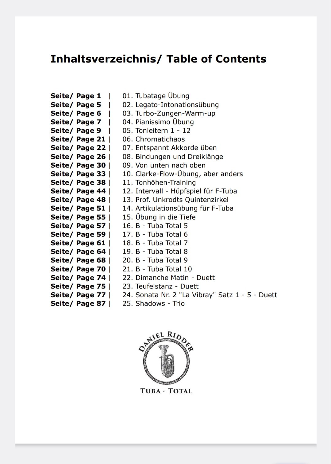 Tuba - Total Band 2 - Übungen für jeden Tag. Vier Jahre nach dem großen Erfolg von Tuba - Total Band 1 bringe ich nun Tuba - Total Band 2 heraus - die sinnvolle Weiterführung der Reihe. Mit neuen Übungen für alle Übungsbereiche des täglichen Tubaspiels. Diesmal habe ich bewusst mehr Duette und sogar ein Trio ins Heft aufgenommen, um im Unterricht für mehr Abwechslung zu sorgen. Dank der tollen Unterstützung weiterer renommierter Tubisten aus aller Welt, ist es mir gelungen dieses Heft fertigzustellen. Vielen Dank an alle Mitwirkenden: Rupert Gratz, Eduardo Nogueroles, Ola Ness, Tim Olt, Joe Pinkl, Norbert Weigand, Ludwig Beck, Bernd van Echelpoel, Jens Uhlig, Raimund Lippok, Frederik Bauersfeld, Ben Vasko, Micael Cortone d'Amore, Clayton Maddox und meiner lieben Frau für das entgegengebrachte Vertrauen und die tatkräftige Unterstützung.