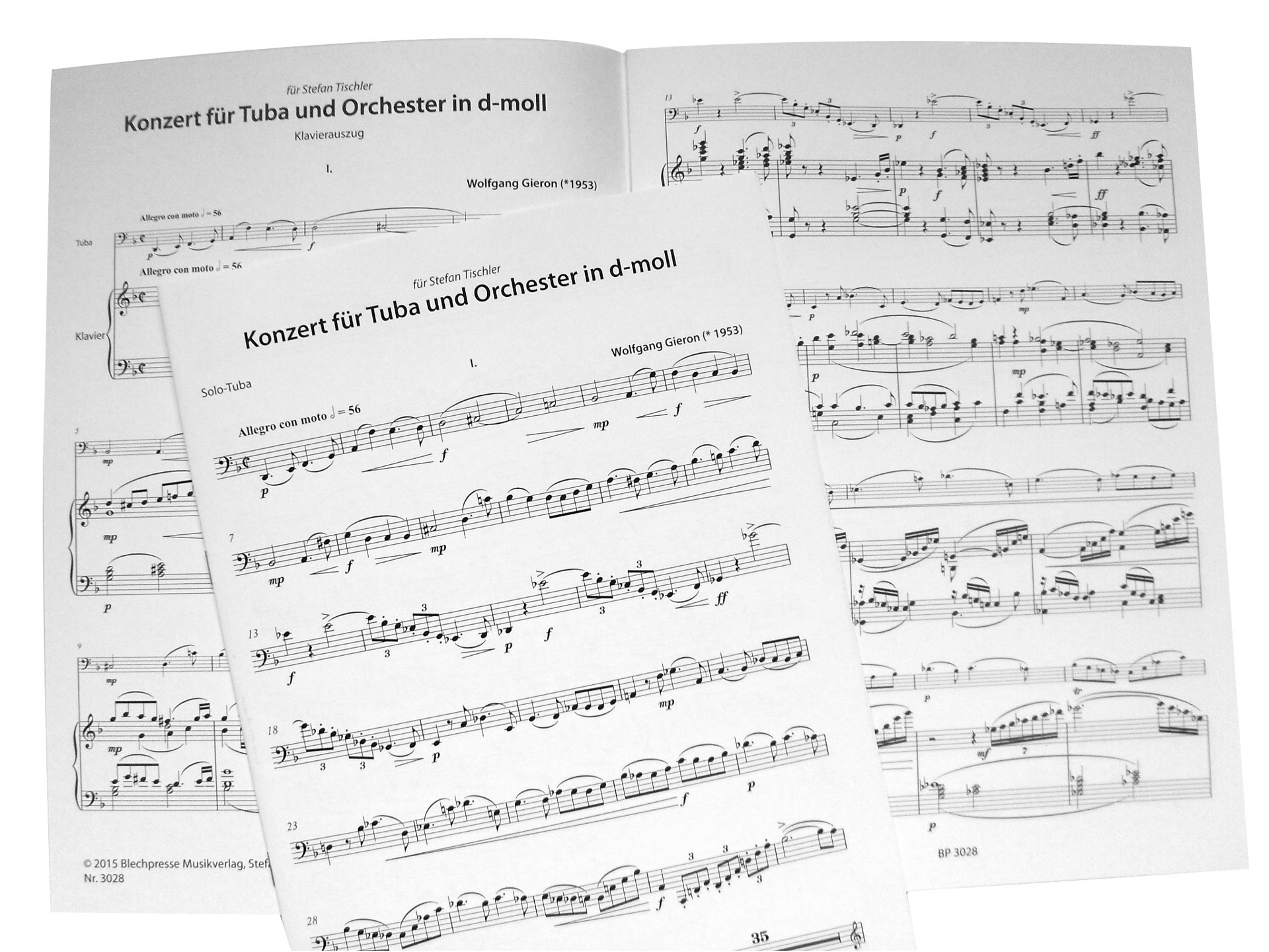 Wolfgang Gieron: Konzert in d-moll für Tuba und Orchester, ein umfangreiches romantisches Konzert im Stil des jungen Richard Strauss, komponiert für Stefan Tischler, den Tubisten des Sinfonieorchesters des Bayerischen Rundfunks. Diese Ausgabe beinhaltet die Solostimme und den Klavierauszug. Das Orchestermaterial kann man auf Anfrage leihen. Ausstattung: Solostimme (8 Seiten) Klaiverstimme (31 Seiten)